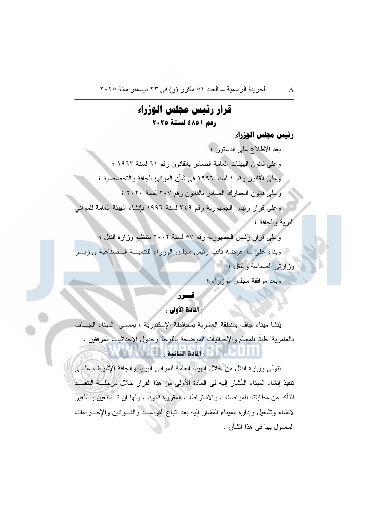 نشرت الجريدة الرسمية في العدد 51 مكرر "و"، بتاريخ 23 ديسمبر 2025، قرار رئيس مجلس الوزراء، رقم 4851 لسنة 2025، بشأن إنشاء ميناء جاف بمنطقة العامرية بمحافظة الإسكندرية.