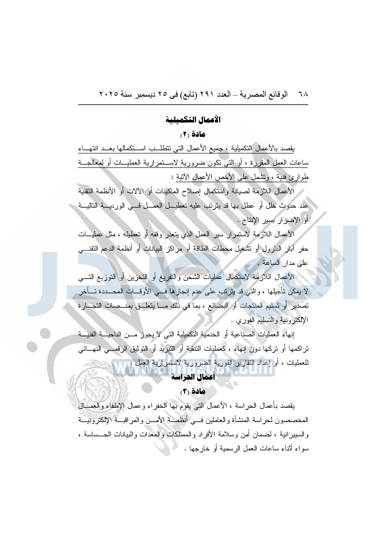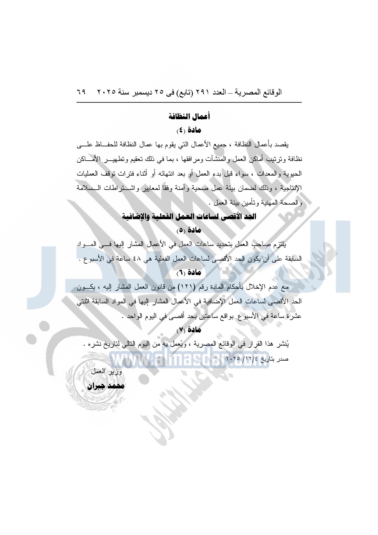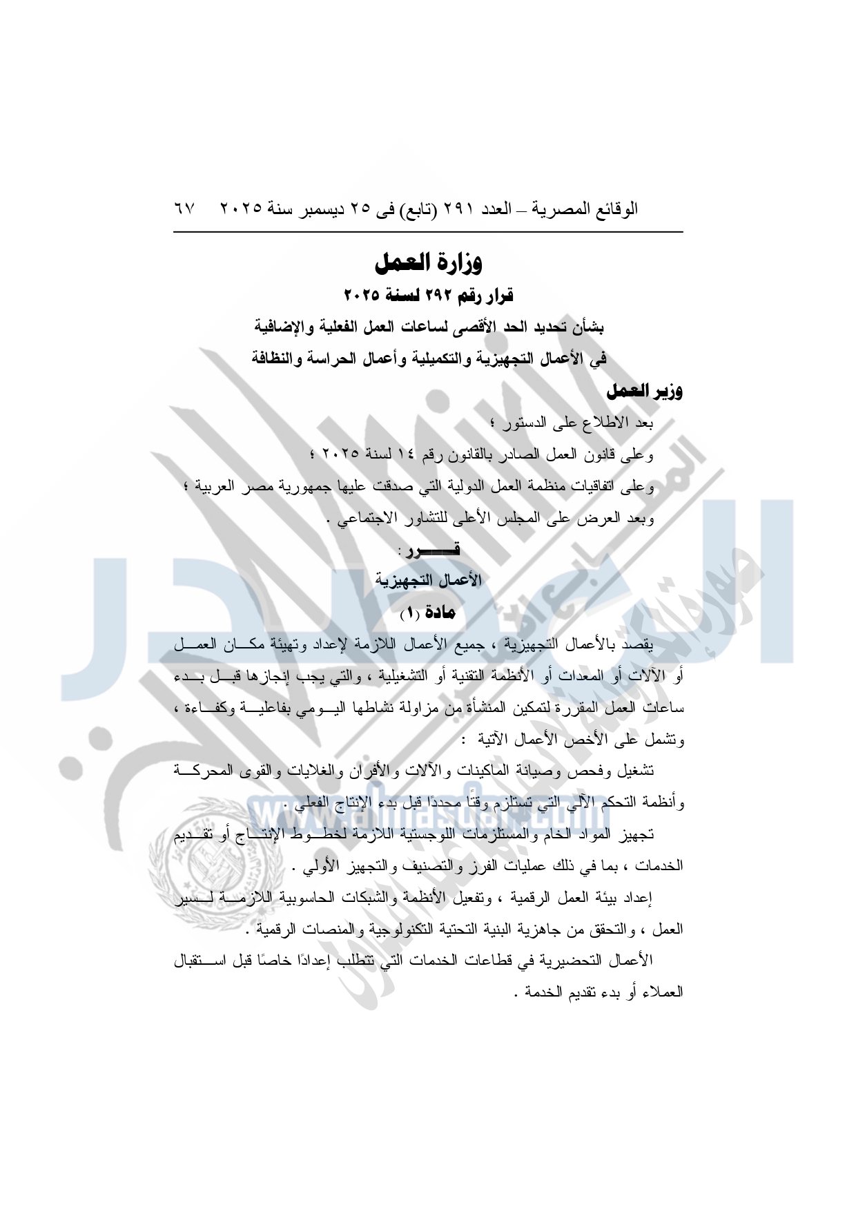 نشرت الوقائع المصرية، في العدد 290 "تابع"، بتاريخ 25 ديسمبر 2025، قرار وزارة العمل، رقم 292 لسنة 2025، بشأن تحديد الحد الأقصى لساعات العمل الفعلية والإضافية في الأعمال التجهيزية والتكميلية وأعمال الحراسة والنظافة.