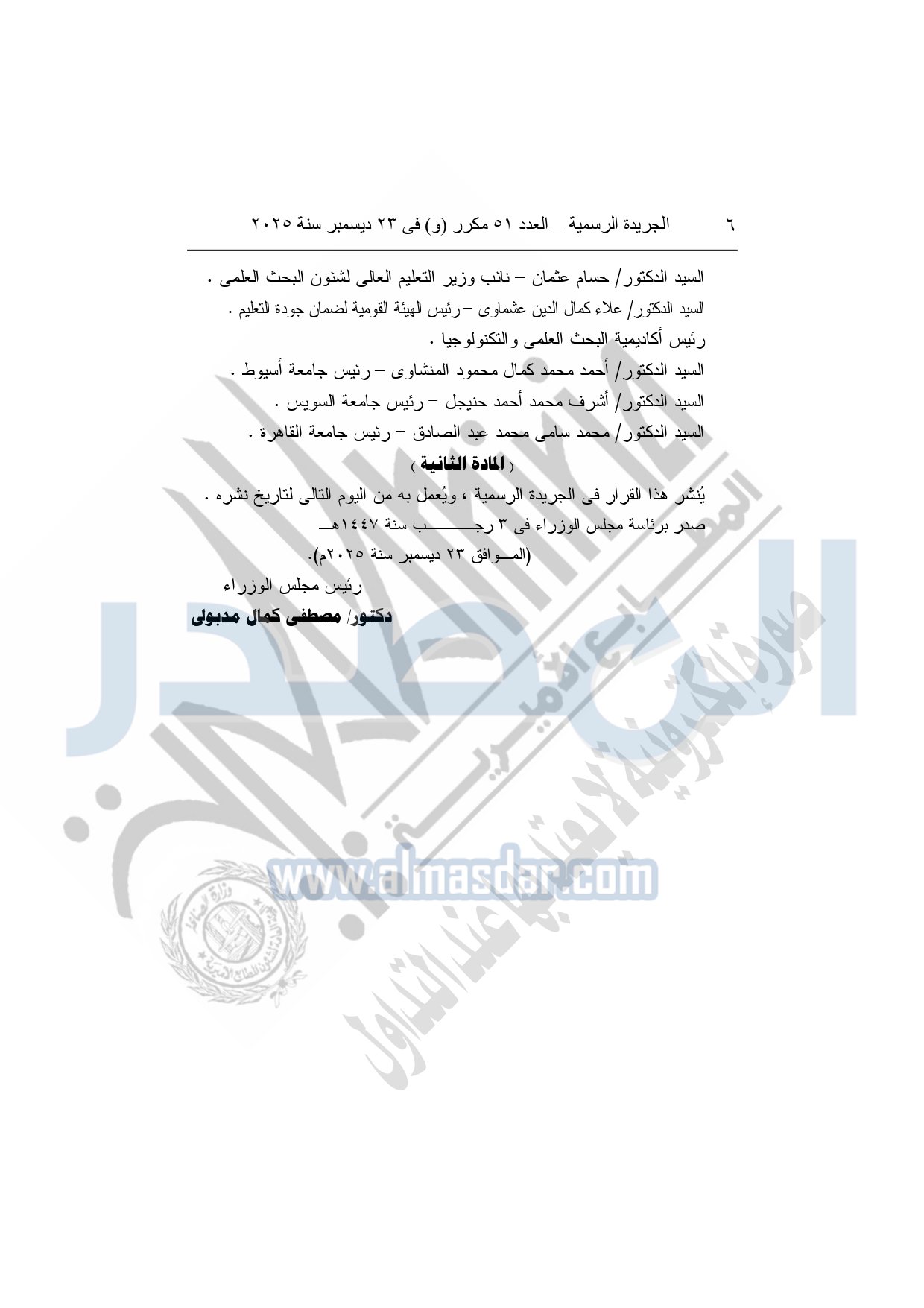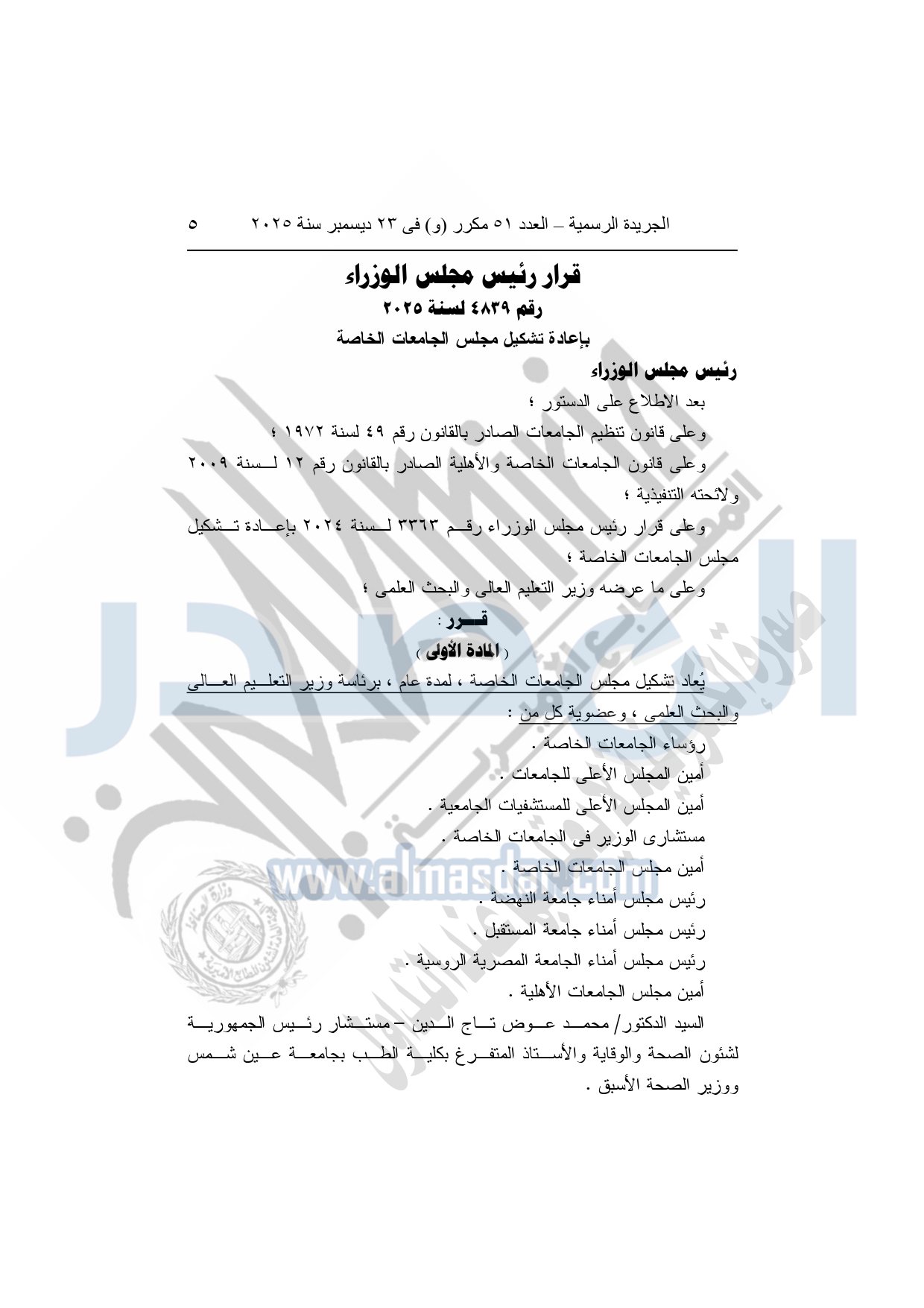 كما نشرت الجريدة الرسمية، في العدد 51 مكرر "و"، بتاريخ 23 ديسمبر 2025، قرار رئيس مجلس الوزراء، رقم 4839 لسنة 2025، بشأن إعادة تشكيل مجلس الجامعات الخاصة.