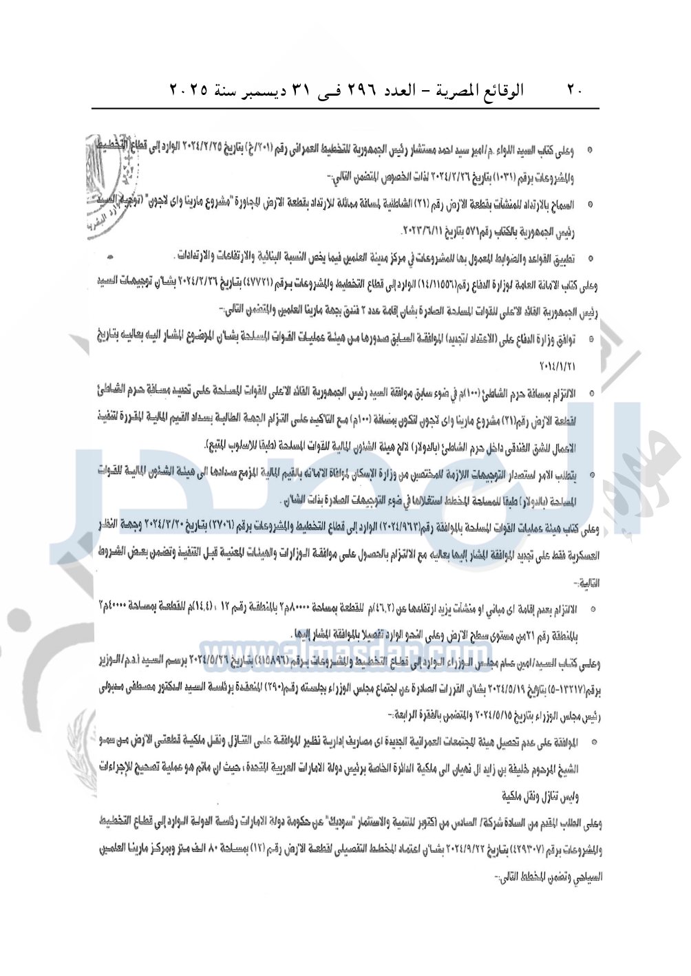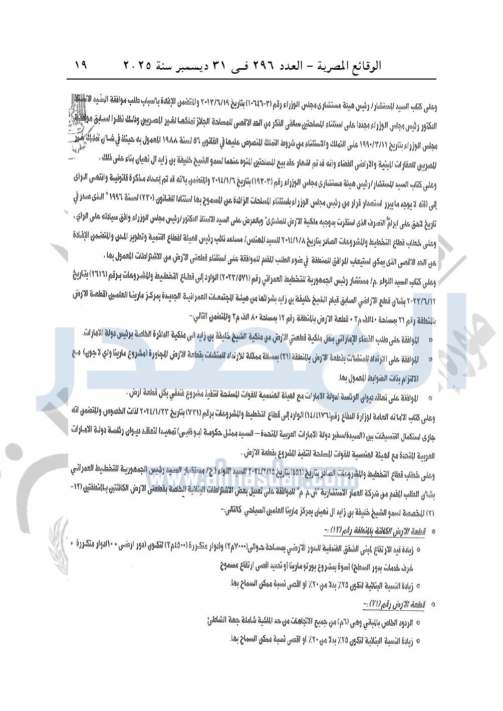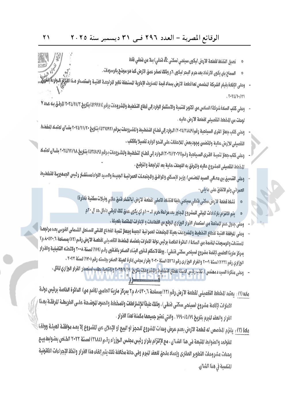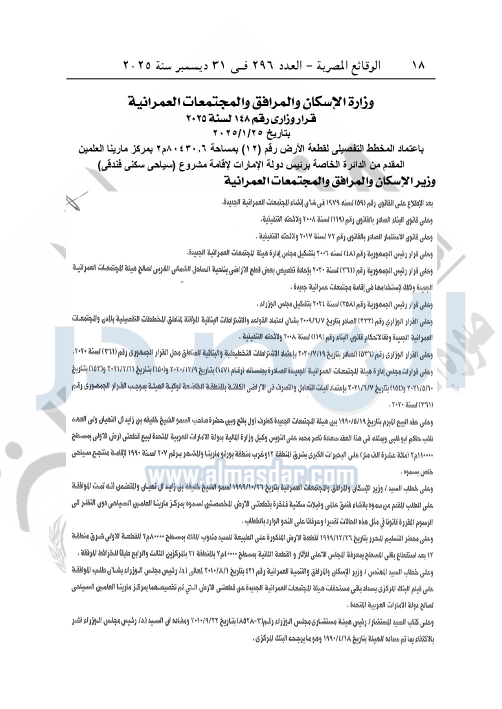 نشرت الوقائع المصرية في العدد 296 الصادر في 31 ديسمبر سنة 2025، وزارة الإسكان والمرافق والمجتمعات العمرانية، قرار وزارى رقم 148 لسنة 2025 بتاريخ 25-1-2025، باعتماد المخطط التفصيلي لقطعة الأرض رقم "12" بمساحة 80430.6 م2 بمركز مارينا العلمين المقدم من الدائرة الخاصة برئيس دولة الإمارات لإقامة مشروع "سياحي سكني فندقي".