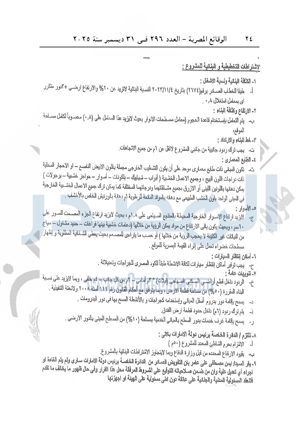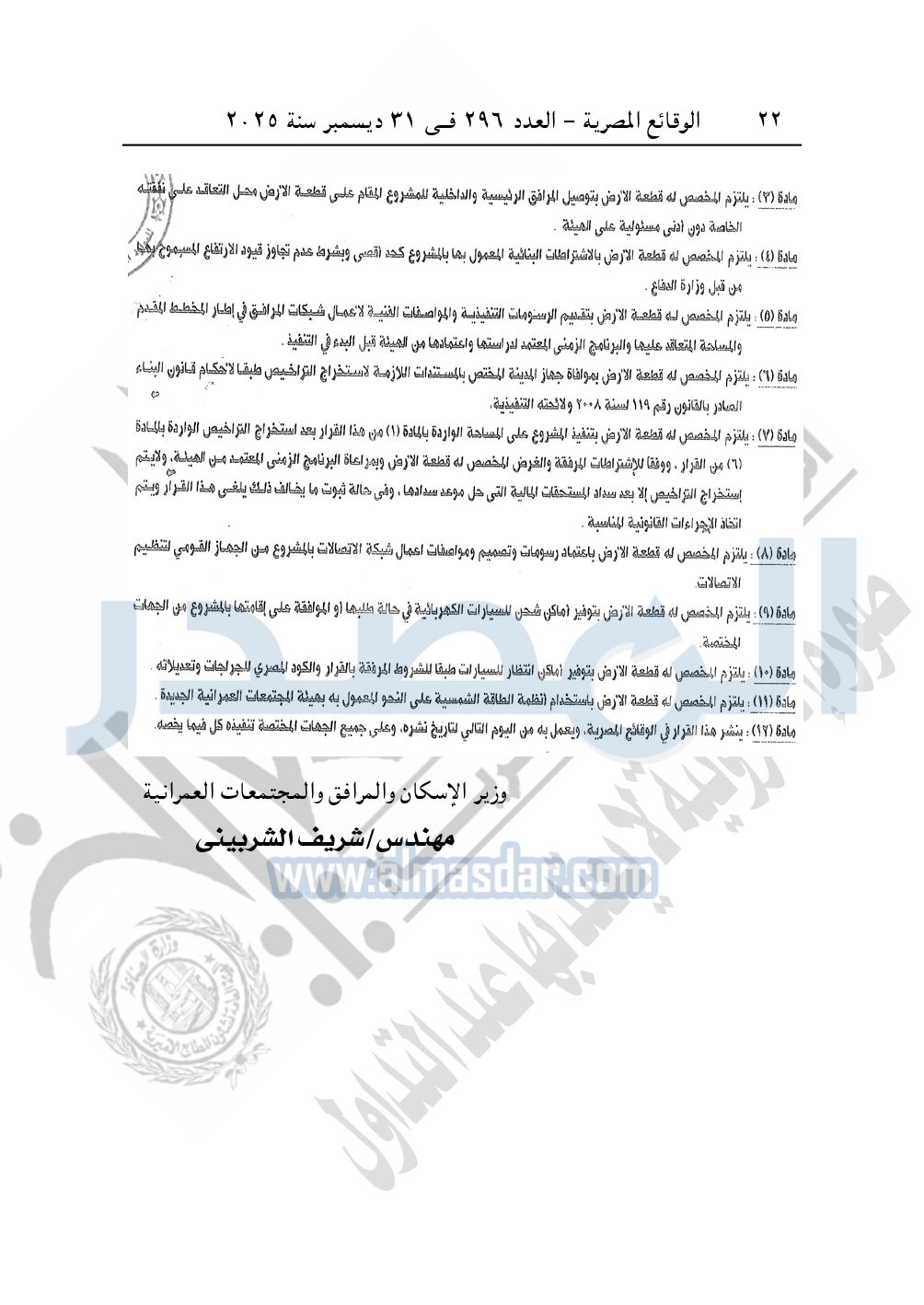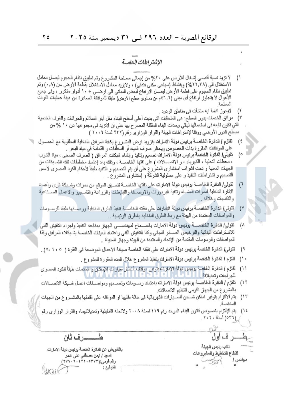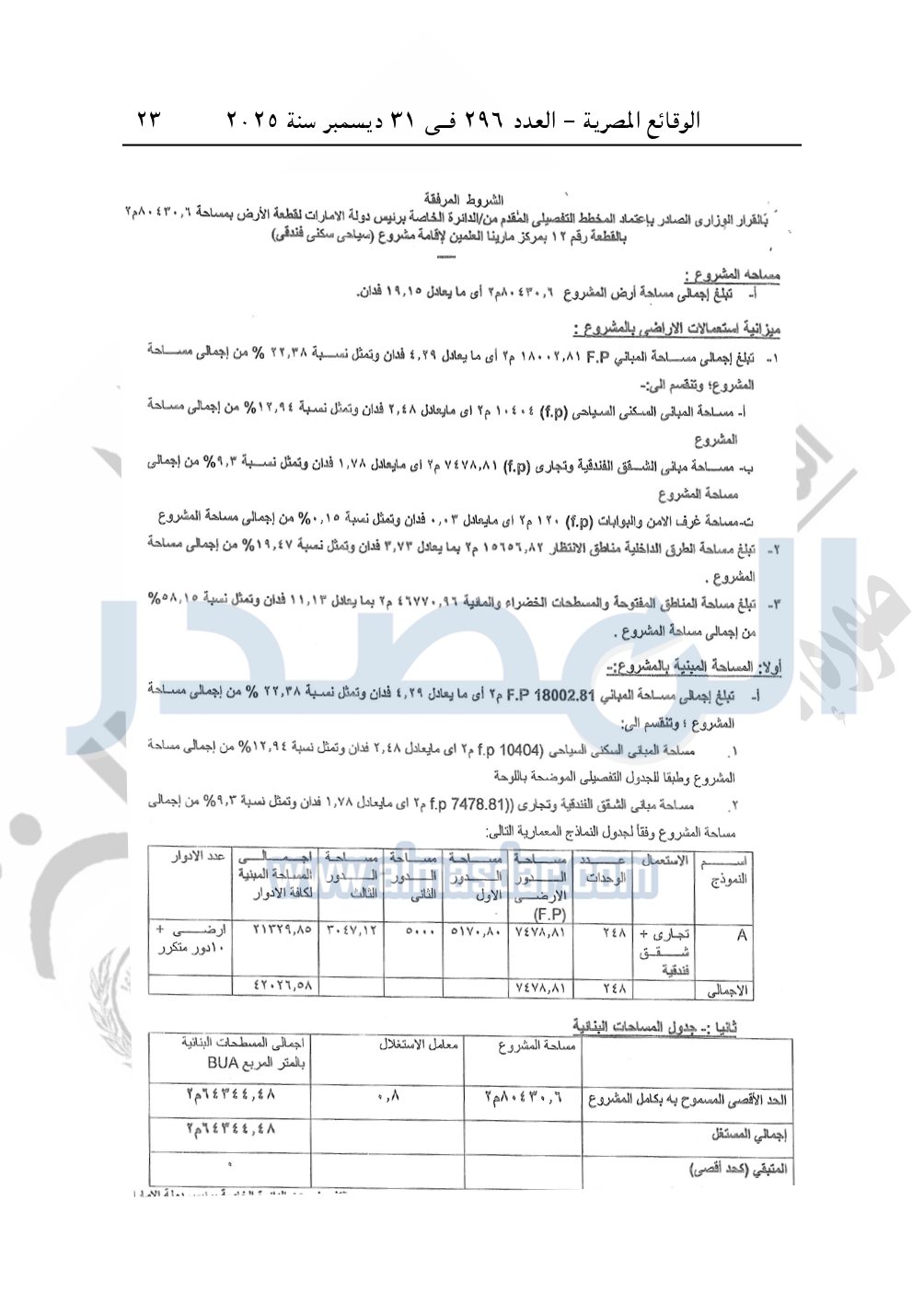 نشرت الوقائع المصرية في العدد 296 الصادر في 31 ديسمبر سنة 2025، وزارة الإسكان والمرافق والمجتمعات العمرانية، قرار وزارى رقم 148 لسنة 2025 بتاريخ 25-1-2025، باعتماد المخطط التفصيلي لقطعة الأرض رقم "12" بمساحة 80430.6 م2 بمركز مارينا العلمين المقدم من الدائرة الخاصة برئيس دولة الإمارات لإقامة مشروع "سياحي سكني فندقي".