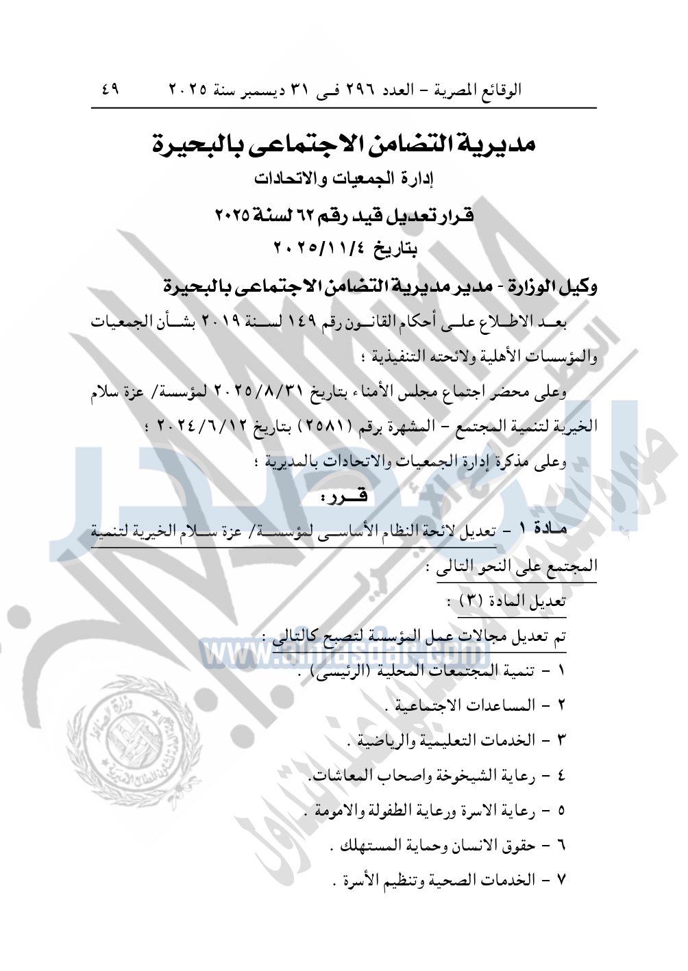 نشرت الوقائع المصرية في العدد 296 الصادر في 31 ديسمبر سنة 2025، مديرية التضامن الاجتماعي بالبحيرة، إدارة الجمعيات والاتحادات، قرار تعديل قيد رقم 62 لسنة 2025، بتاريخ 4-11-2025، بشأن تعديل لائحة النظام الأساسي لمؤسسة / عزة سلام الخيرية لتنمية المجتمع.