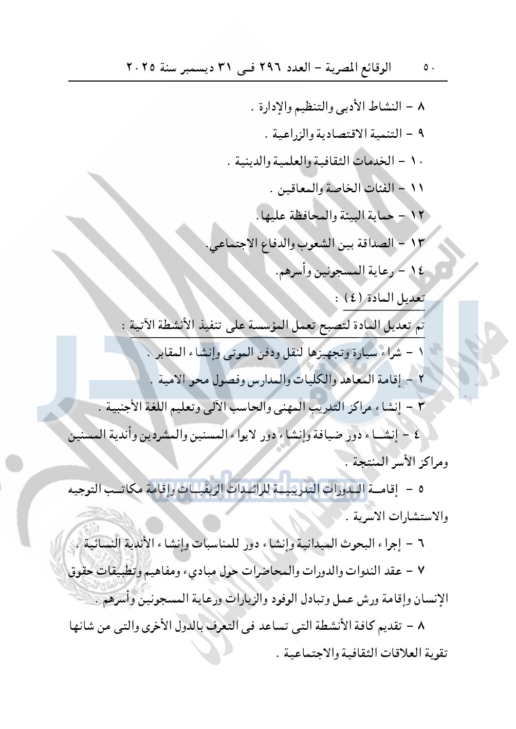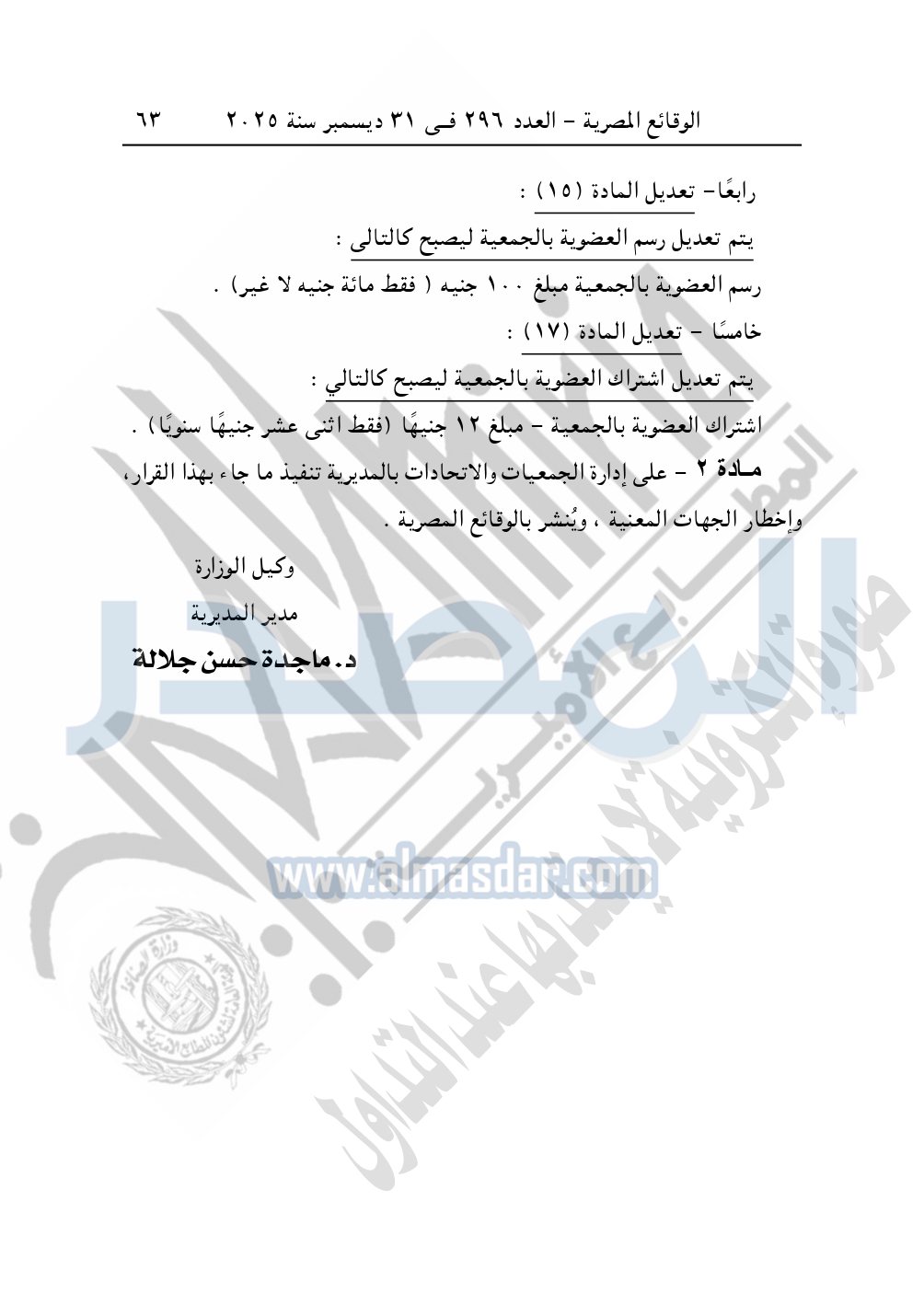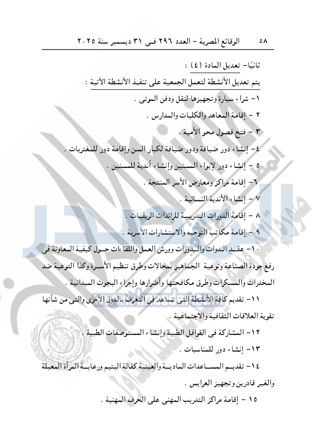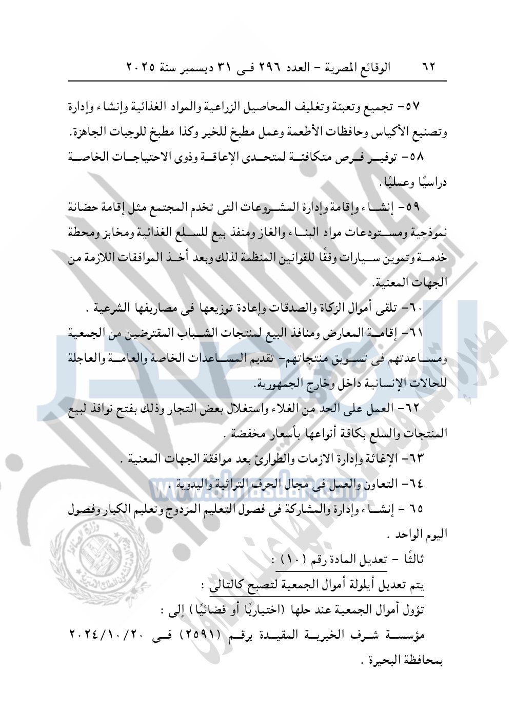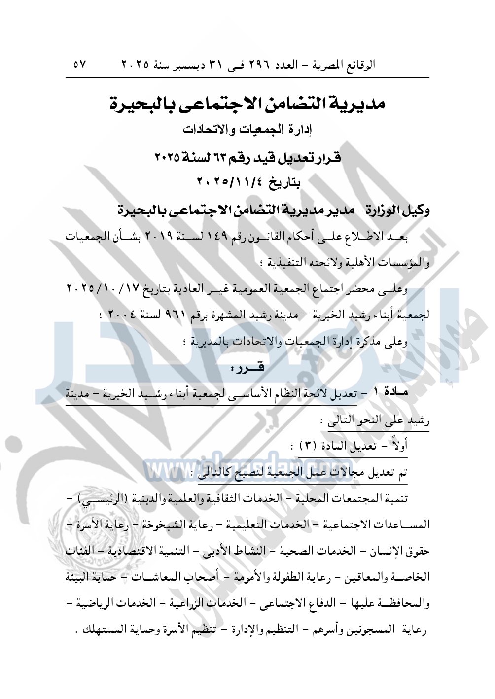 كما نشرت الوقائع المصرية في العدد 296 الصادر في 31 ديسمبر سنة 2025، مديرية التضامن الاجتماعي بالبحيرة، إدارة الجمعيات والاتحادات، قرار تعديل قيد رقم 63 لسنة 2025 بتاريخ 4-11-2025، بشأن تعديل لائحة النظام الأساسي لجمعية أبناء رشيد الخيرية – مدينة رشيد.