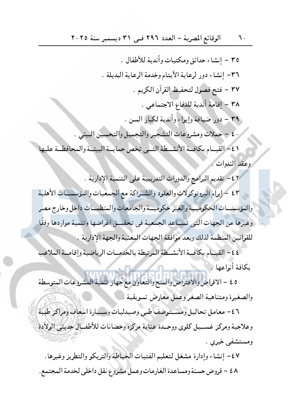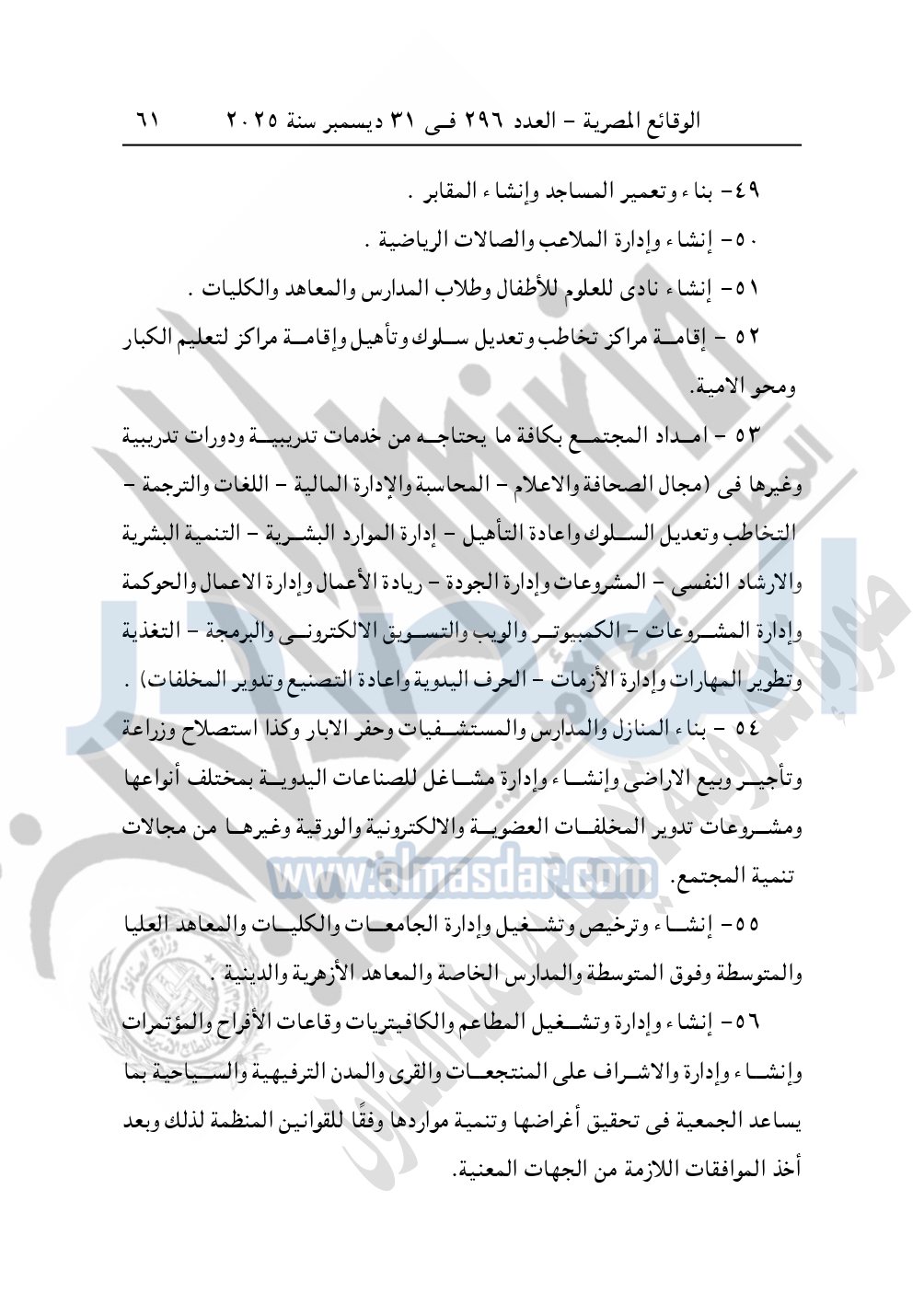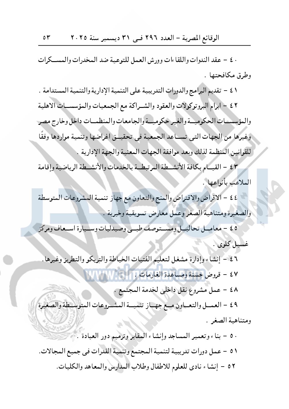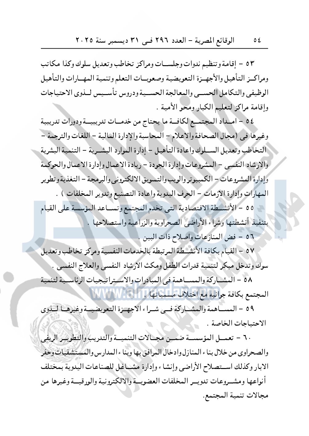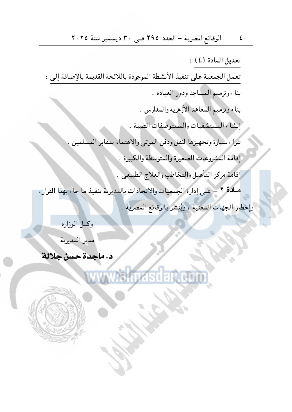 كما نشرت الوقائع المصرية في العدد 296 الصادر في 31 ديسمبر سنة 2025، مديرية التضامن الاجتماعي بالبحيرة، إدارة الجمعيات والاتحادات، قرار تعديل قيد رقم 63 لسنة 2025 بتاريخ 4-11-2025، بشأن تعديل لائحة النظام الأساسي لجمعية أبناء رشيد الخيرية – مدينة رشيد.
