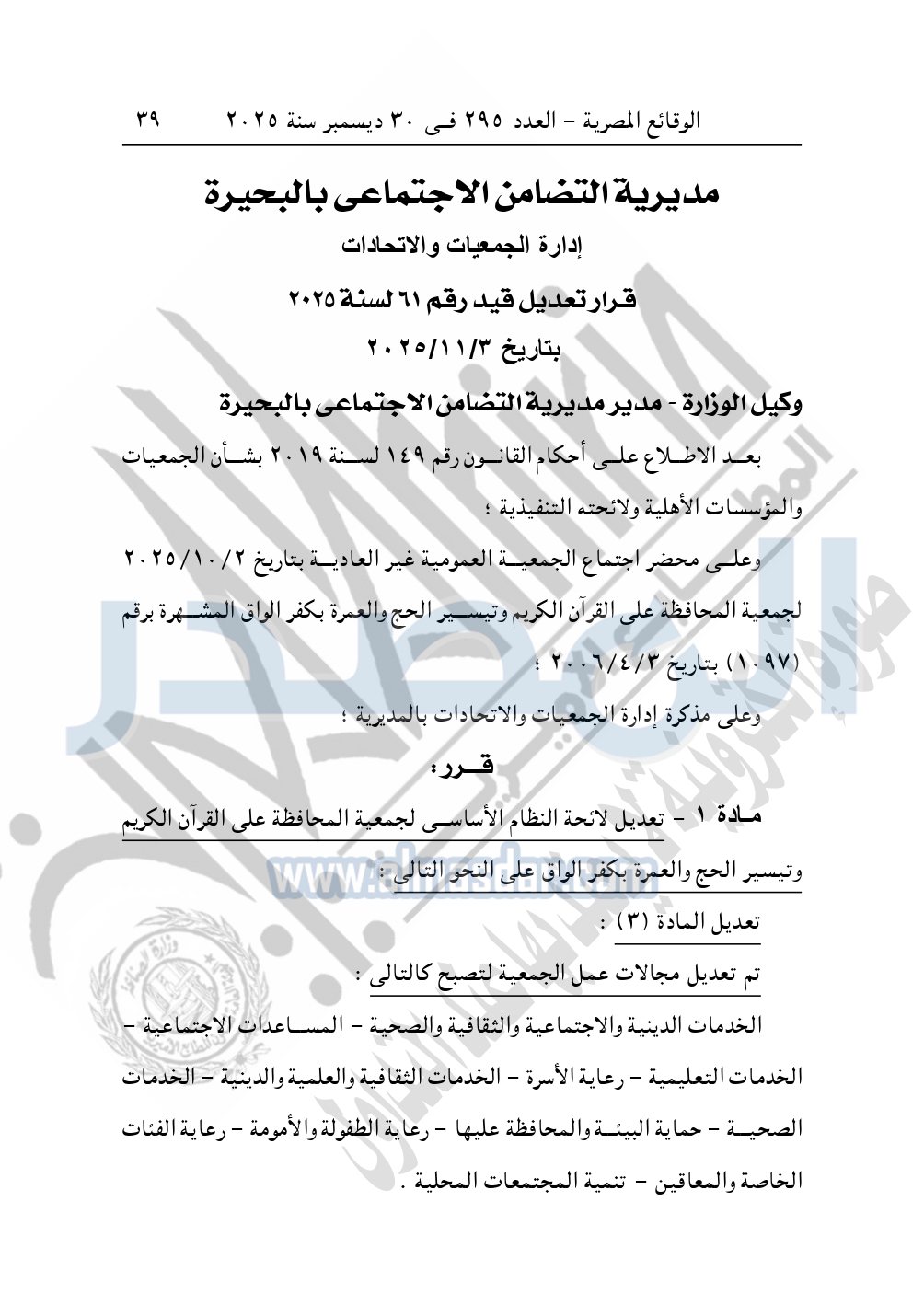 كما نشرت الوقائع المصرية في العدد 295 الصادر في 30 ديسمبر سنة 2025، مديرية التضامن الاجتماعي بالبحيرة، إدارة الجمعيات والاتحادات قرار تعديل قيد رقم 61 لسنة 2025 بتاريخ 3-11-2025، بشأن تعديل لائحة النظام الأساسي لجمعية المحافظة على القرآن الكريم وتيسير الحج والعمرة بكفر الواق.