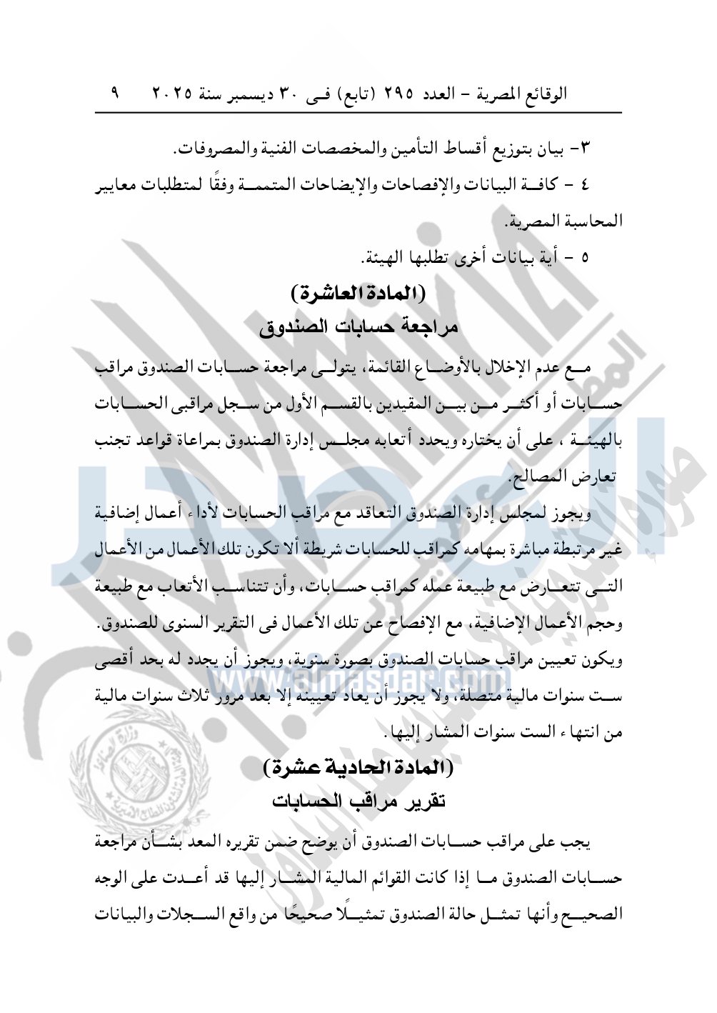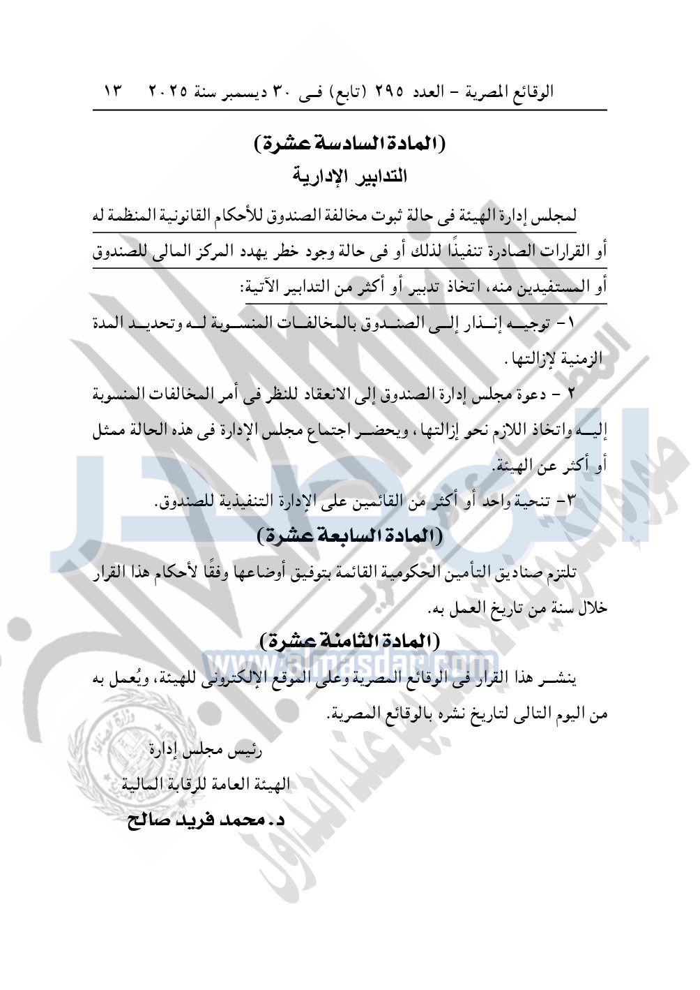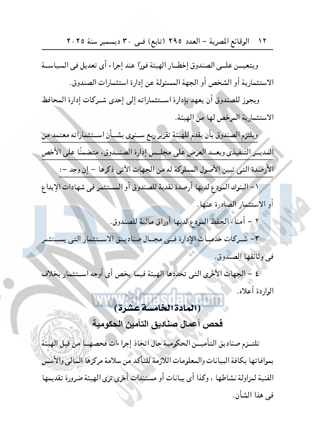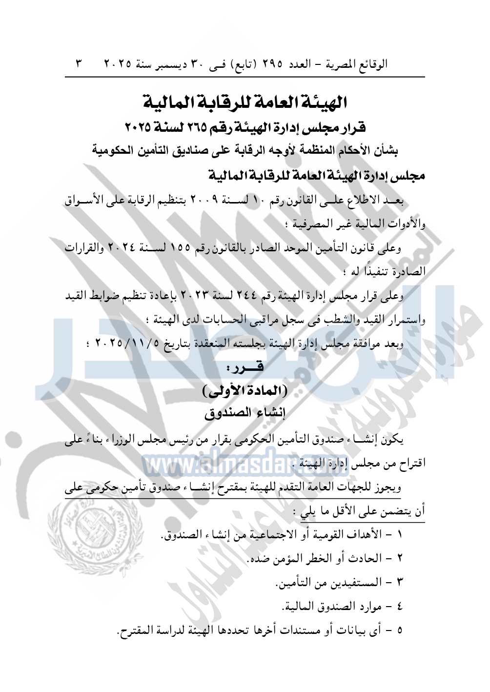نشرت الوقائع المصرية في العدد 295 "تابع" الصادر في 30 ديسمبر سنة 2025، الهيئة العامة للرقابة المالية، قرار مجلس إدارة الهيئة رقم 265 لسنة 2025، بشأن الأحكام المنظمة لأوجه الرقابة على صناديق التأمين الحكومية.