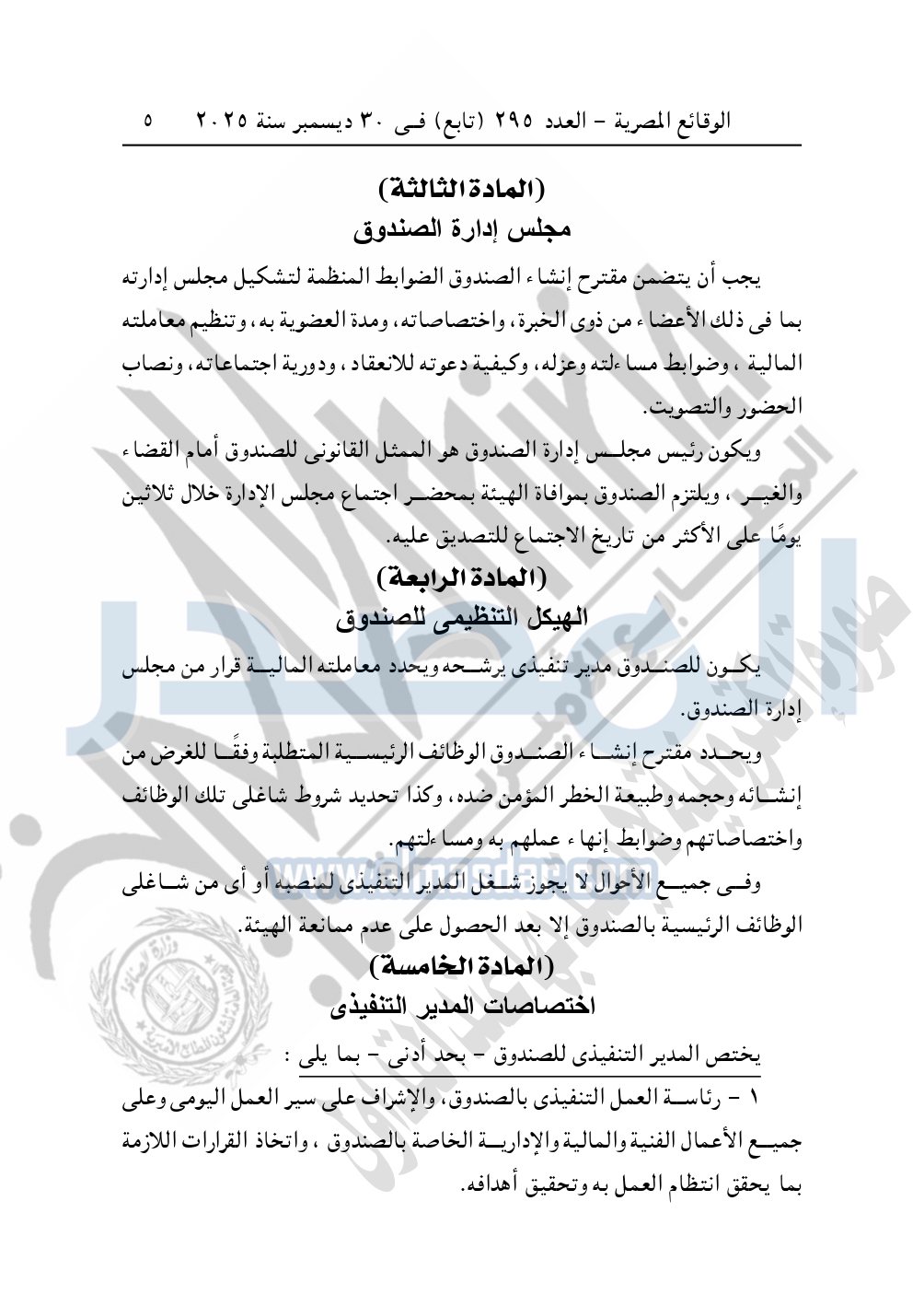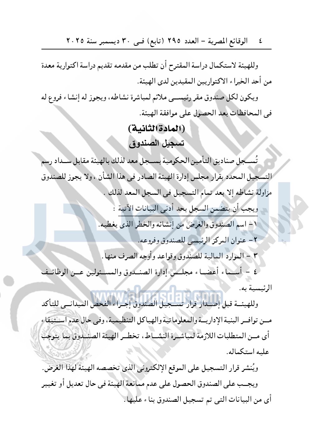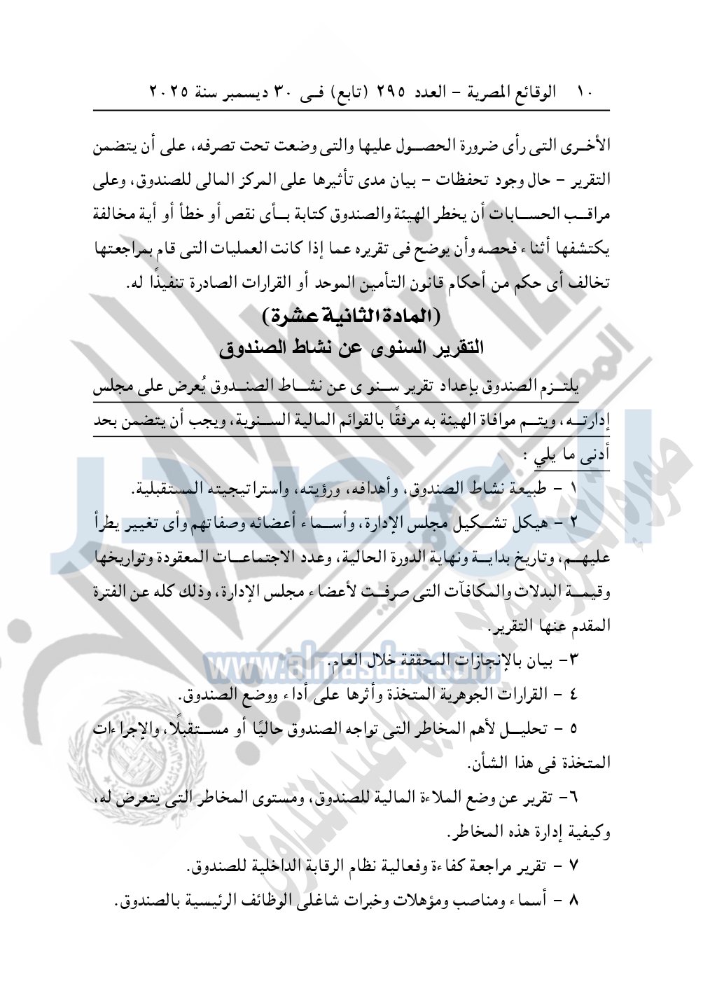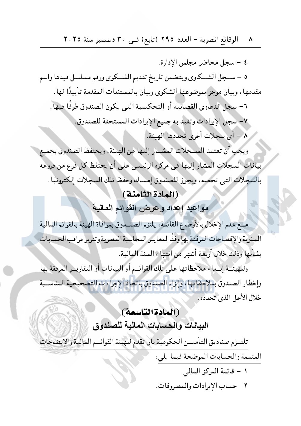 نشرت الوقائع المصرية في العدد 295 "تابع" الصادر في 30 ديسمبر سنة 2025، الهيئة العامة للرقابة المالية، قرار مجلس إدارة الهيئة رقم 265 لسنة 2025، بشأن الأحكام المنظمة لأوجه الرقابة على صناديق التأمين الحكومية.