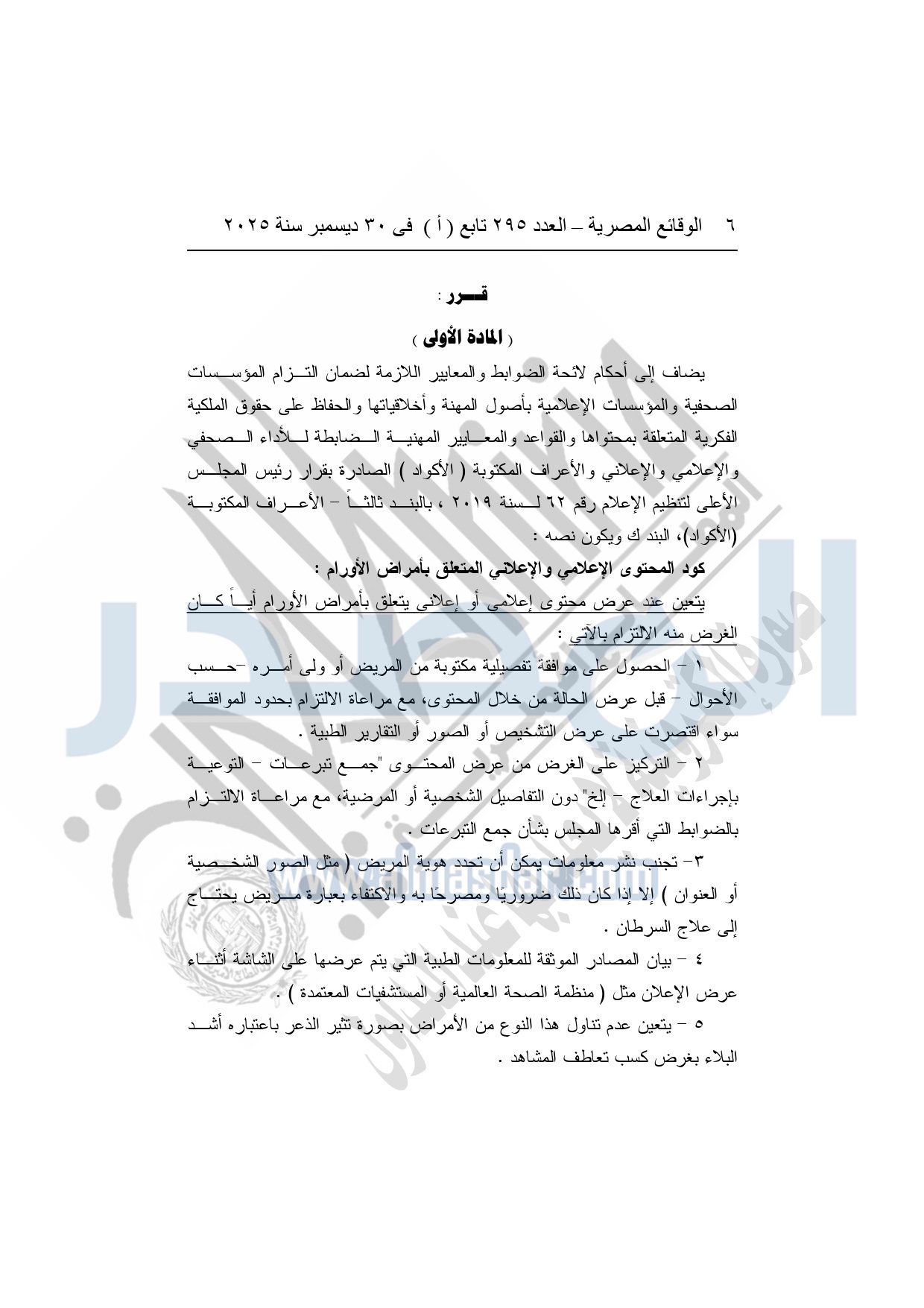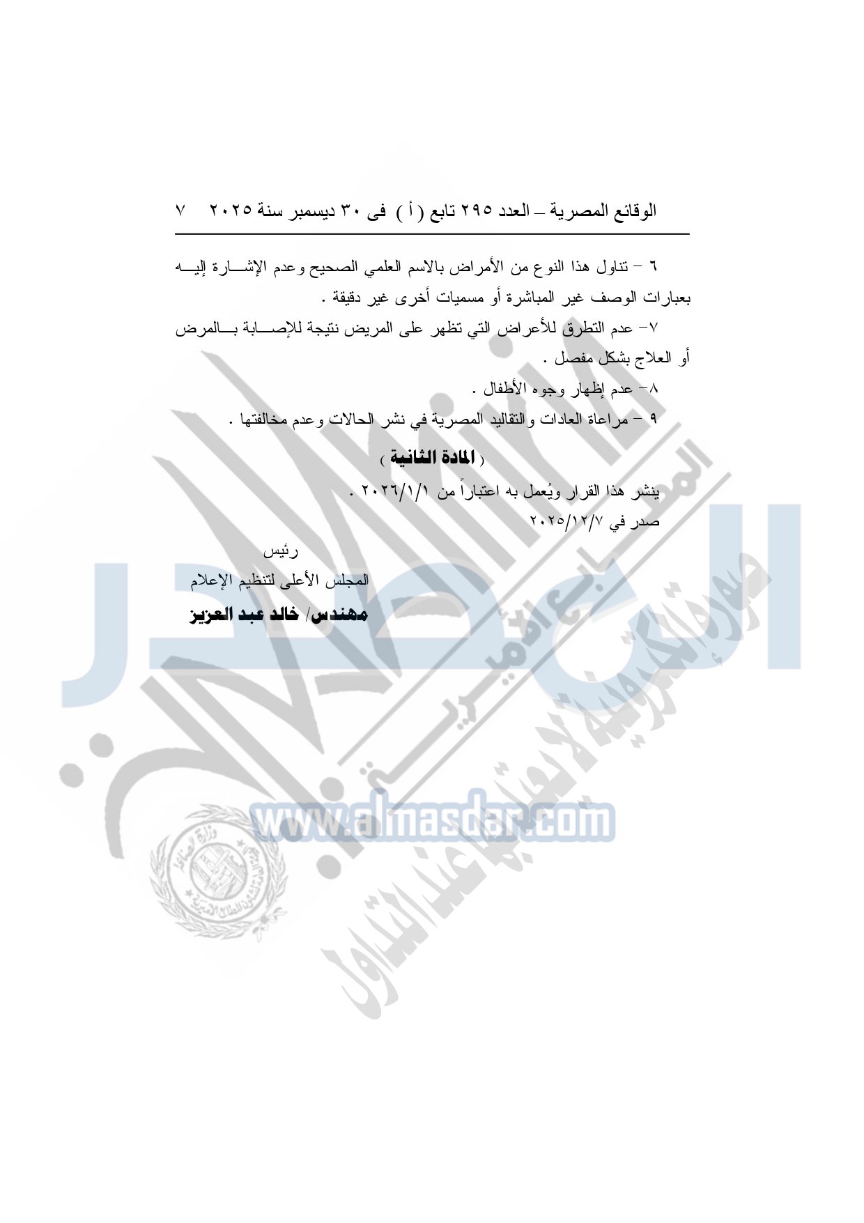 نشرت الوقائع المصرية في العدد 295 تابع "أ" الصادر في 30 ديسمبر سنة 2025، المجلس الأعلى لتنظيم الإعلام قرار رقم 63 لسنة 2025، بشأن التزام المؤسسات الصحفية والإعلامية بأصول المهنة وأخلاقياتها.
