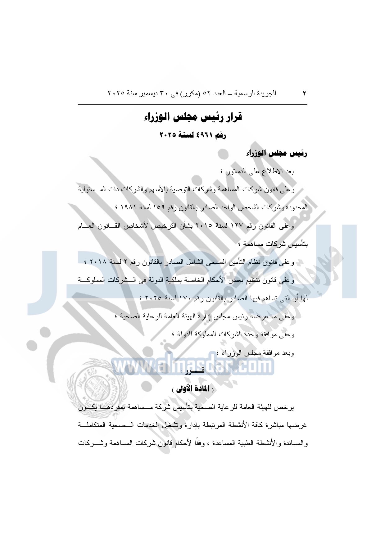 نشرت الجريدة الرسمية في العدد 52 "مكرر" الصادر في 30 سبتمبر سنة 2025، قرار رئيس مجلس الوزراء رقم 4961 لسنة 2025، بشأن الترخيص للهيئة العامة للرعاية الصحية بتأسيس شركة مساهمة بمفردها.