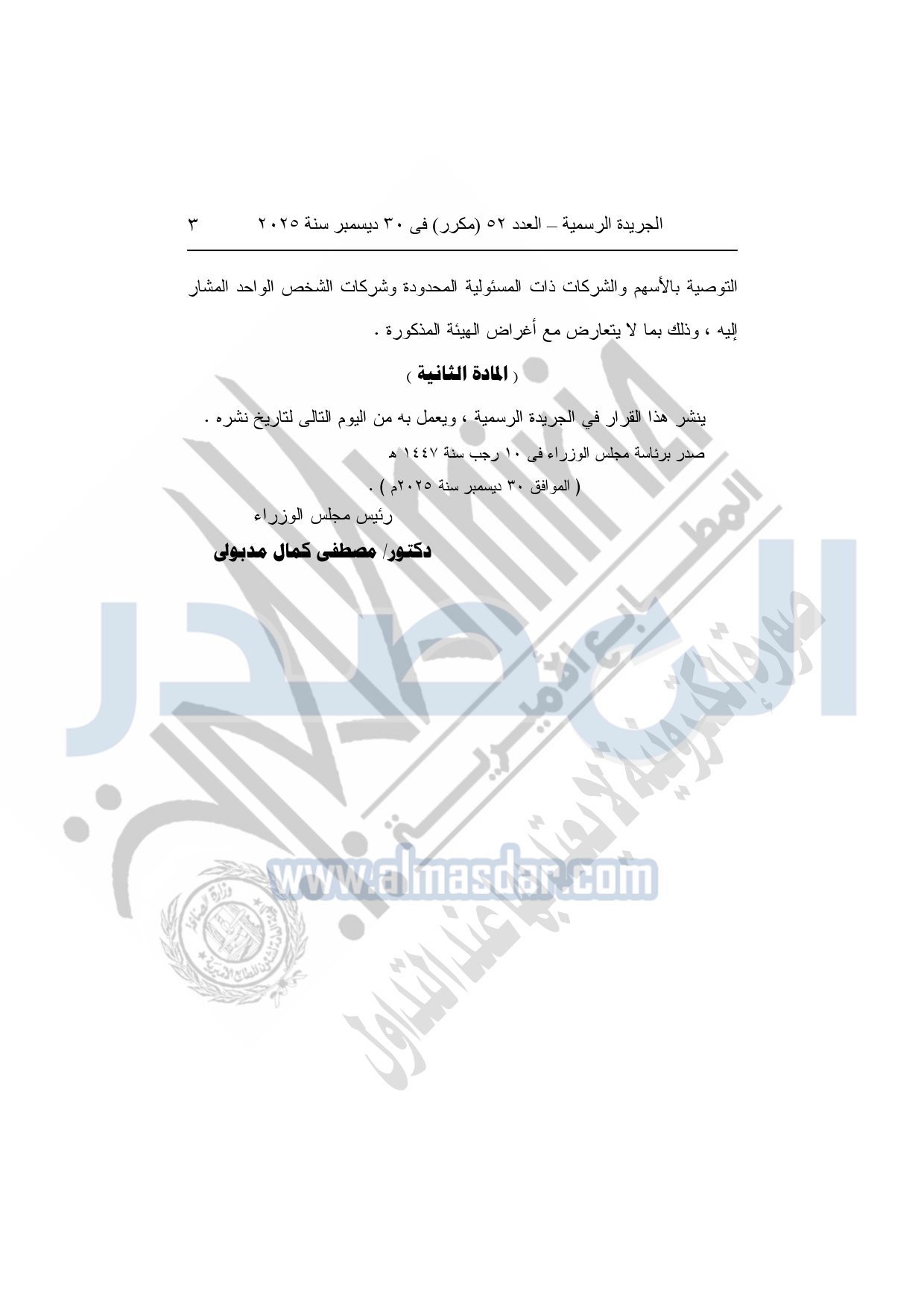 وأوضحت الجريدة الرسمية أن القرار جاء بعد الاطلاع على الدستور؛ وعلى قانون شركات المساهمة وشركات التوصية بالأسهم والشركات ذات المسئولية المحدودة وشركات الشخص الواحد الصادر بالقانون رقم 159 لسنة 1981، وعلى القانون رقم 127 لسنة 2015 بشأن الترخيص لأشخاص القانون العام بتأسيس شركات مساهمة.
