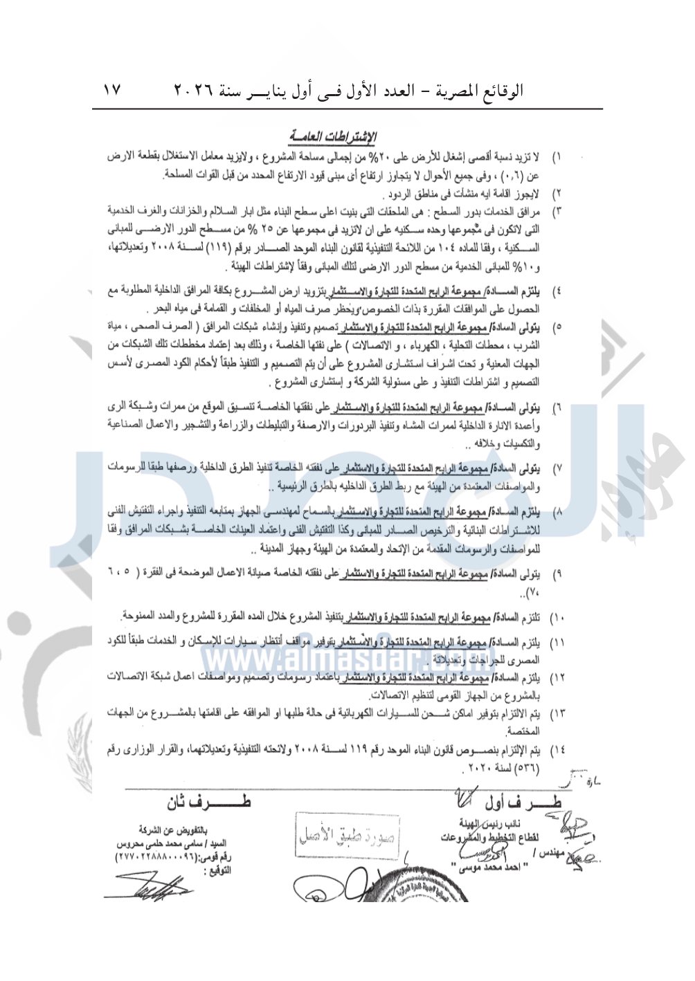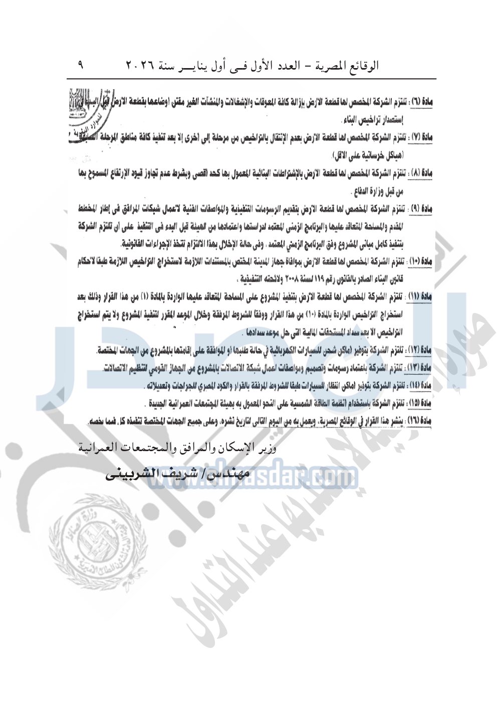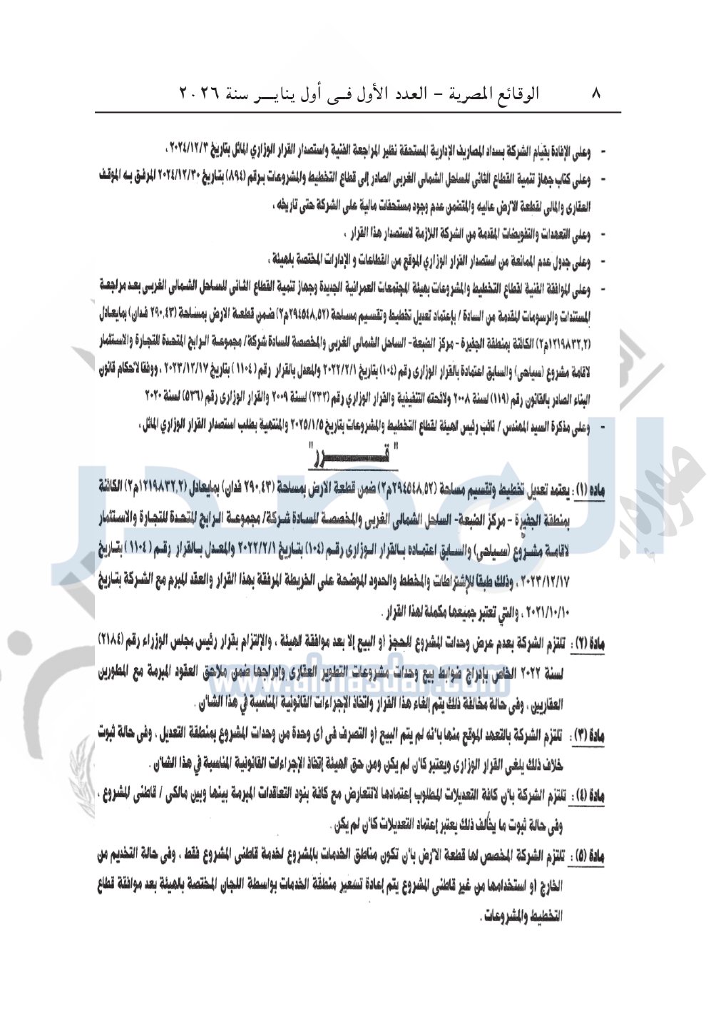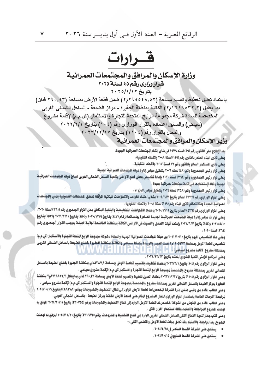 نشرت الوقائع المصرية، في العدد الأول فى أول يناير سنة 2026، قرار وزارة الإسكان والمرافق والمجتمعات العمرانية قرار وزاري رقم 45 لسنة 2025، بتاريخ 12-1-2025، بشأن اعتماد تعديل تخطيط وتقسيم مساحة "294548.52م2" ضمن قطعة الأرض بمساحة "290.43 فدان" بما يعادل "1219832.2م2" الكائنة بمنطقة الجفيرة - مركز الضبعة - الساحل الشمالي الغربي المخصصة لشركة مجموعة الرابح المتحدة للتجارة والاستثمار "ش.م.م" لإقامة مشروع "سياحي" والسابق اعتماده بالقرار الوزارى رقم "104" بتاريخ 1-2-2022 والمعدل بالقرار رقم "1104" بتاريخ 17-12-2023.