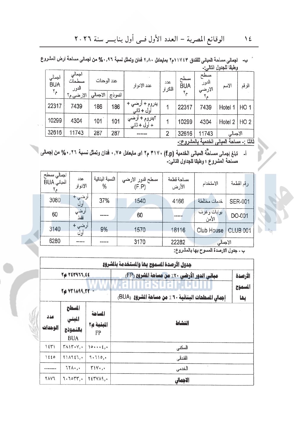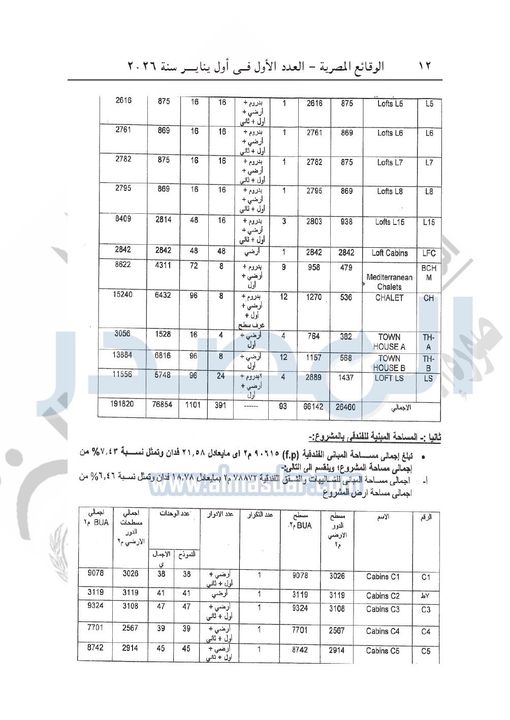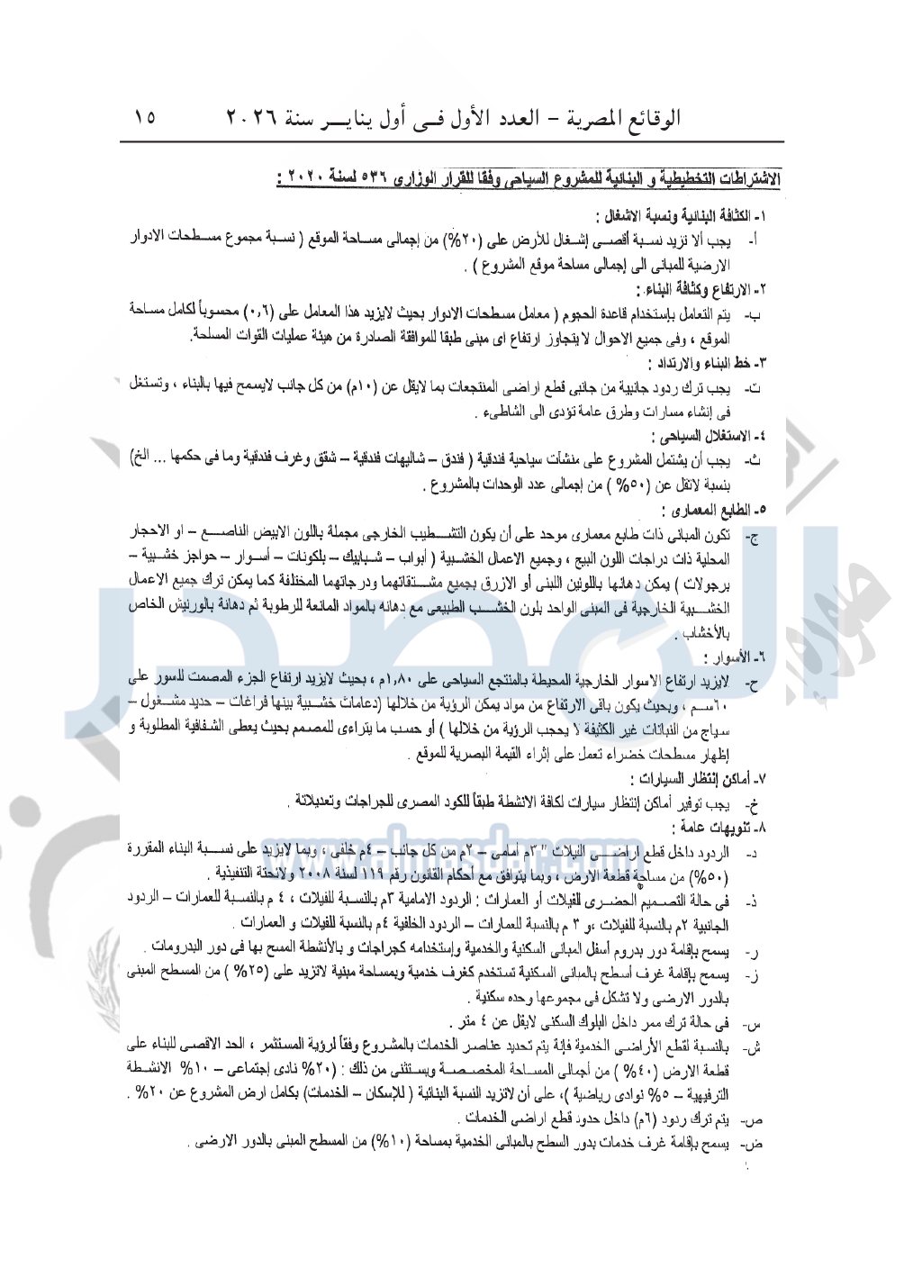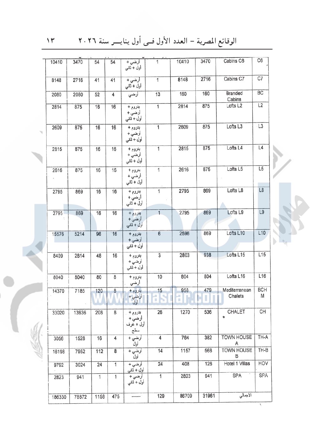 نشرت الوقائع المصرية، في العدد الأول فى أول يناير سنة 2026، قرار وزارة الإسكان والمرافق والمجتمعات العمرانية قرار وزاري رقم 45 لسنة 2025، بتاريخ 12-1-2025، بشأن اعتماد تعديل تخطيط وتقسيم مساحة "294548.52م2" ضمن قطعة الأرض بمساحة "290.43 فدان" بما يعادل "1219832.2م2" الكائنة بمنطقة الجفيرة - مركز الضبعة - الساحل الشمالي الغربي المخصصة لشركة مجموعة الرابح المتحدة للتجارة والاستثمار "ش.م.م" لإقامة مشروع "سياحي" والسابق اعتماده بالقرار الوزارى رقم "104" بتاريخ 1-2-2022 والمعدل بالقرار رقم "1104" بتاريخ 17-12-2023.
