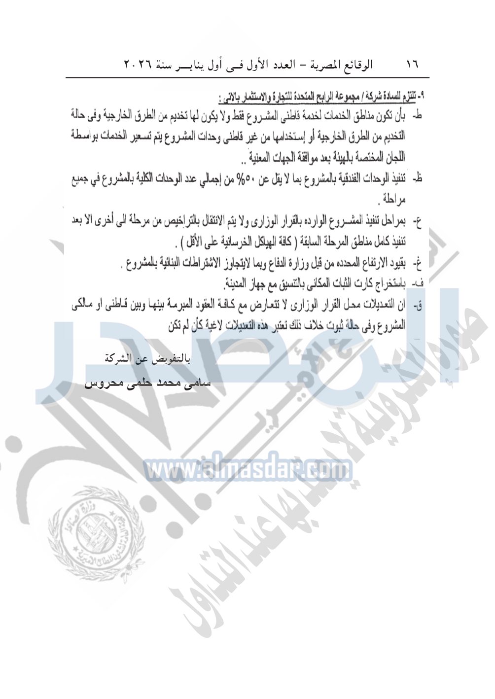 تلتزم الشركة بالتعهد الموقع منها بانه لم يتم البيع أو التصرف فى أى وحدة من وحدات المشروع بمنطقة التعديل، وفي حالة ثبوت خلاف ذلك يلغى القرار الوزارى ويعتبر كان لم يكن ومن حق الهيئة إتخاذ الإجراءات القانونية المناسبة في هذا الشأن.