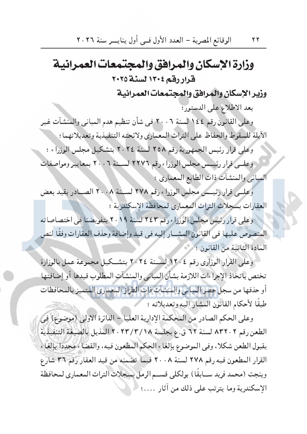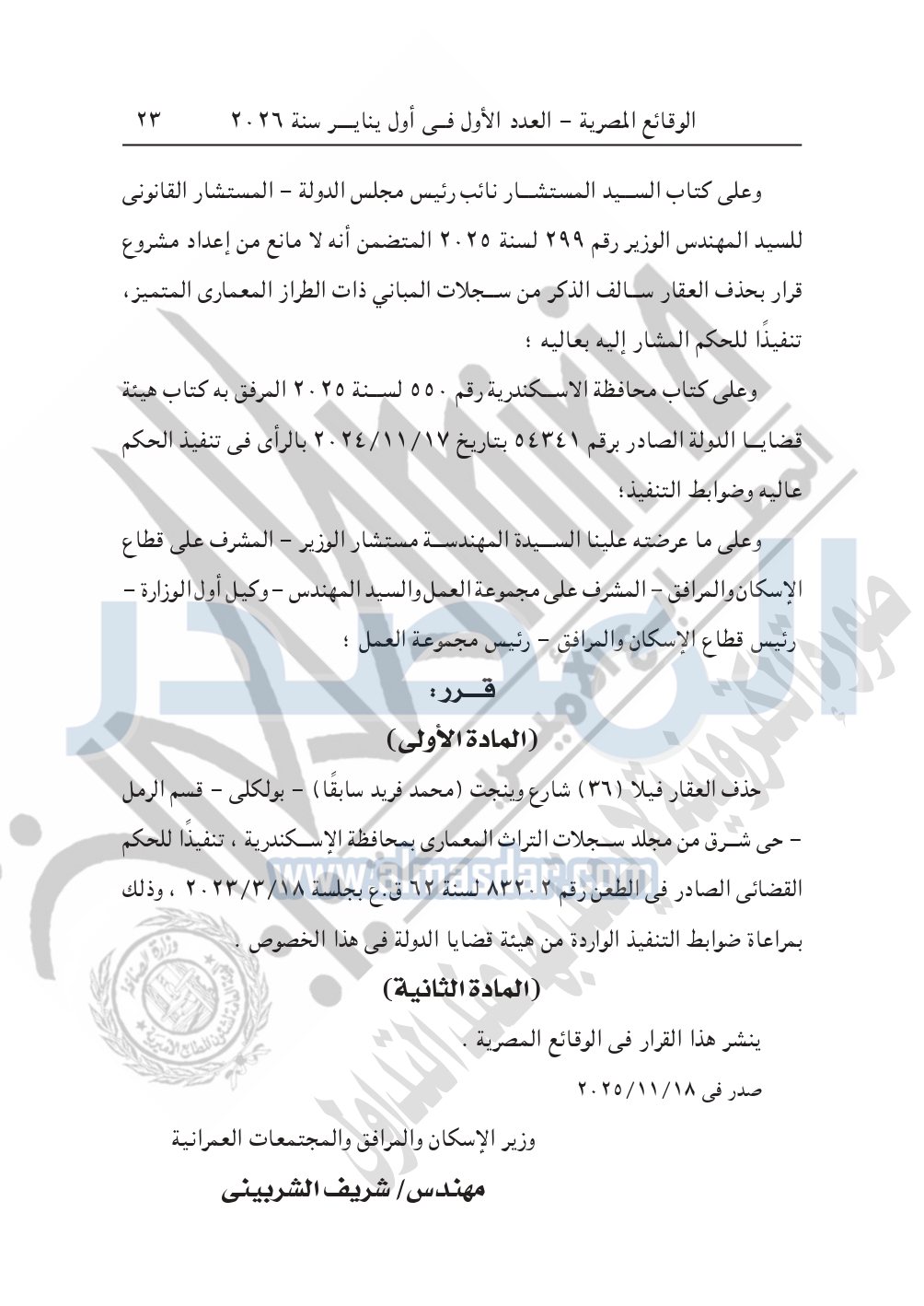 كما نشرت الوقائع المصرية، في العدد الأول فى أول يناير سنة 2026، قرار وزارة الإسكان والمرافق والمجتمعات العمرانية قرار رقم 1304 لسنة 2025، بشأن حذف العقار فيلا "36" شارع وينجت من مجلد سجلات التراث المعمارى بمحافظة الإسكندرية.