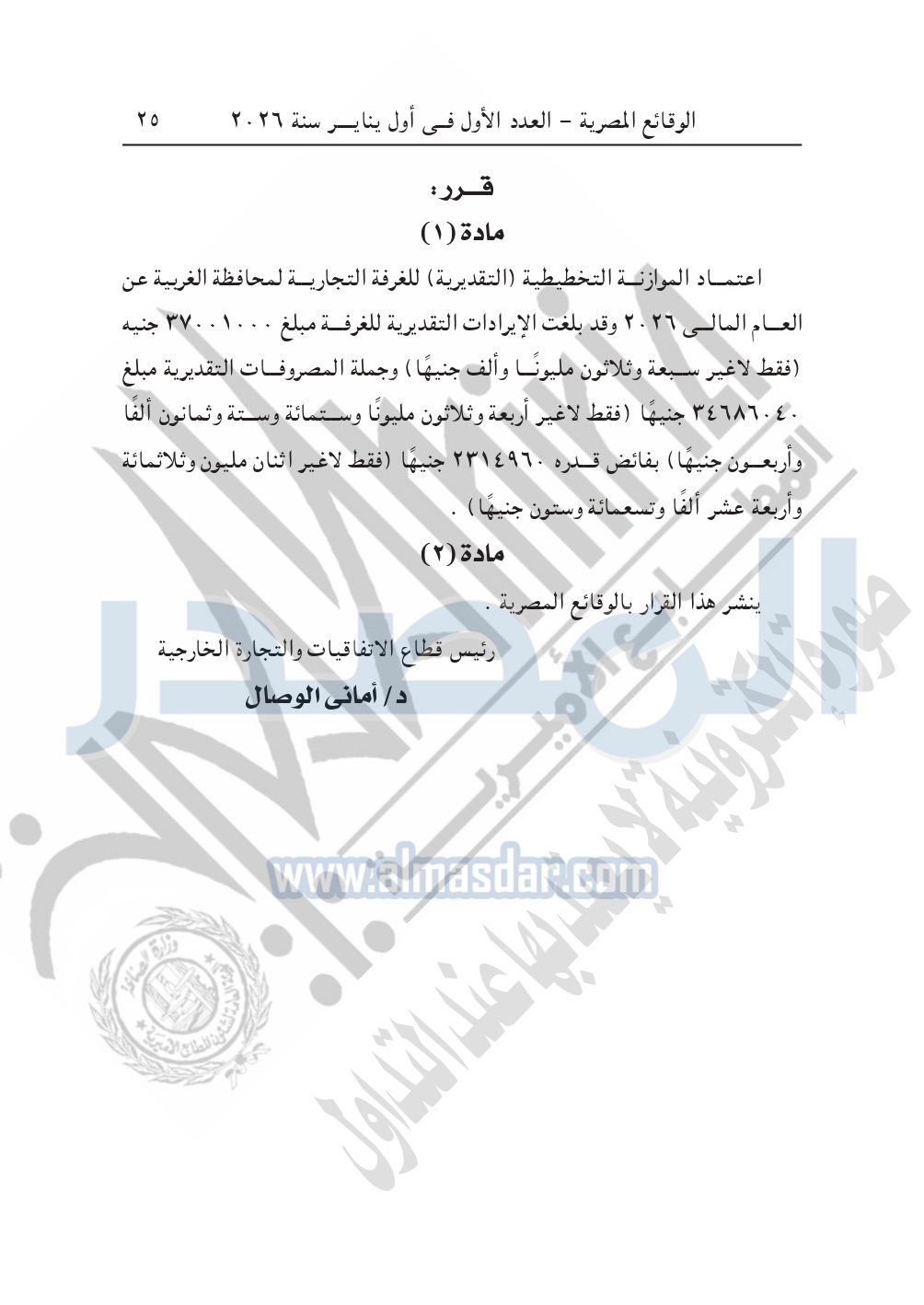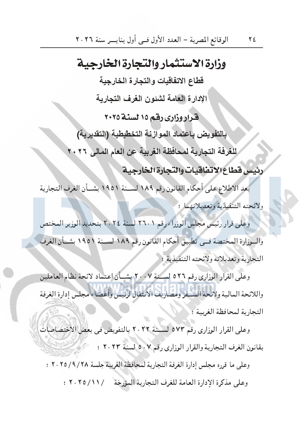 نشرت الوقائع المصرية، في العدد الأول في أول يناير 2026، قرار وزارة الاستثمار والتجارة الخارجية، الإدارة العامة لشئون الغرف التجارية، قرار وزاري رقم 15 لسنة 2025 بالتفويض، بشأن اعتماد الموازنة التخطيطية "التقديرية" للغرفة التجارية لمحافظة الغربية عن العام المالي 2026.