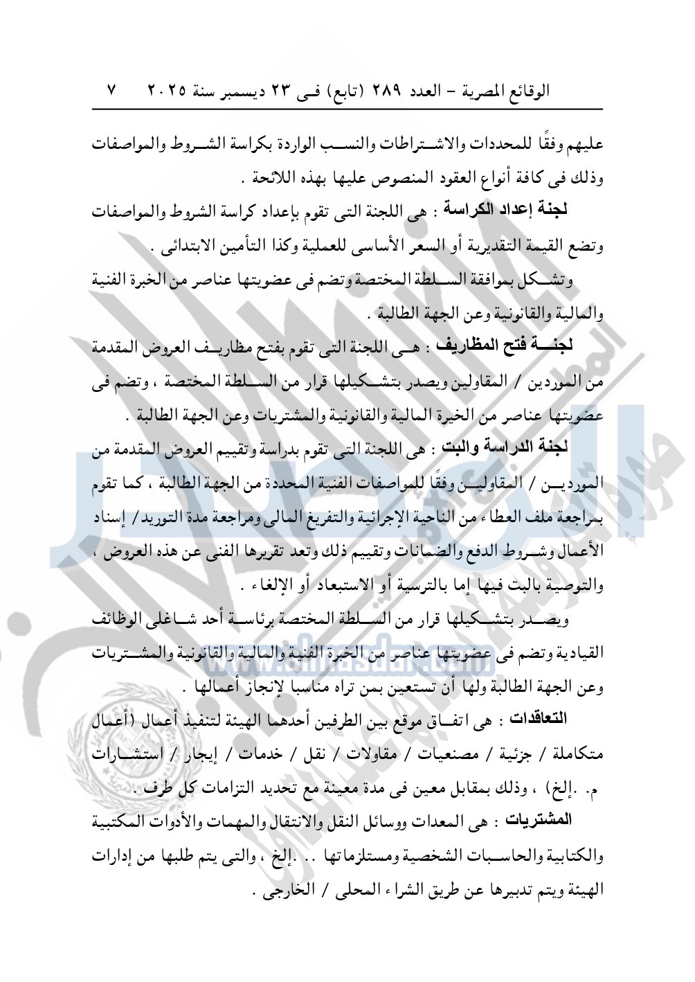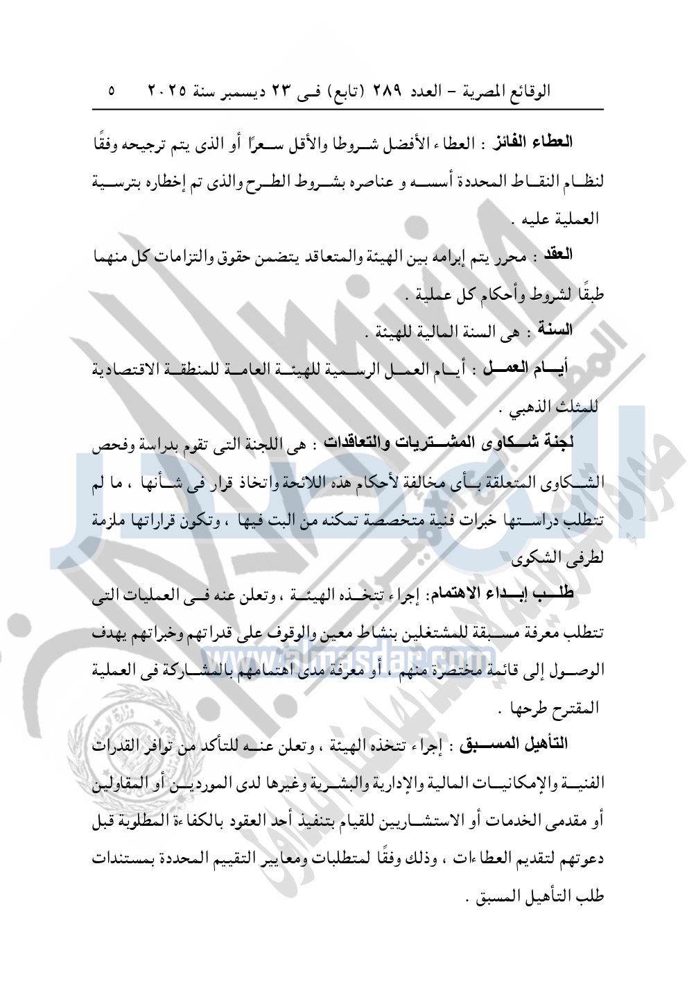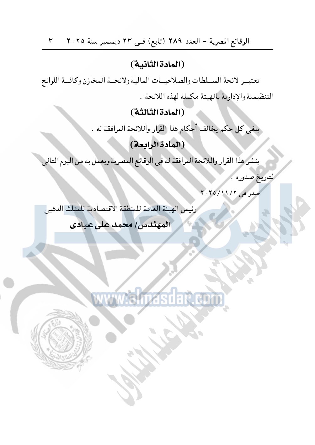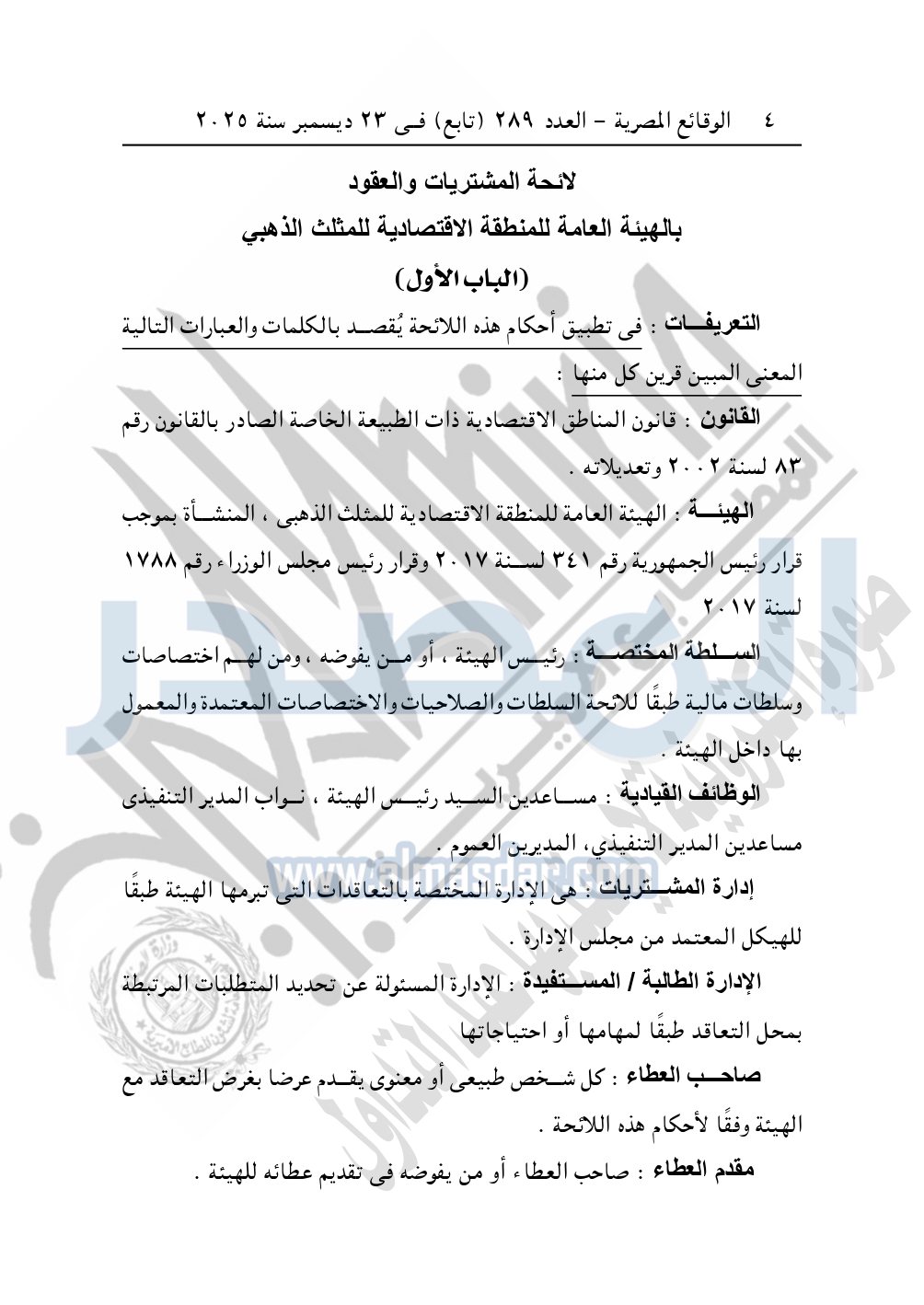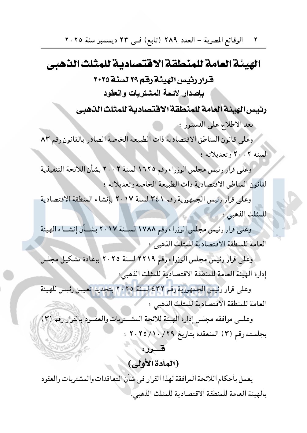 نشرت الوقائع المصرية، في العدد 289 "تابع"، الصادر في 23 ديسمبر 2025، قرار الهيئة العامة للمنطقة الاقتصادية للمثلث الذهبي، رقم 29 لسنة 2025، بشأن إصدار لائحة المشتريات والعقود.