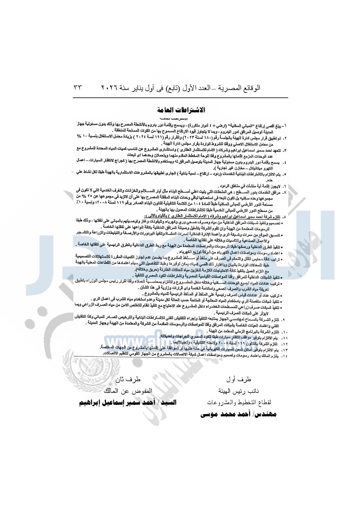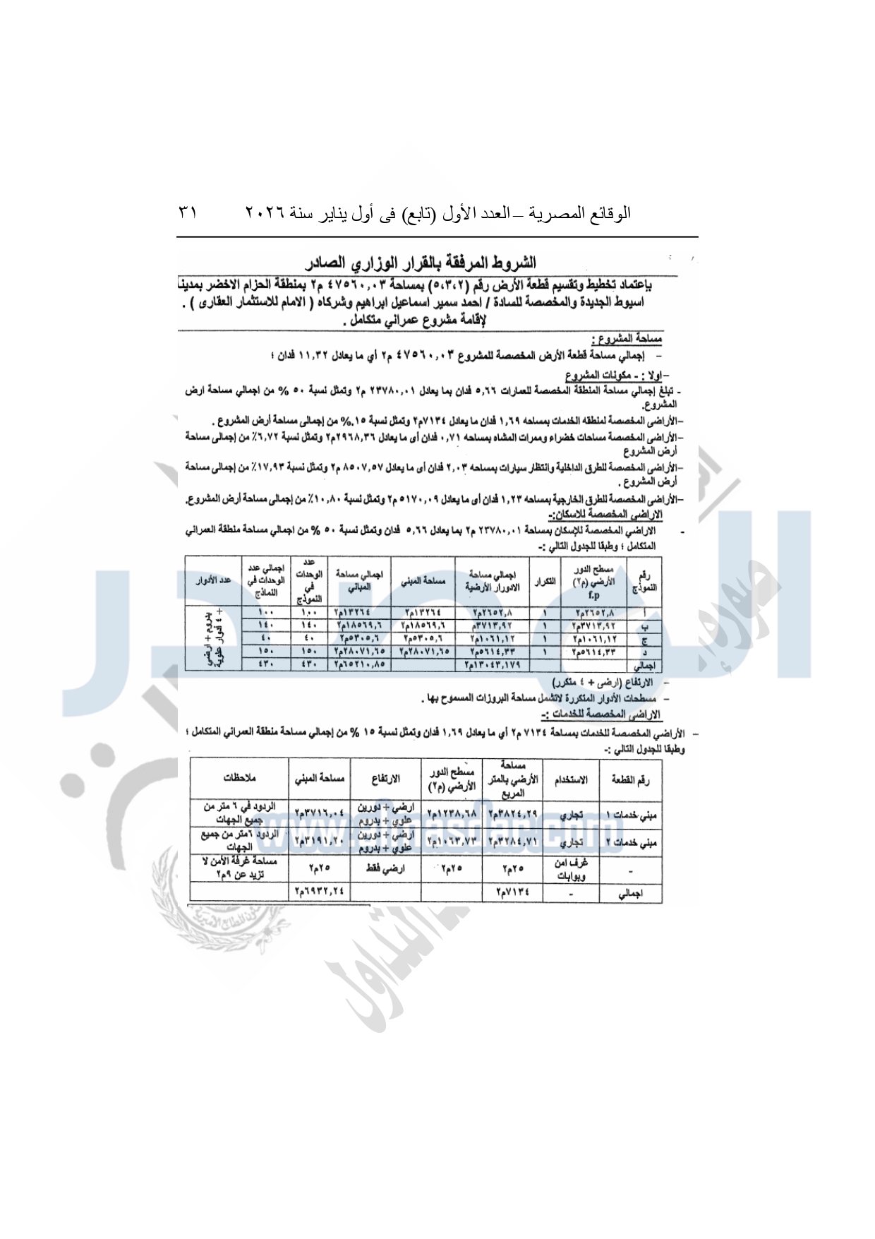 نشرت الوقائع المصرية، في العدد الأول "تابع"، الصادر في أول يناير 2026، قرار وزارة الإسكان والمرافق والمجتمعات العمرانية، رقم 246 لسنة 2025، بتاريخ 18-2-2025، بشأن اعتماد تخطيط وتقسيم قطع الأراضي أرقام "2، 3، 5" بمساحة 47560.03م2 بما يعادل 11.32 فدان بمنطقة الحزام الأخضر بمدينة أسيوط الجديدة المخصصة لشركة أحمد سمير إسماعيل إبراهيم وشركاه "الإمام للاستثمار العقاري والمقاولات" لإقامة مشروع عمراني متكامل.