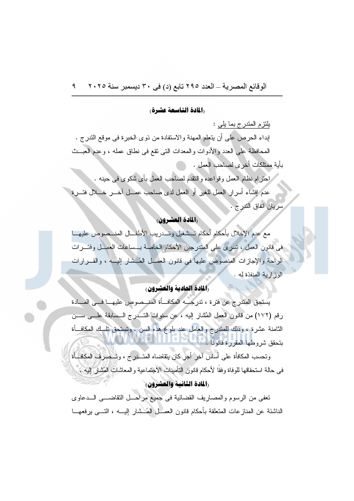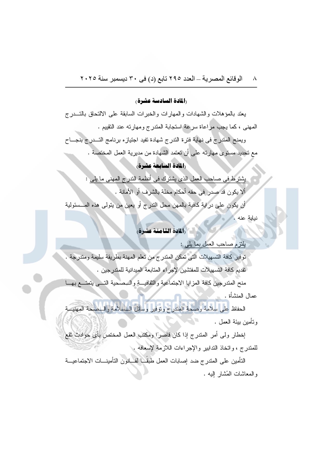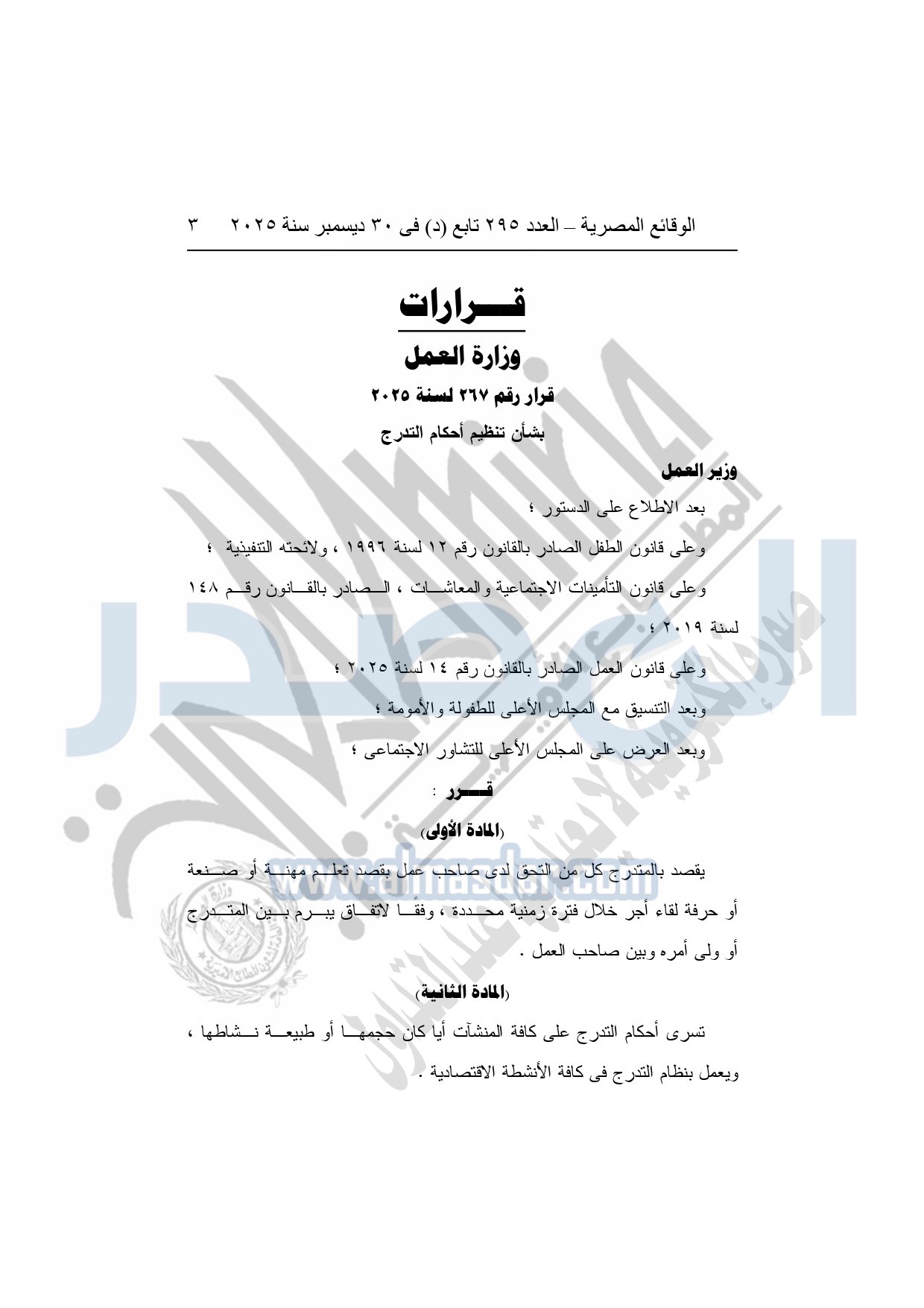 نشرت الوقائع المصرية، في العدد 295 تابع "د"، الصادر في 30 ديسمبر 2025، قرار وزارة العمل، رقم 267 لسنة 2025، بشأن تنظيم أحكام التدرج.
