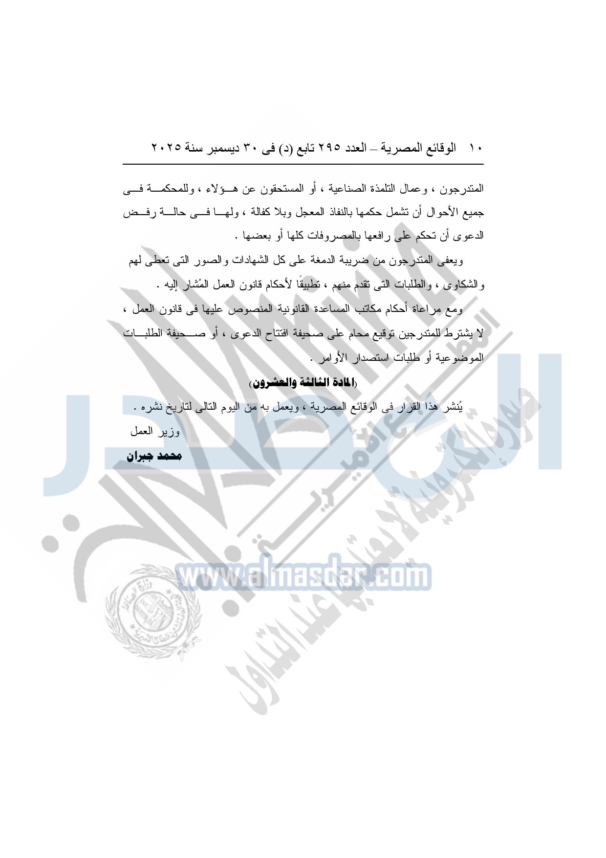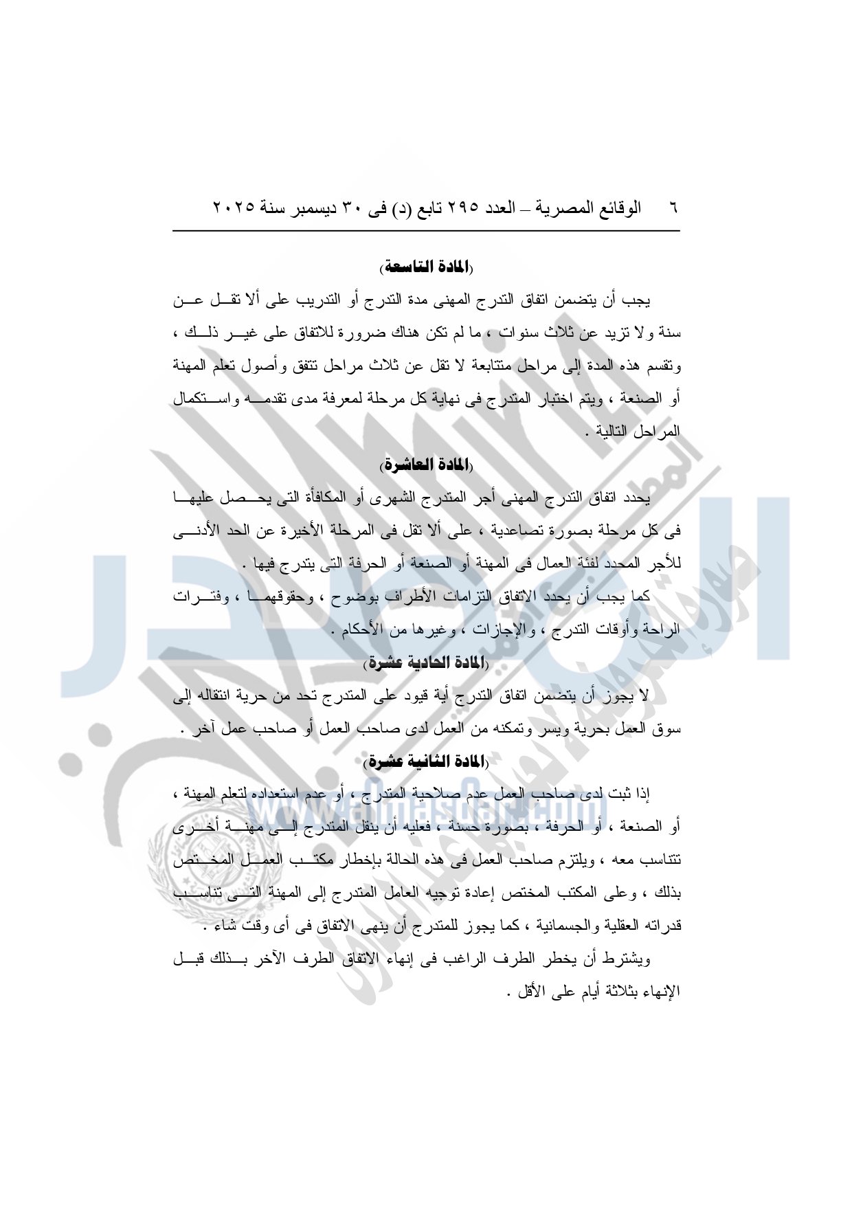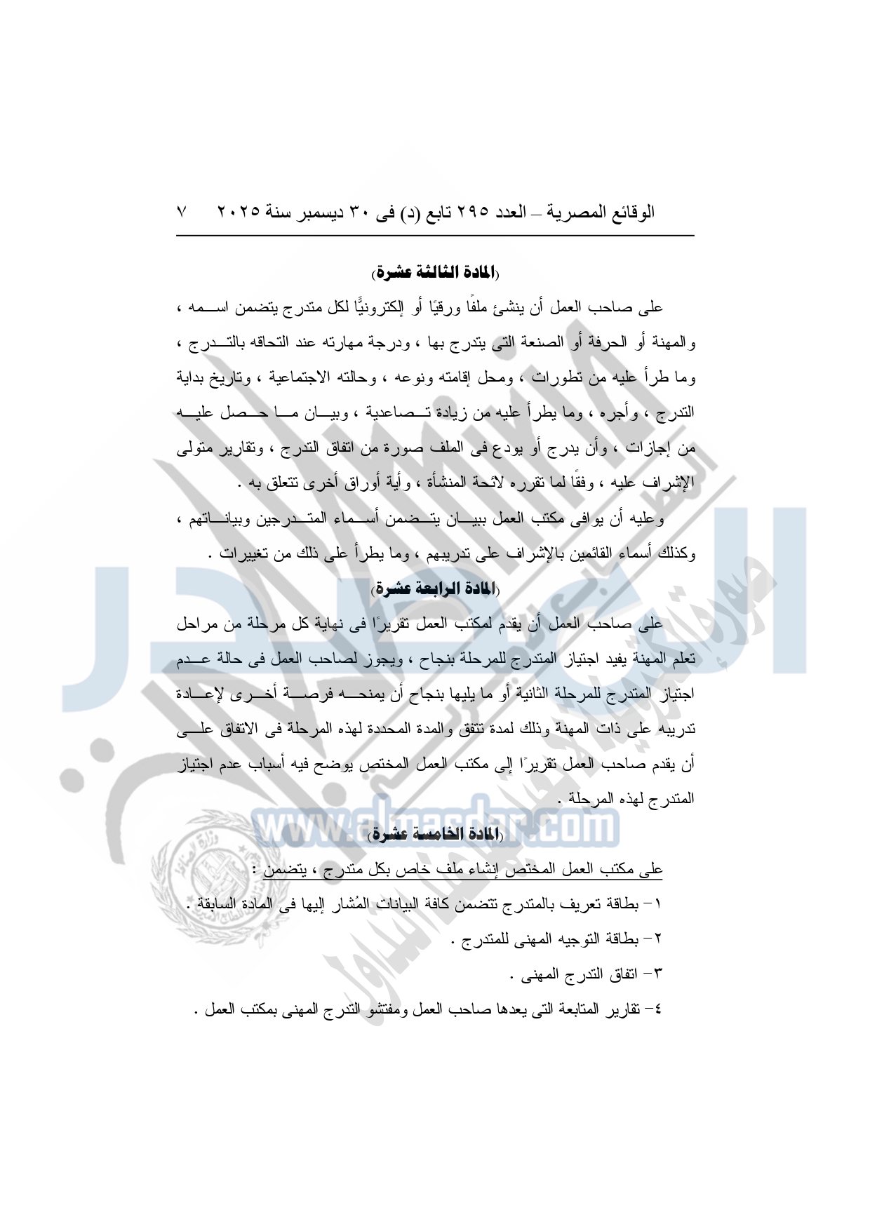 نشرت الوقائع المصرية، في العدد 295 تابع "د"، الصادر في 30 ديسمبر 2025، قرار وزارة العمل، رقم 267 لسنة 2025، بشأن تنظيم أحكام التدرج.