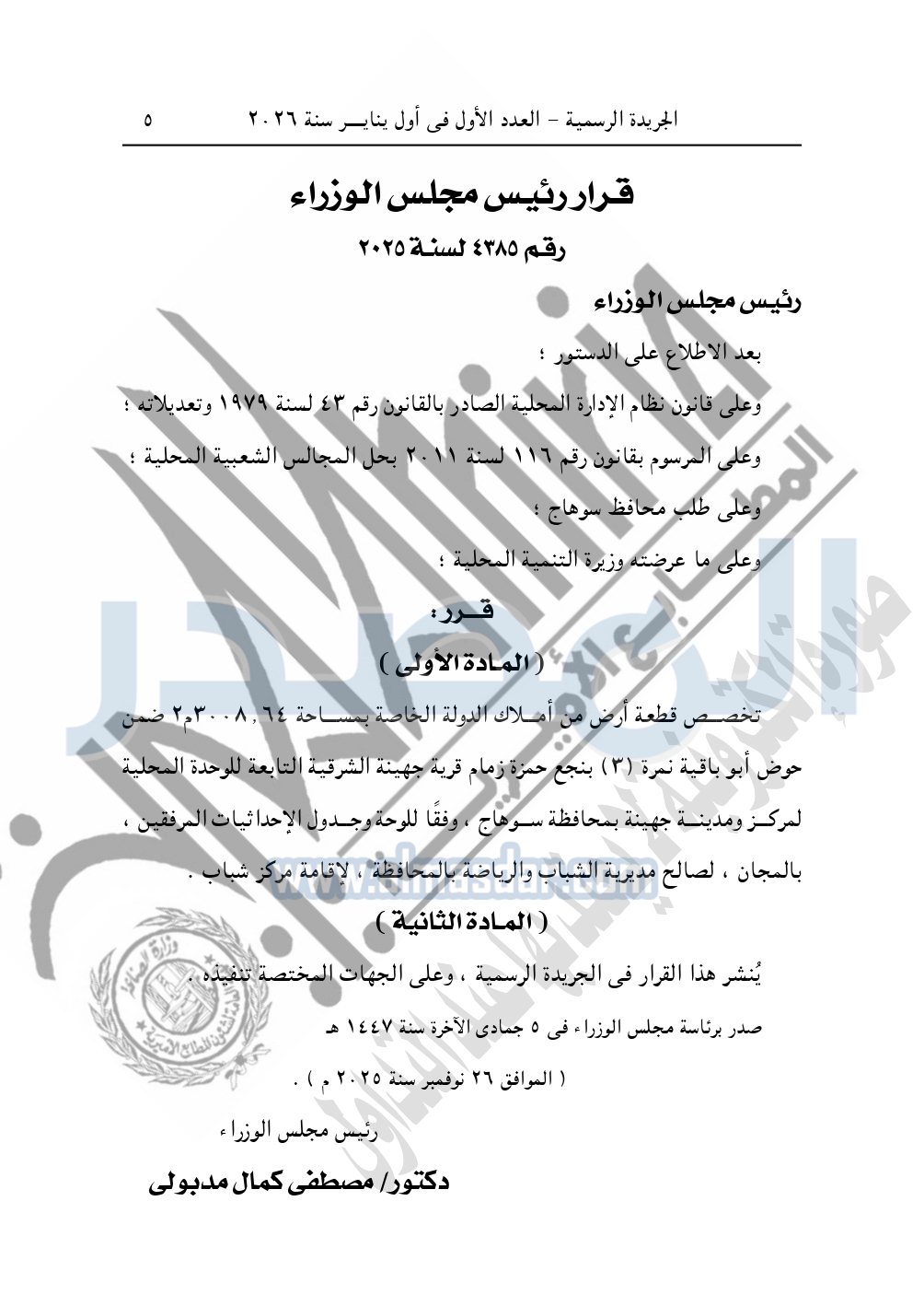 نشرت الجريدة الرسمية، في العدد الأول، الصادر في أول يناير 2026، قرار رئيس مجلس الوزراء، رقم 4385 لسنة 2025، بشأن تخصيص قطعة أرض لإقامة مركز شباب بمحافظة سوهاج.