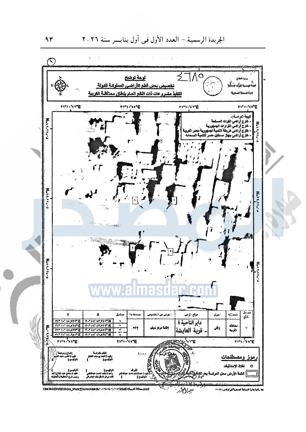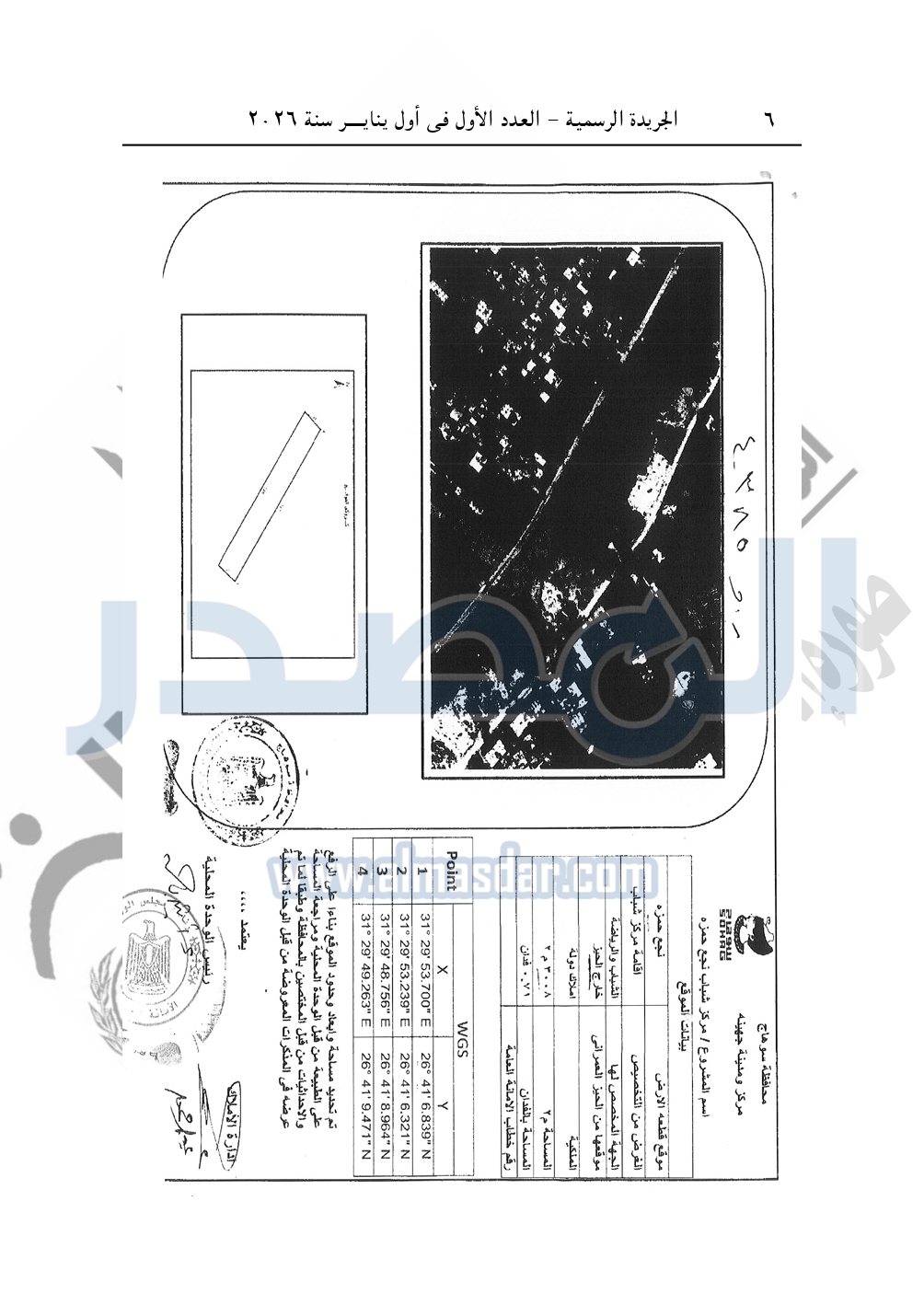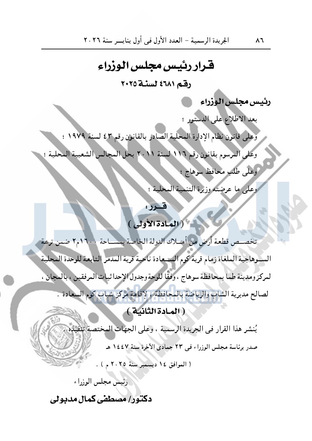 وأيضا نشرت الجريدة الرسمية، في العدد الأول، الصادر في أول يناير 2026، قرار رئيس مجلس الوزراء، رقم 4682 لسنة 2025، بشأن تخصيص قطعة أرض لإقامة مركز شباب نجع عبد الرحيم بمحافظة سوهاج.