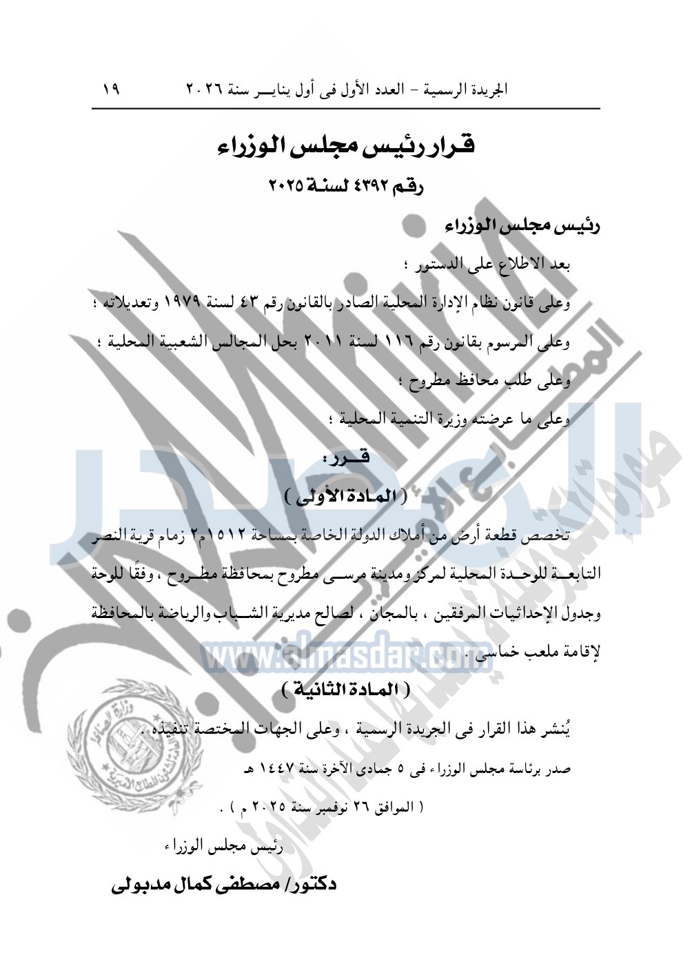 كما نشرت الجريدة الرسمية، في العدد الأول، الصادر في أول يناير 2026، قرار رئيس مجلس الوزراء، رقم 4392 لسنة 2025، بشأن تخصيص قطعة أرض لإقامة ملعب خماسي بمحافظة مطروح.