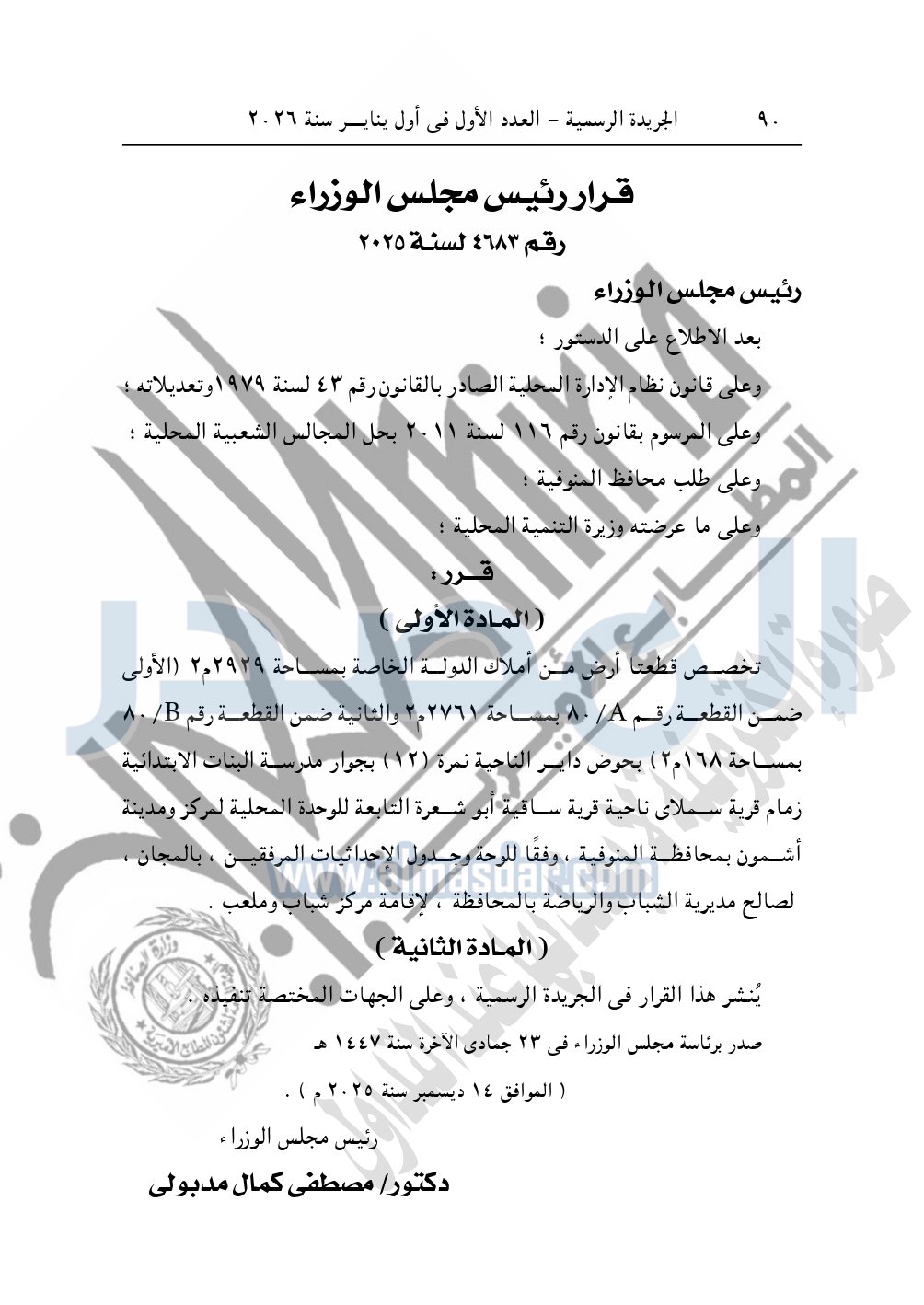 وأيضا نشرت الجريدة الرسمية، في العدد الأول، الصادر في أول يناير 2026، قرار رئيس مجلس الوزراء، رقم 4683 لسنة 2025، بشأن تخصيص قطعة أرض لإقامة مركز شباب وملعب بمحافظة المنوفية.