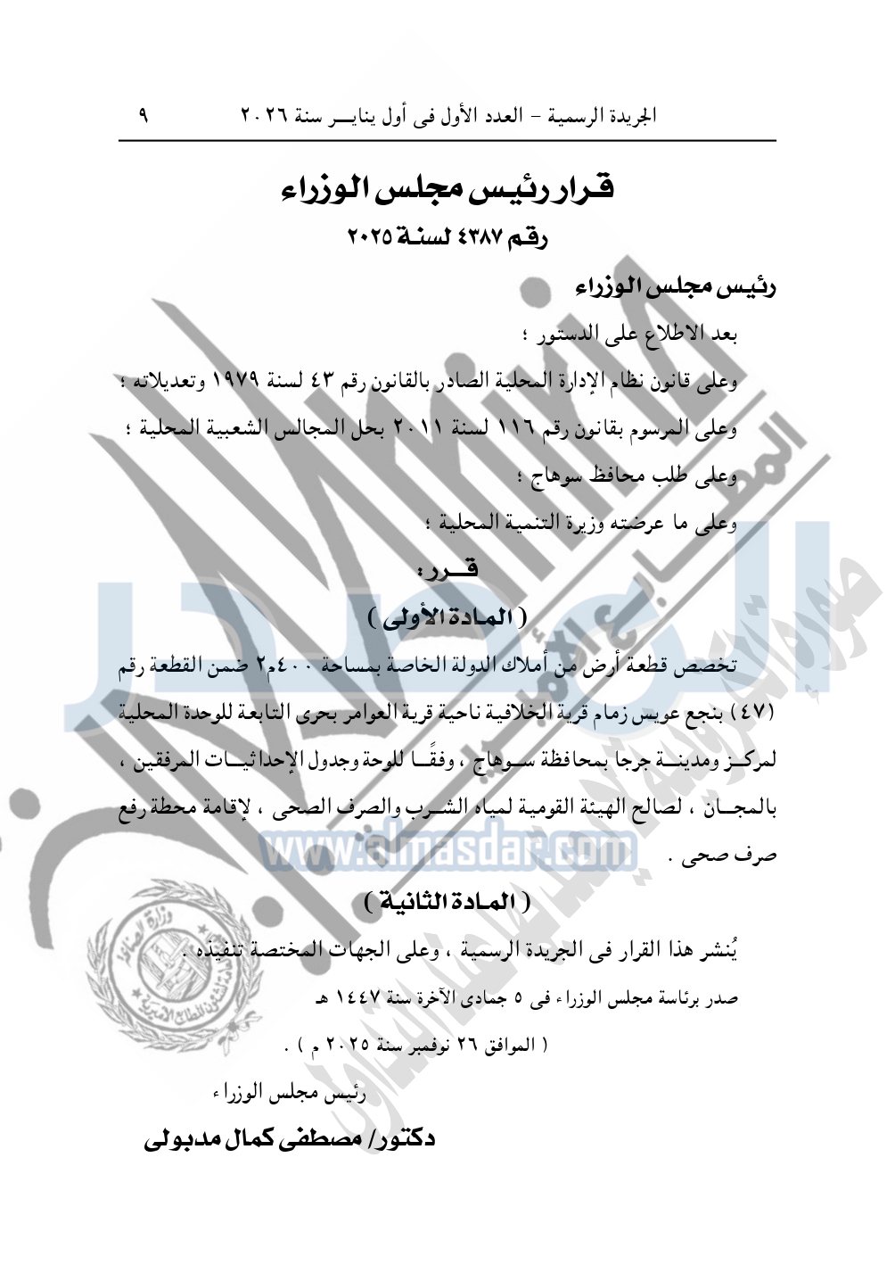 نشرت الجريدة الرسمية، في العدد الأول، الصادر في أول يناير 2026، قرار رئيس مجلس الوزراء، رقم 4387 لسنة 2025، بشأن تخصيص قطعة أرض لإقامة محطة رفع صرف صحى بمحافظة سوهاج.