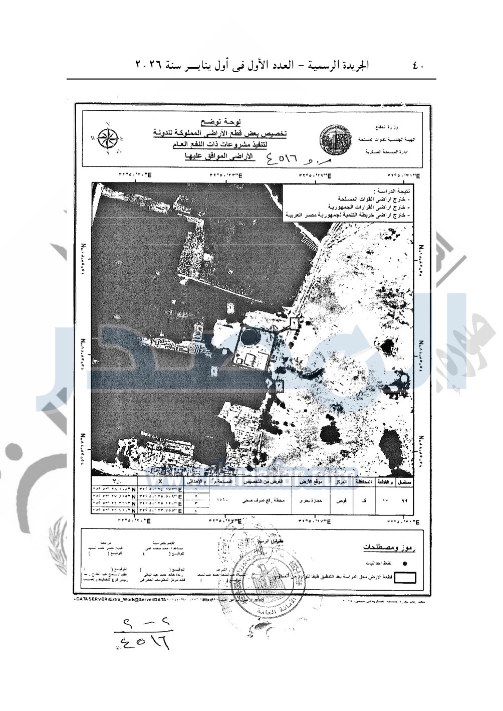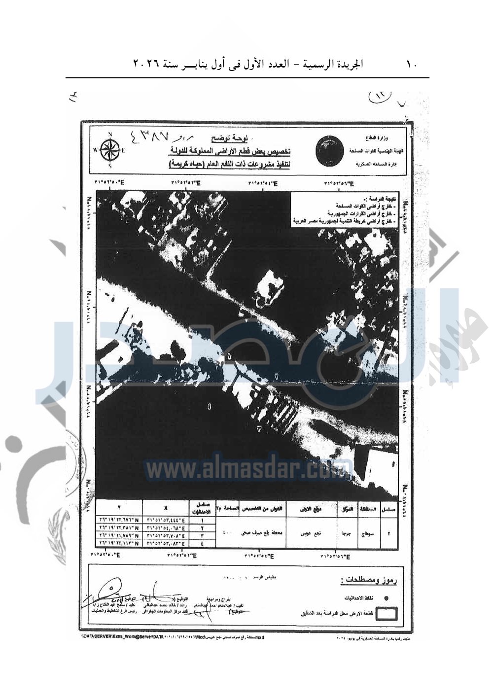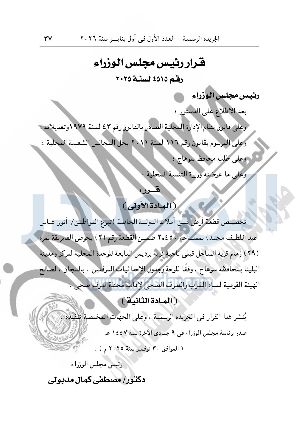 كما نشرت الجريدة الرسمية، في العدد الأول، الصادر في أول يناير 2026، قرار رئيس مجلس الوزراء، رقم 4515 لسنة 2025، بشأن تخصيص قطعة أرض لإقامة محطة صرف صحى بمحافظة سوهاج.