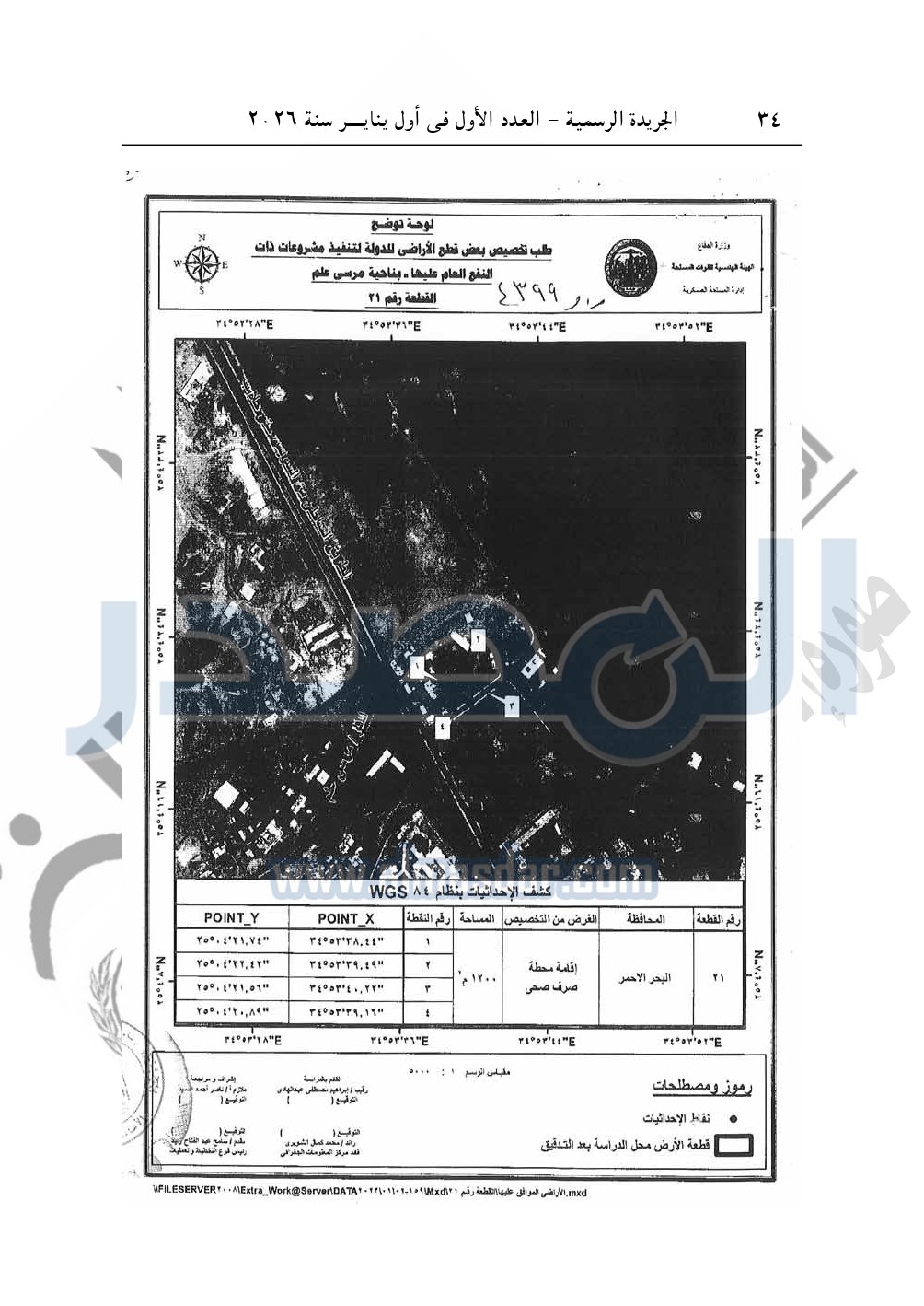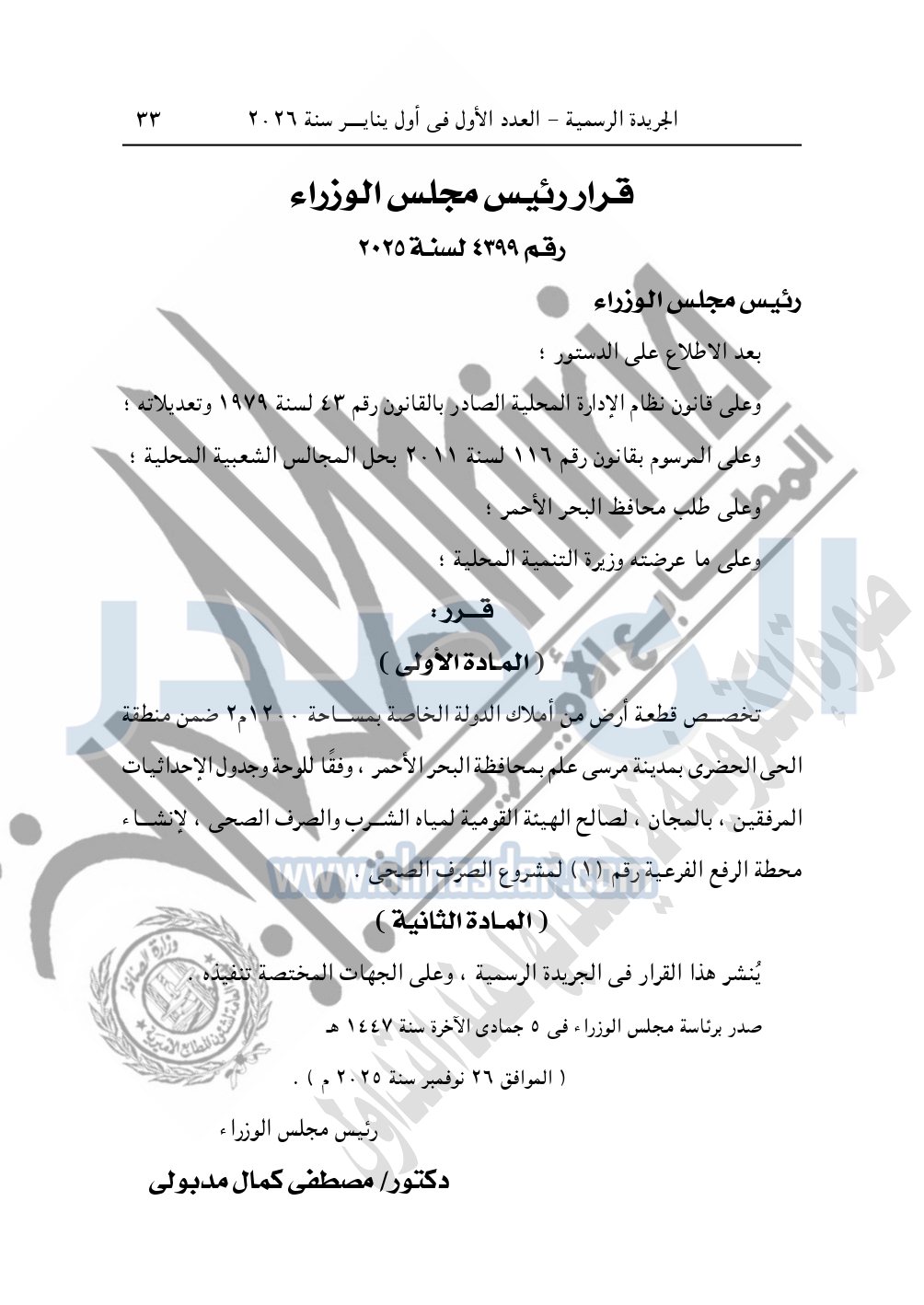 كما نشرت الجريدة الرسمية، في العدد الأول، الصادر في أول يناير 2026، قرار رئيس مجلس الوزراء، رقم 4399 لسنة 2025، بشأن تخصيص قطعة أرض لإنشاء محطة الرفع الفرعية رقم "1" لمشروع الصرف الصحى بمحافظة البحر الأحمر.