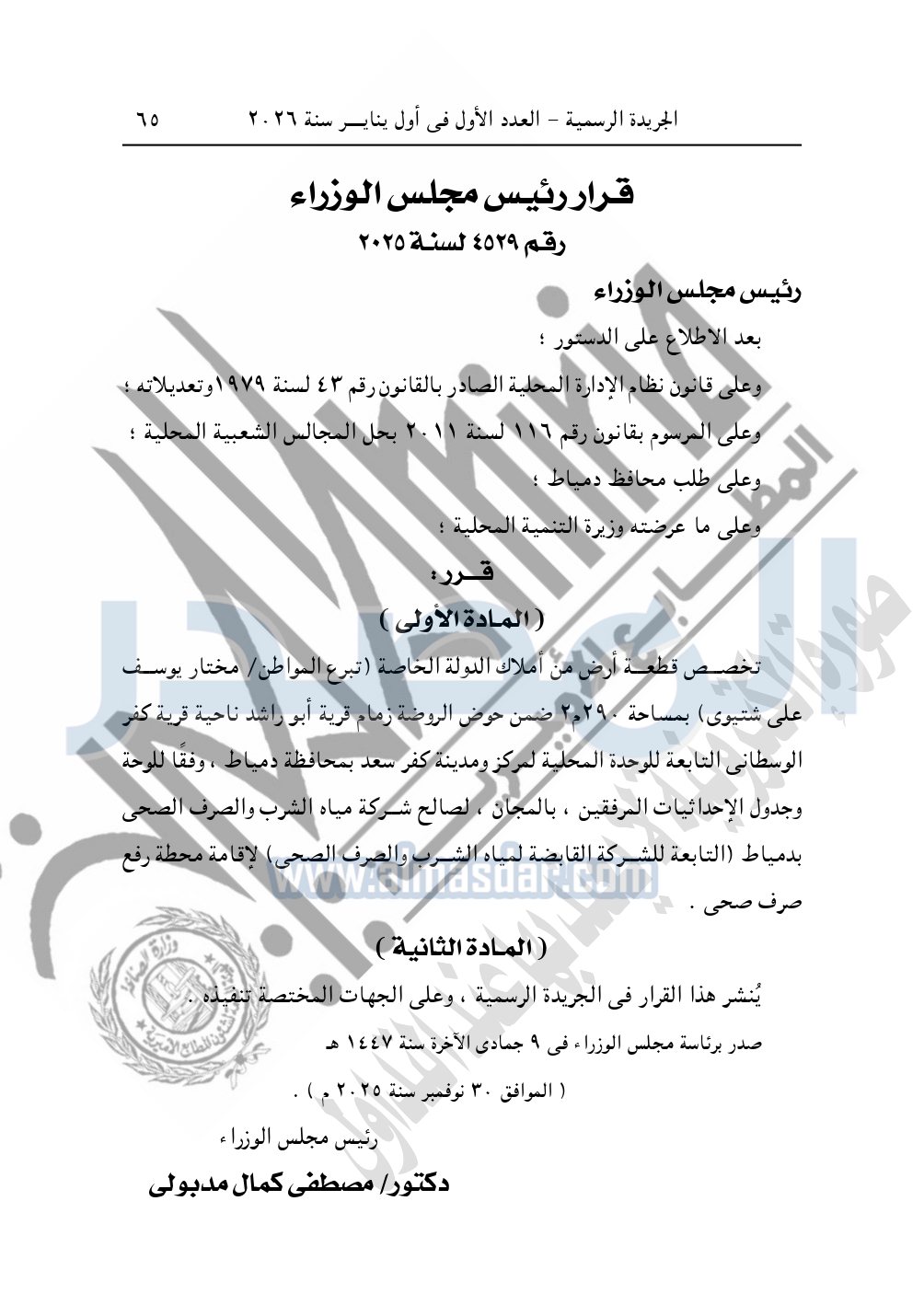 كما نشرت الجريدة الرسمية، في العدد الأول، الصادر في أول يناير 2026، قرار رئيس مجلس الوزراء، رقم 4529 لسنة 2025، بشأن تخصيص قطعة أرض لإقامة محطة رفع صرف صحی بمحافظة دمياط.
