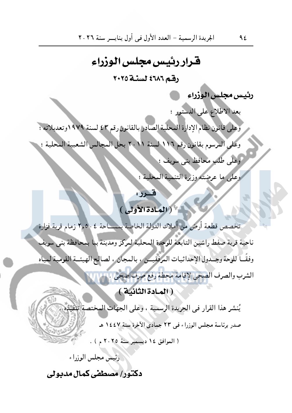 ونشرت الجريدة الرسمية، في العدد الأول، الصادر في أول يناير 2026، قرار رئيس مجلس الوزراء، رقم 4525 لسنة 2025، بشأن تخصيص قطعة أرض لإقامة محطة رفع صرف صحى بمحافظة بني سويف.
