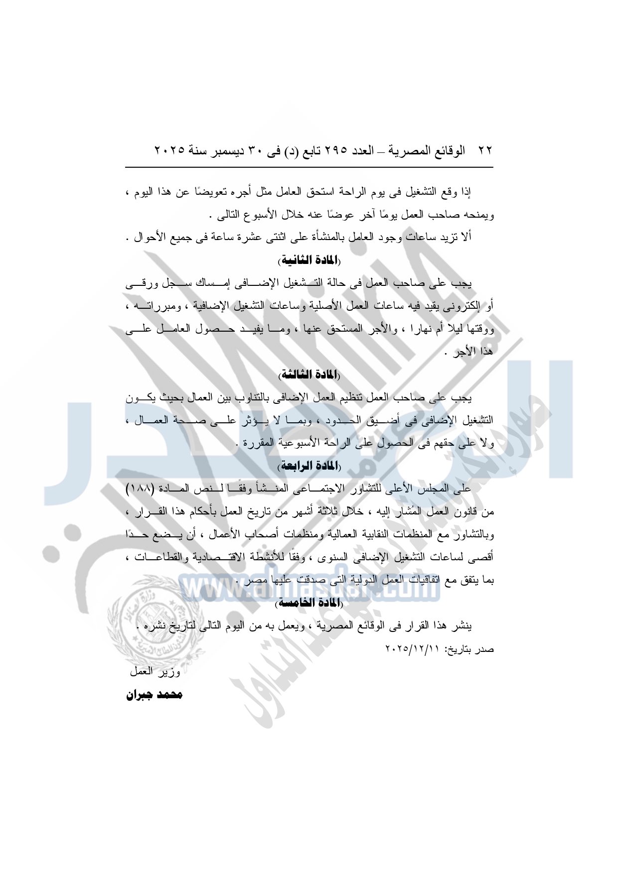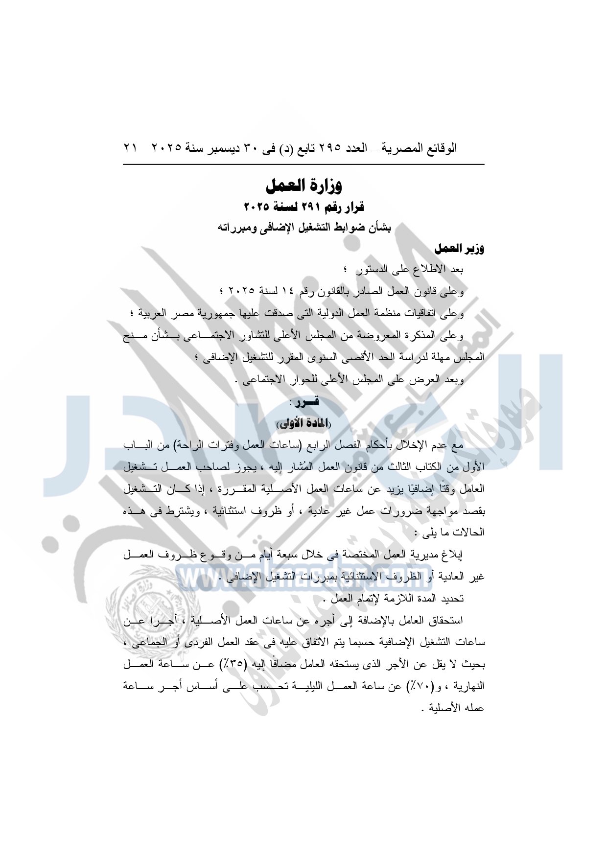 نشرت الوقائع المصرية، في العدد 295 تابع "د"، الصادر في 30 ديسمبر 2025، قرار وزارة العمل، رقم 291 لسنة 2025، بشأن ضوابط التشغيل الإضافي ومبرراته.