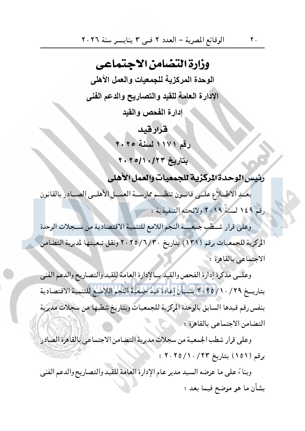 نشرت الوقائع المصرية في العدد 2، الصادر في 3 يناير 2026، قرار وزارة التضامن الاجتماعي، قيد رقم 1171 لسنة 2025، بتاريخ 23-10-2025، بشأن قيد جمعية النجم اللامع للتنمية الاقتصادية.