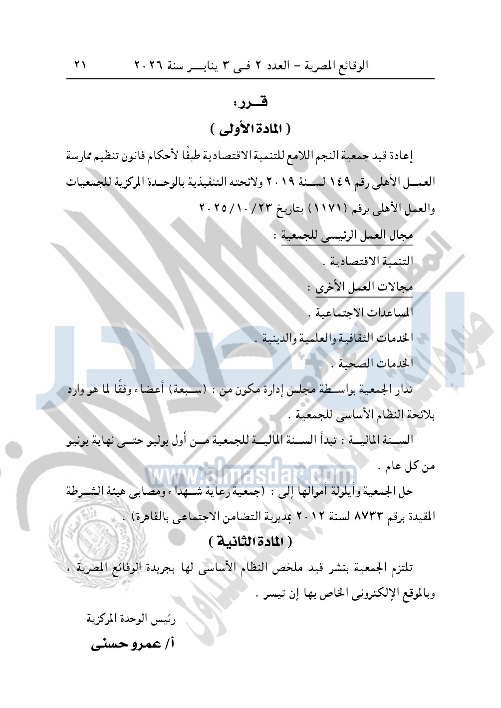 إعادة قيد جمعية النجم اللامع للتنمية الاقتصادية طبقا لأحكام قانون تنظيم ممارسة العمل الأهلى رقم 149 لسنة 2019 ولائحته التفيذية بالوحدة المركزية للجمعيات والعمل الأهلى برقم "1171" بتاريخ 23-10-2025.