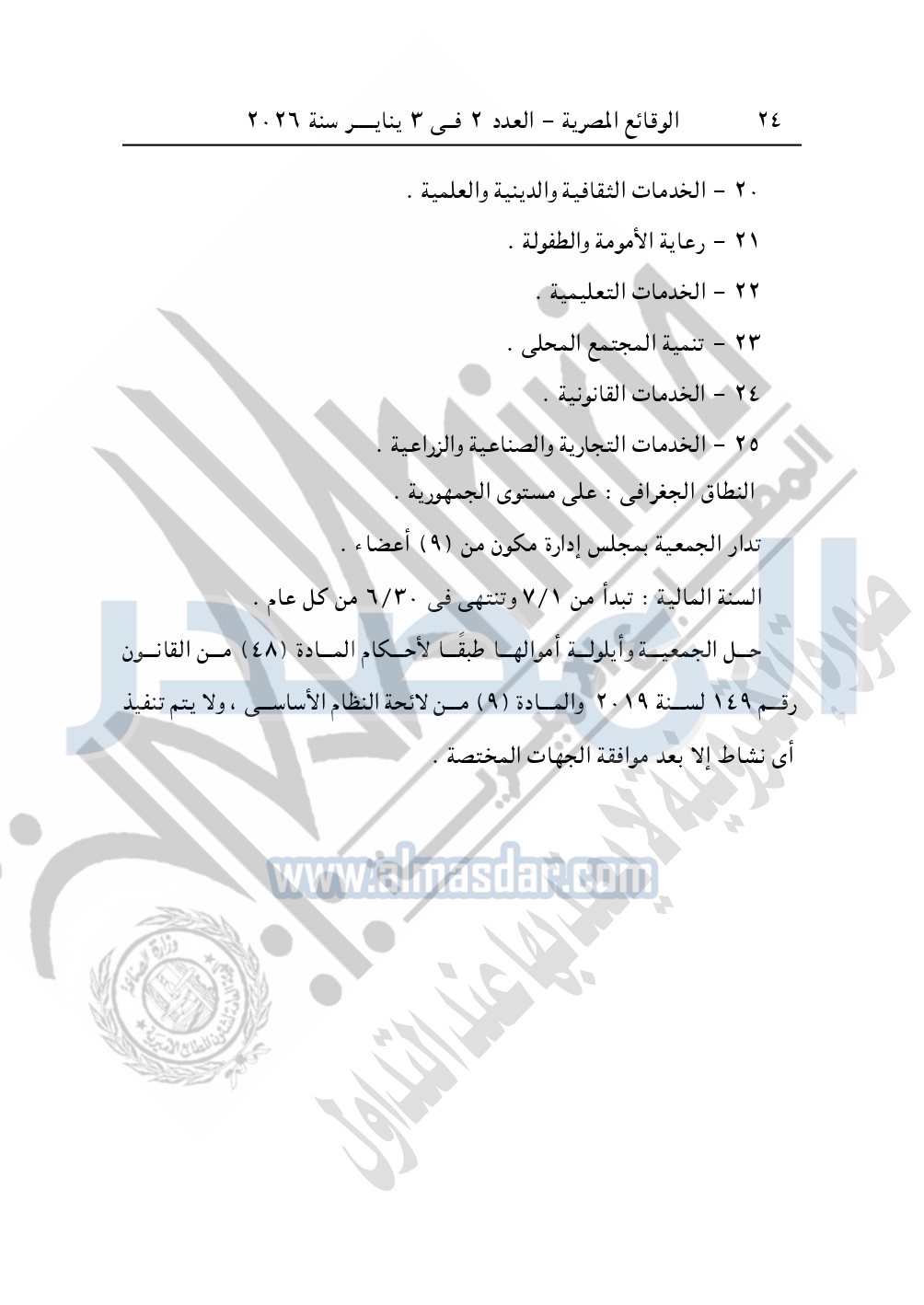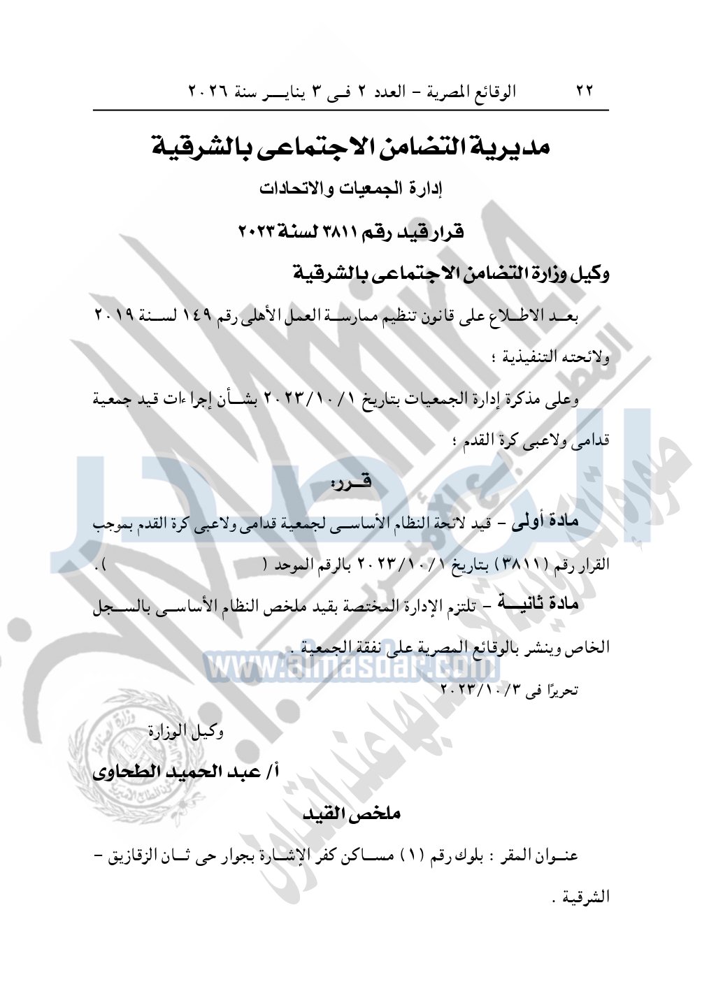 كما نشرت الوقائع المصرية في العدد 2، الصادر في 3 يناير 2026، قرار مديرية التضامن الاجتماعي بالشرقية، قيد رقم 3811 لسنة 2025، بشأن قيد جمعية قدامى ولاعبي كرة القدم.