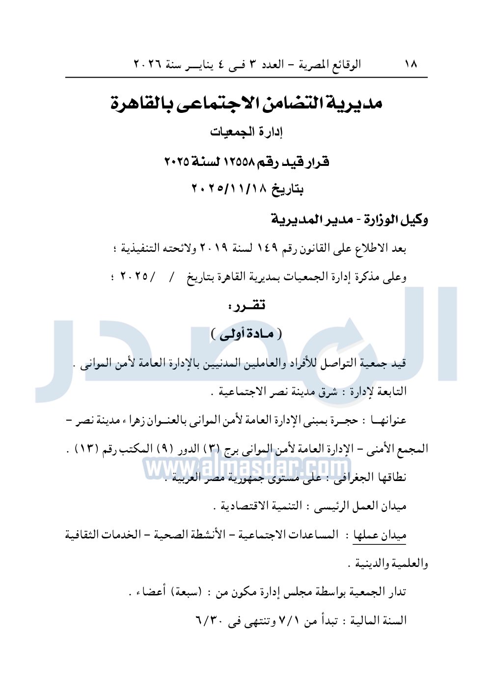 كما نشرت الوقائع المصرية في العدد 3، الصادر في 4 يناير 2026، قرار مديرية التضامن الاجتماعي بالقاهرة، قيد رقم 12558 لسنة 2025، بتاريخ 18-11-2025، بشأن قيد جمعية التواصل للأفراد والعاملين المدنيين بالإدارة العامة لأمن الموانى.