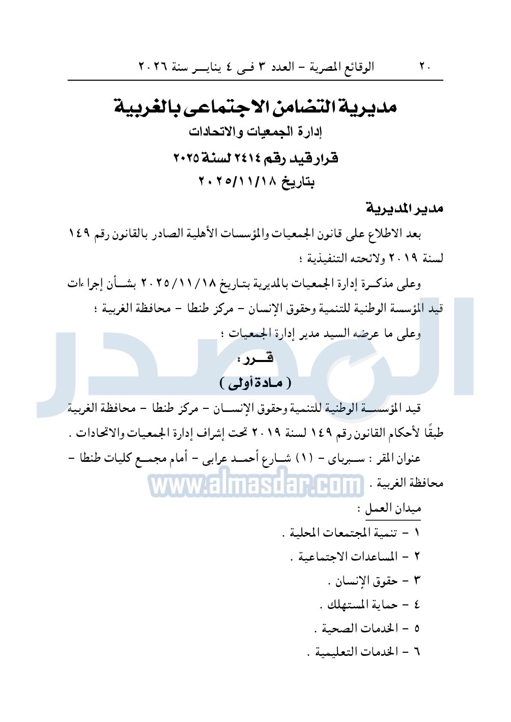 ونشرت الوقائع المصرية في العدد 3، الصادر في 4 يناير 2026، قرار مديرية التضامن الاجتماعي بالغربية، قيد رقم 2414 لسنة 2025، بتاريخ 18-11-2025، بشأن قيد مؤسسة الوطنية للتنمية وحقوق الإنسان – مركز طنطا – محافظة الغربية.