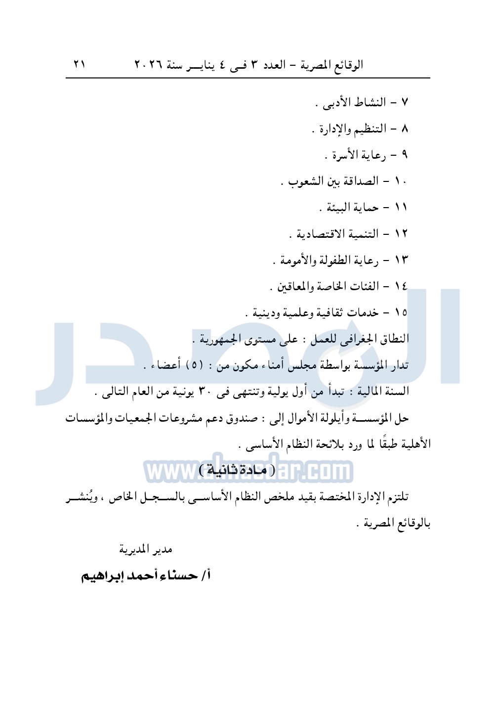 وأيضا نشرت الوقائع المصرية في العدد 2، الصادر في 3 يناير 2026، قرار مديرية التضامن الاجتماعي بالقاهرة، قيد رقم 12474 لسنة 2025، بتاريخ 13-8-2025، بشأن قيد مؤسسة روعة الفن للفنون والتراث.