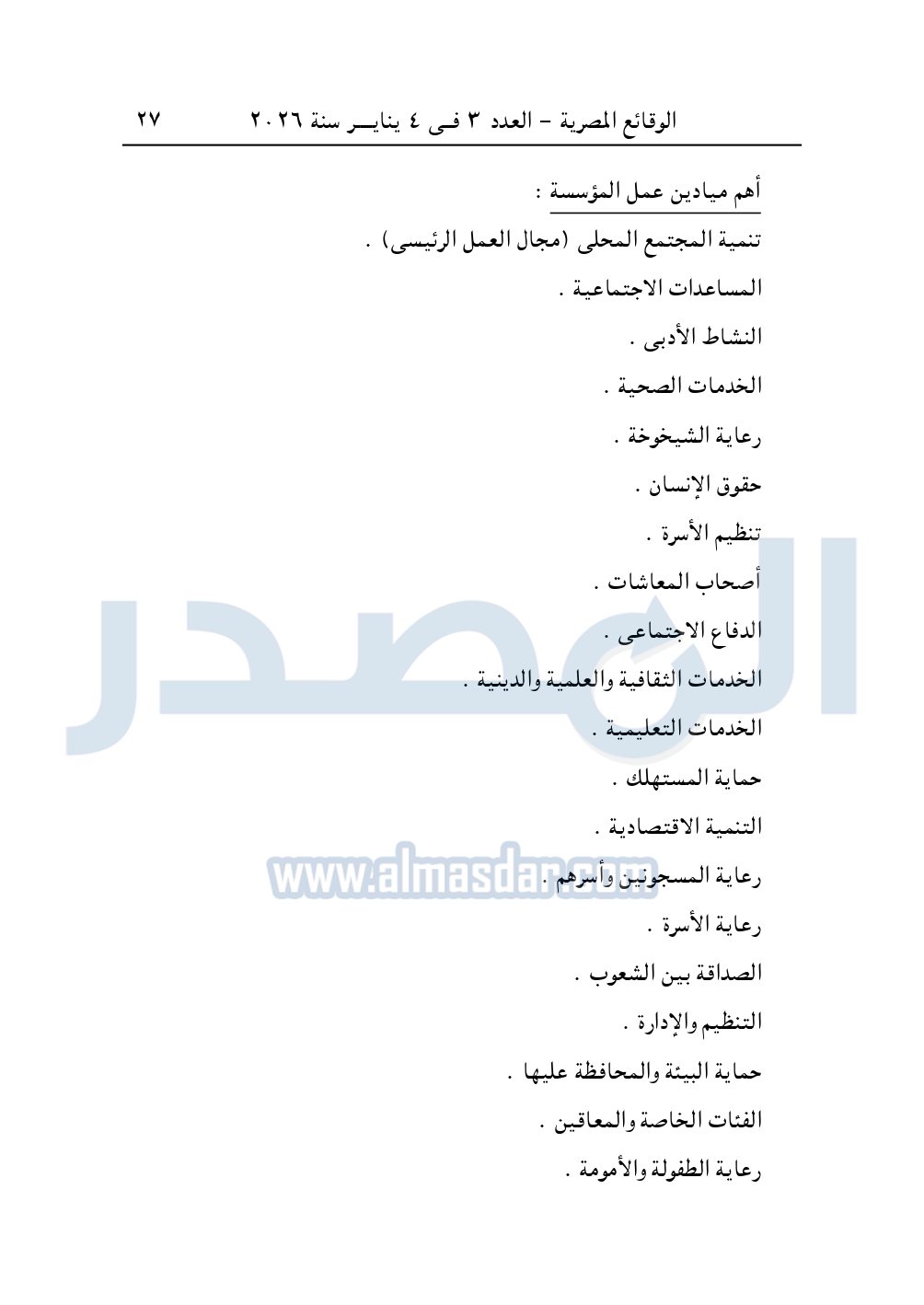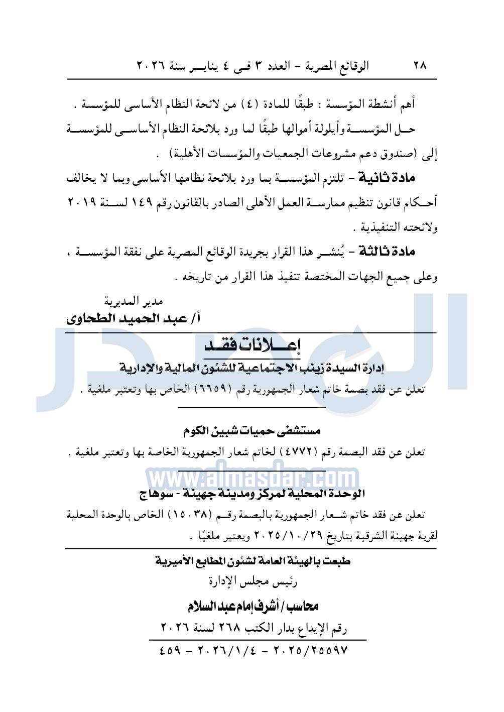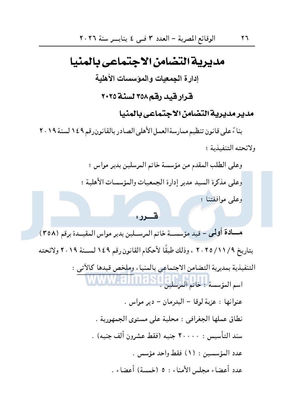 كما الوقائع المصرية في العدد 3، الصادر في 4 يناير 2026، قرار مديرية التضامن الاجتماعي بالمنيا، قيد رقم 358 لسنة 2025، بشأن قيد مؤسسة خاتم المرسلين بدير مواس.