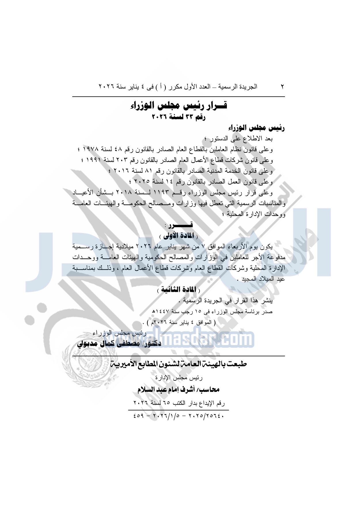 أصدر الدكتور مصطفى مدبولي، رئيس مجلس الوزراء، قرارًا بأن يكون يوم الأربعاء المقبل، الموافق 7 يناير 2026، إجازة رسمية مدفوعة الأجر.