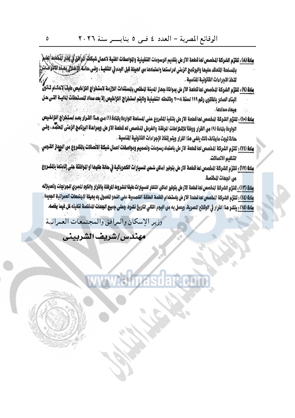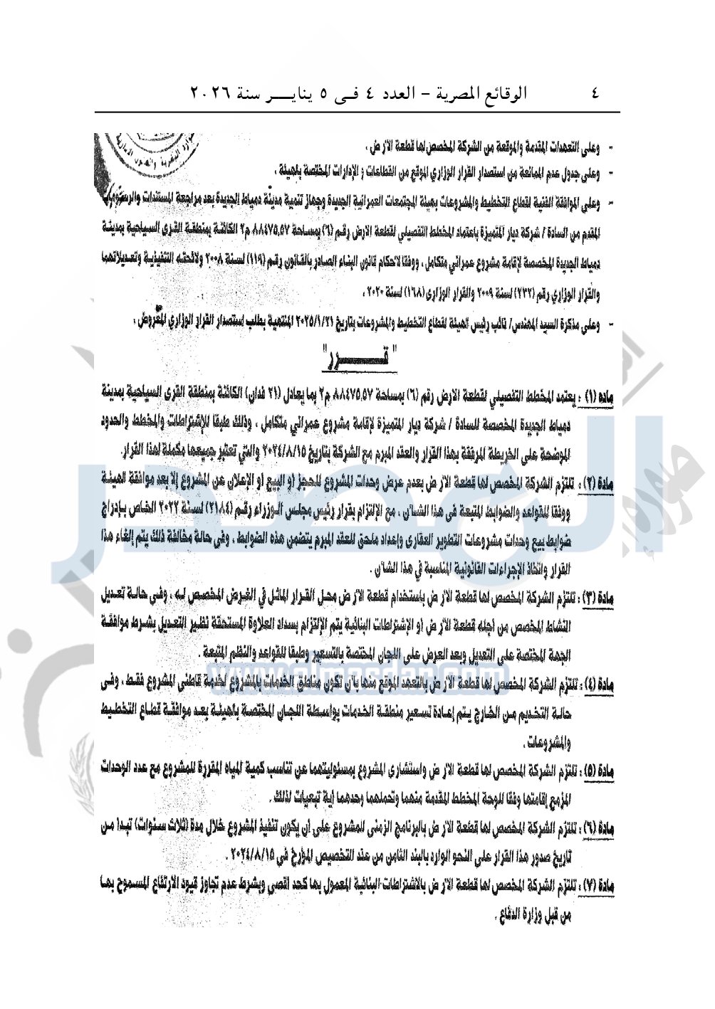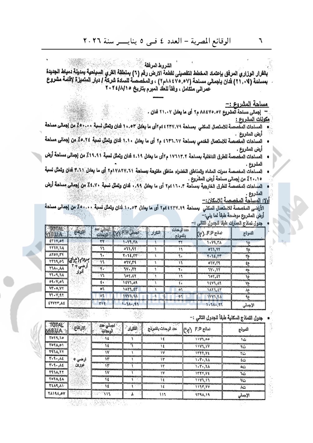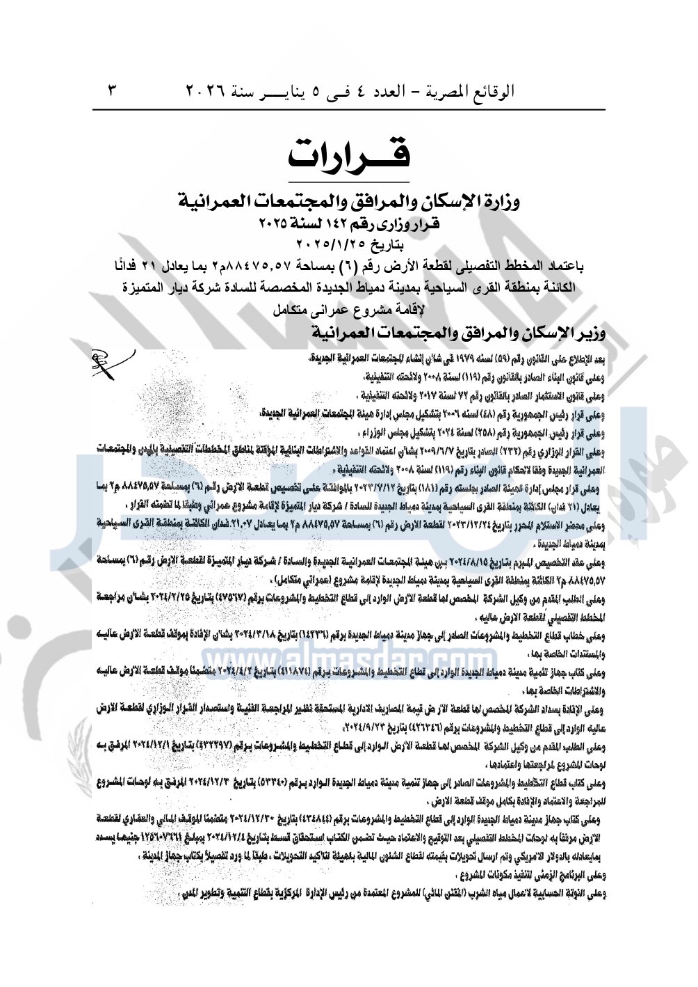 نشرت الوقائع المصرية، في العدد 4، الصادر في 5 يناير سنة 2026، قرار وزارة الإسكان والمرافق والمجتمعات العمرانية قرار وزاري رقم 142 لسنة 2025، بتاريخ 25-1-2025، بشأن اعتماد المخطط التفصيلي لقطعة الأرض رقم "6" بمساحة 88475.57م2 بما يعادل 21 فدانا الكائنة بمنطقة القرى السياحية بمدينة دمياط الجديدة المخصصة لشركة ديار المتميزة لإقامة مشروع عمراني متكامل.