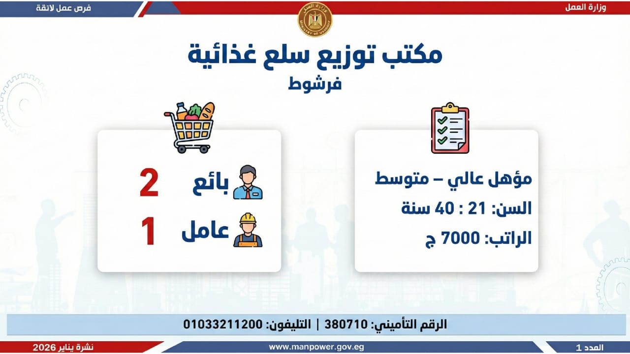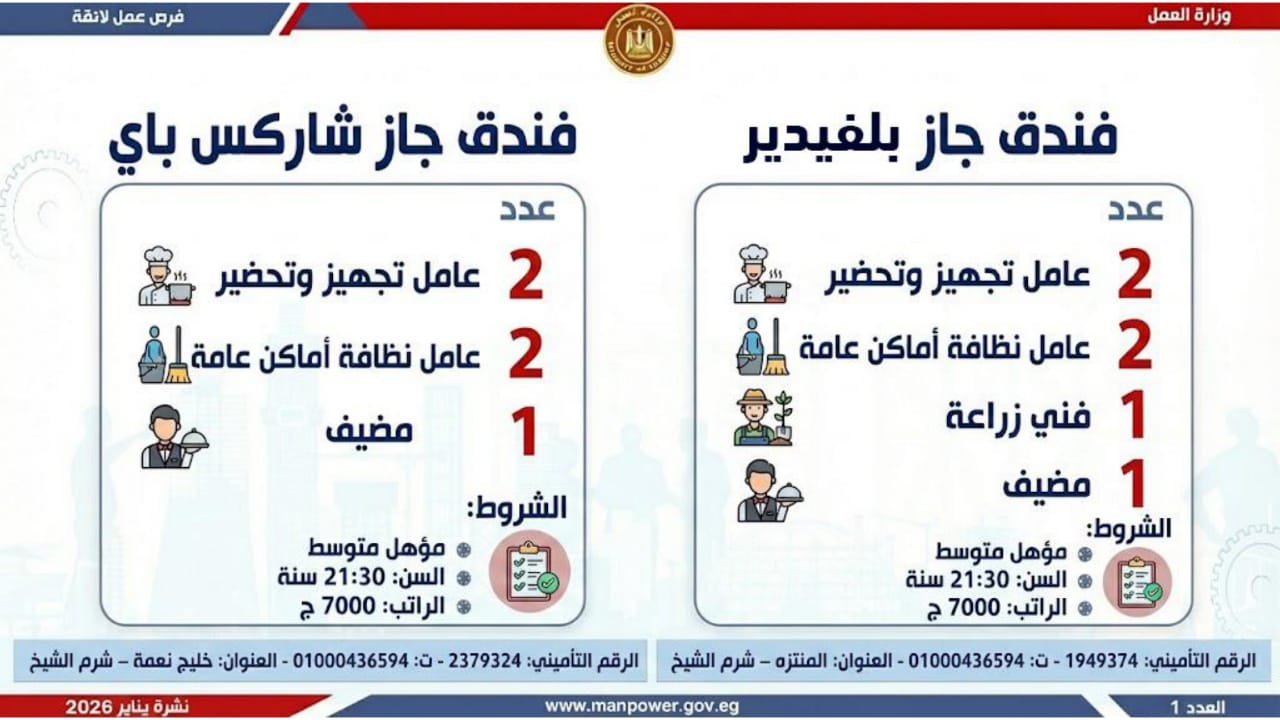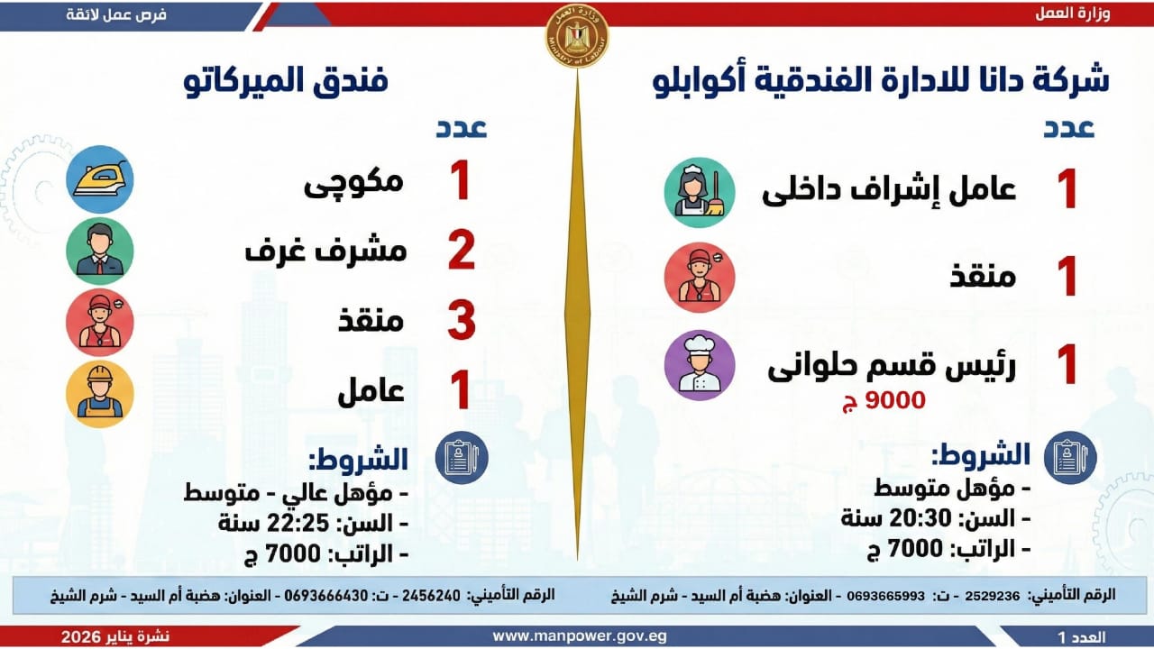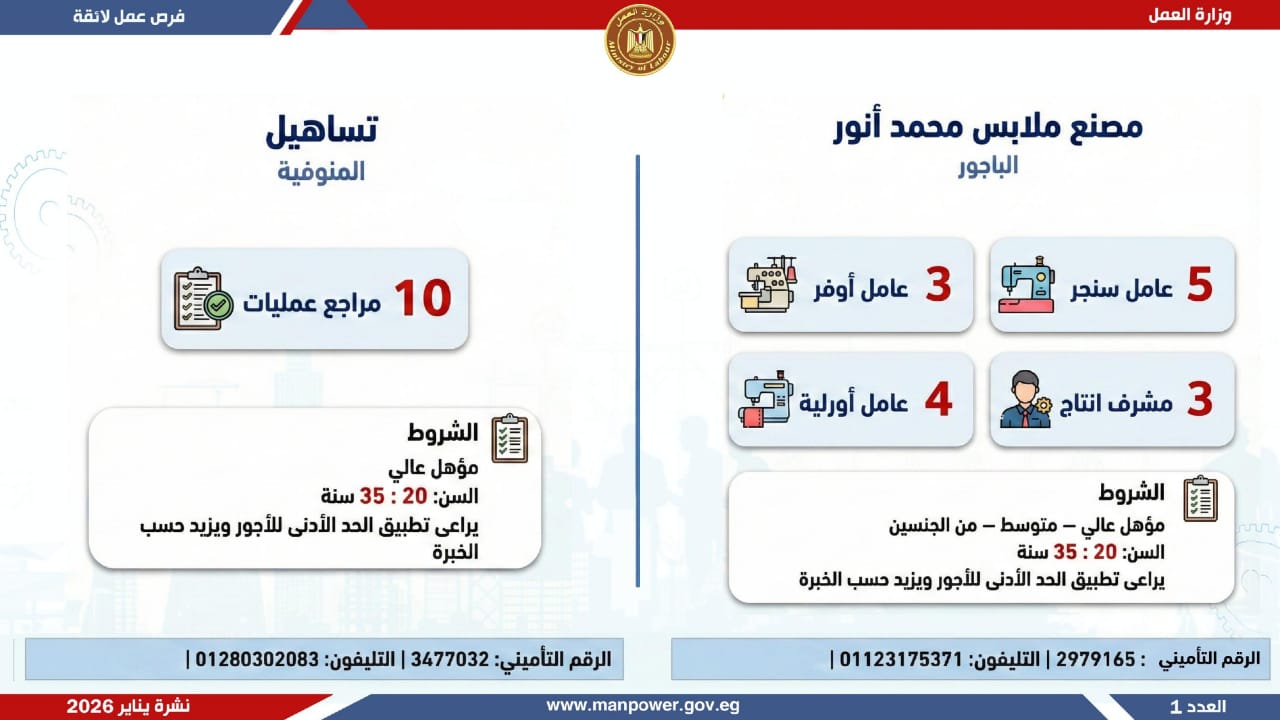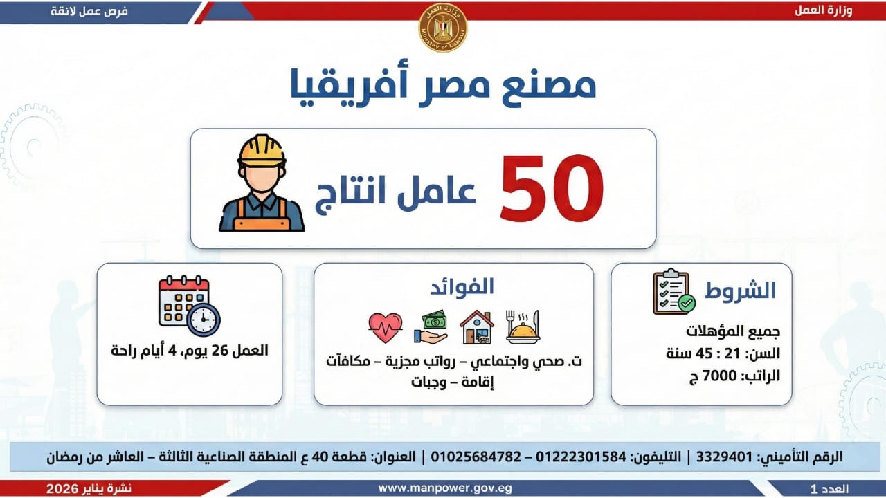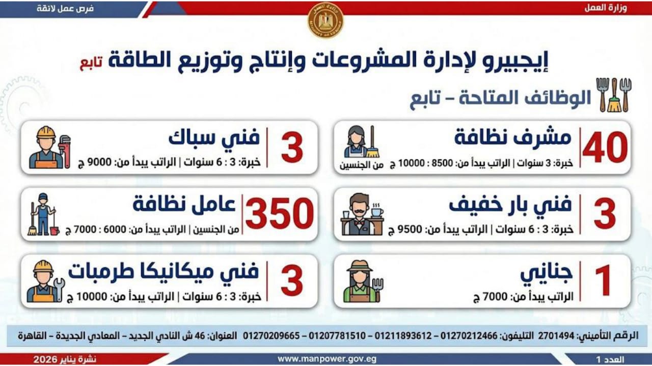 وأشارت الوزارة، إلى أن التقديم على هذه الفرص يتم خلال شهر يناير 2026، من خلال الإدارة العامة للتشغيل بمقر الوزارة القديم بمدينة نصر، أو عبر مديريات العمل بالمحافظات، كما يمكن التقديم مباشرة من خلال بيانات الشركات المرفقة بالنشرة، أو عبر الموقع الرسمي لوزارة العمل على شبكة الإنترنت.