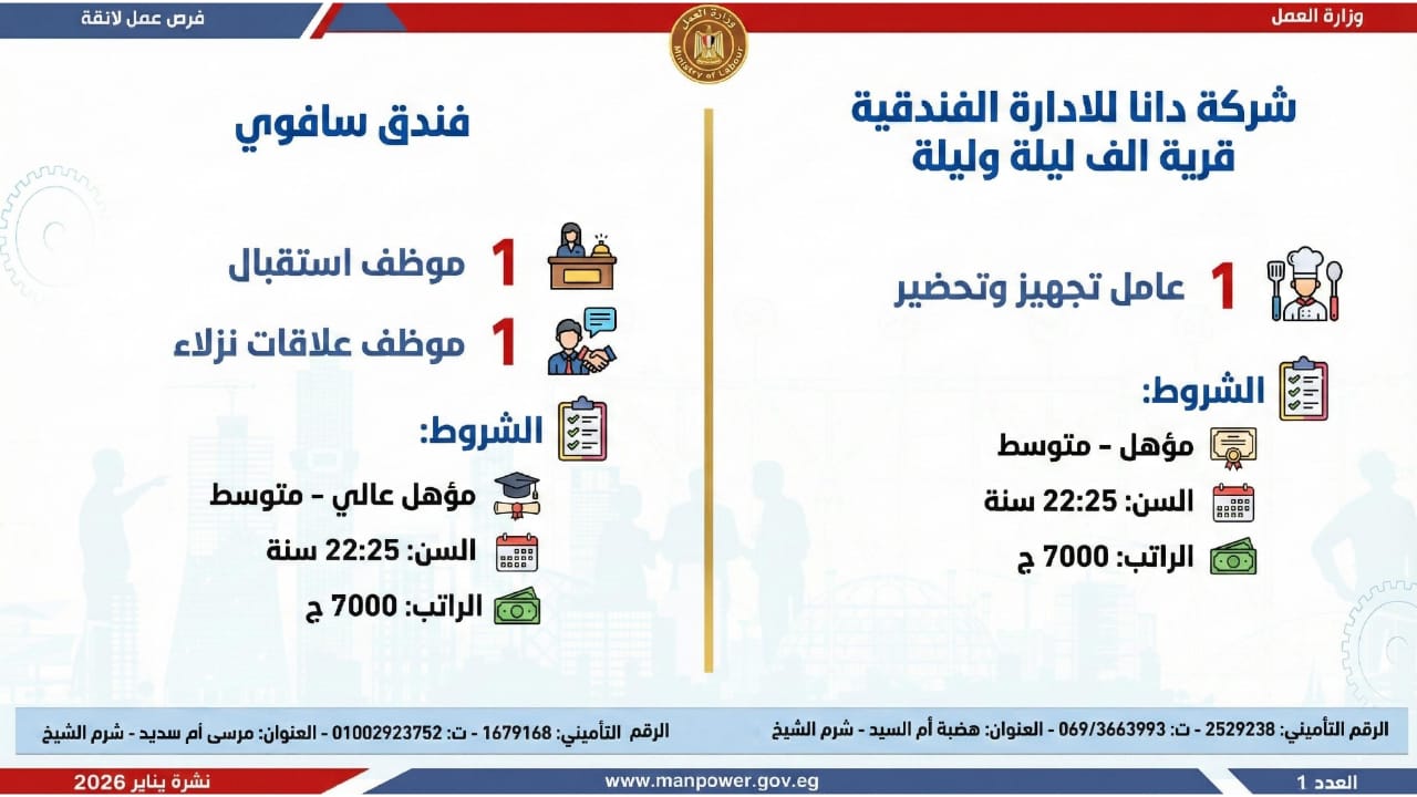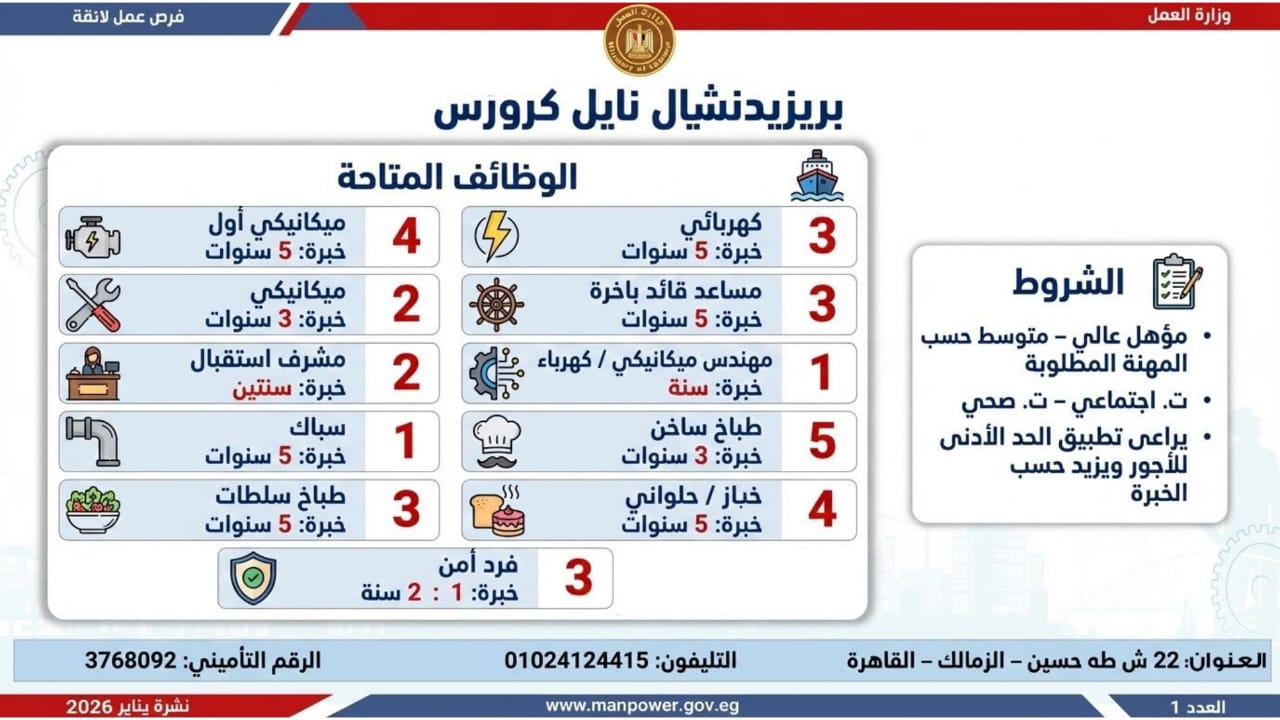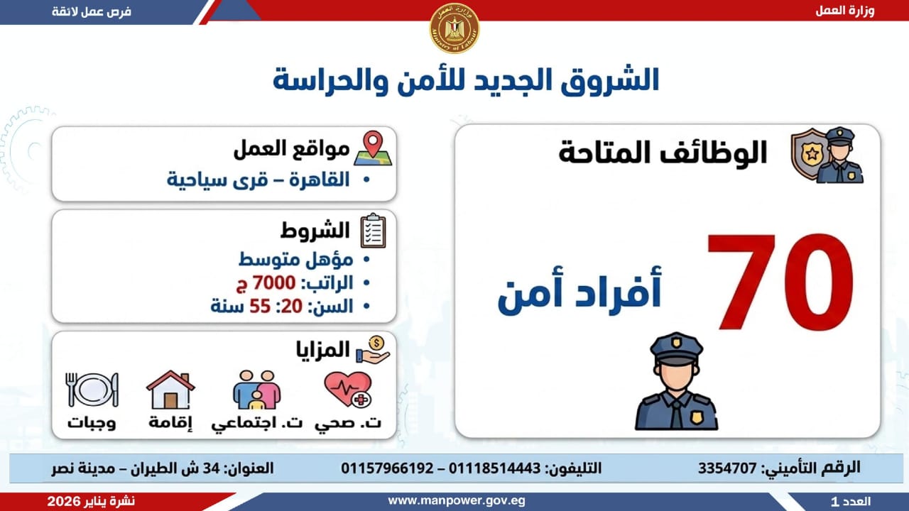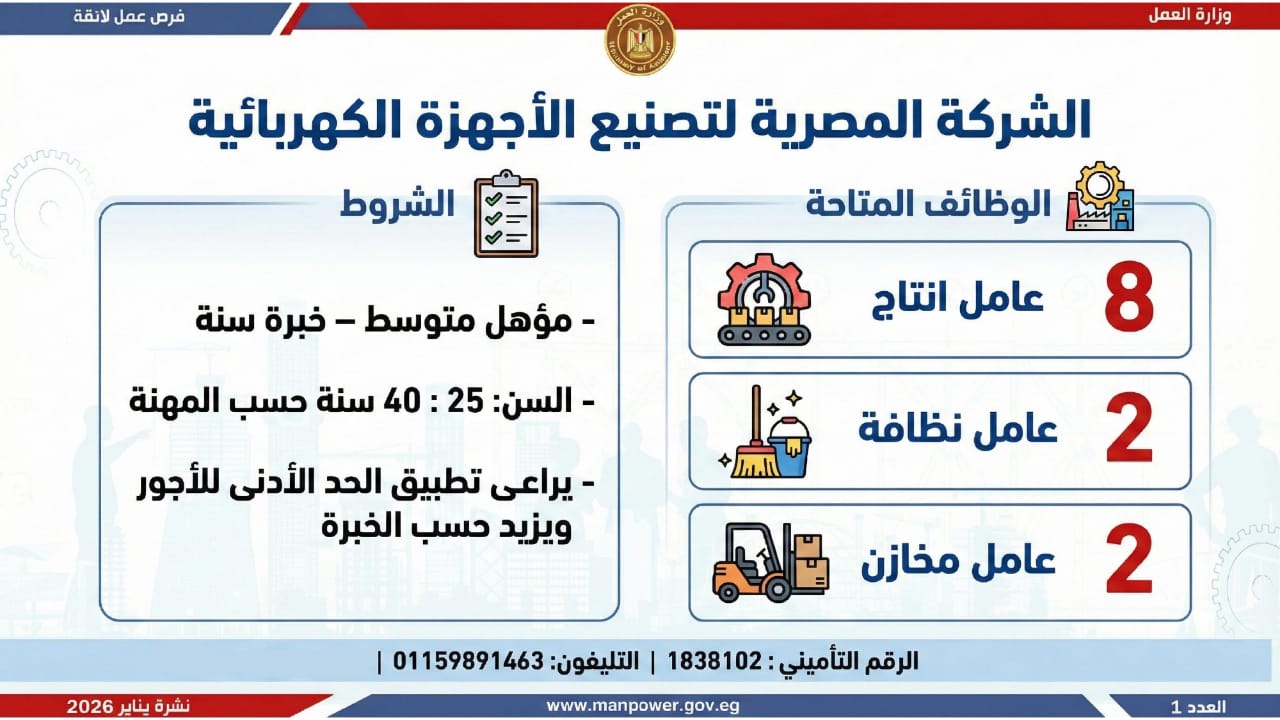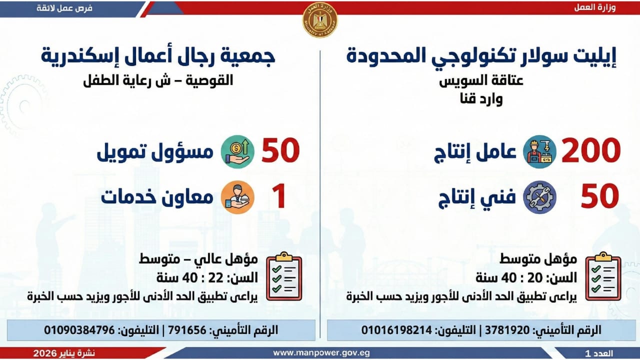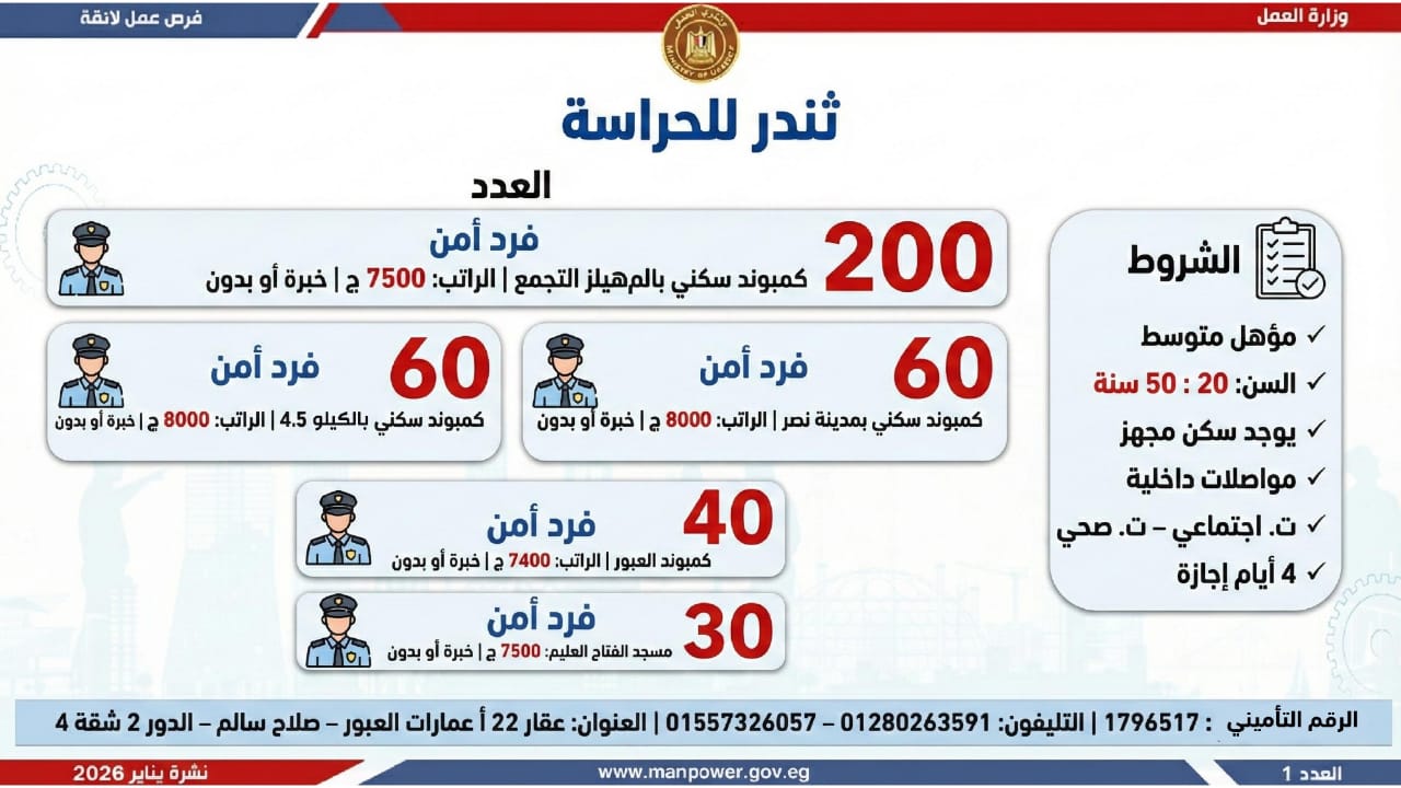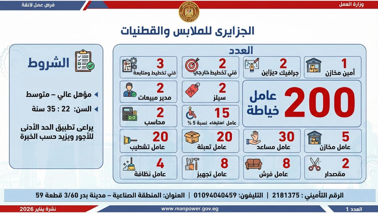 وأشارت الوزارة، إلى أن التقديم على هذه الفرص يتم خلال شهر يناير 2026، من خلال الإدارة العامة للتشغيل بمقر الوزارة القديم بمدينة نصر، أو عبر مديريات العمل بالمحافظات، كما يمكن التقديم مباشرة من خلال بيانات الشركات المرفقة بالنشرة، أو عبر الموقع الرسمي لوزارة العمل على شبكة الإنترنت.