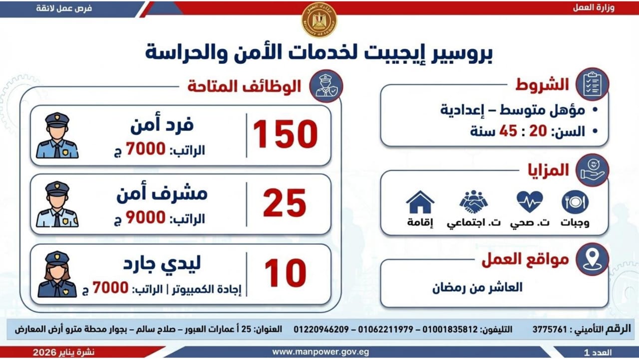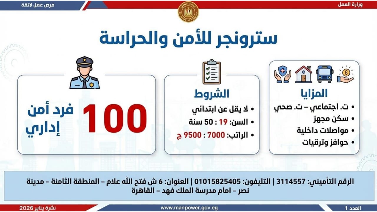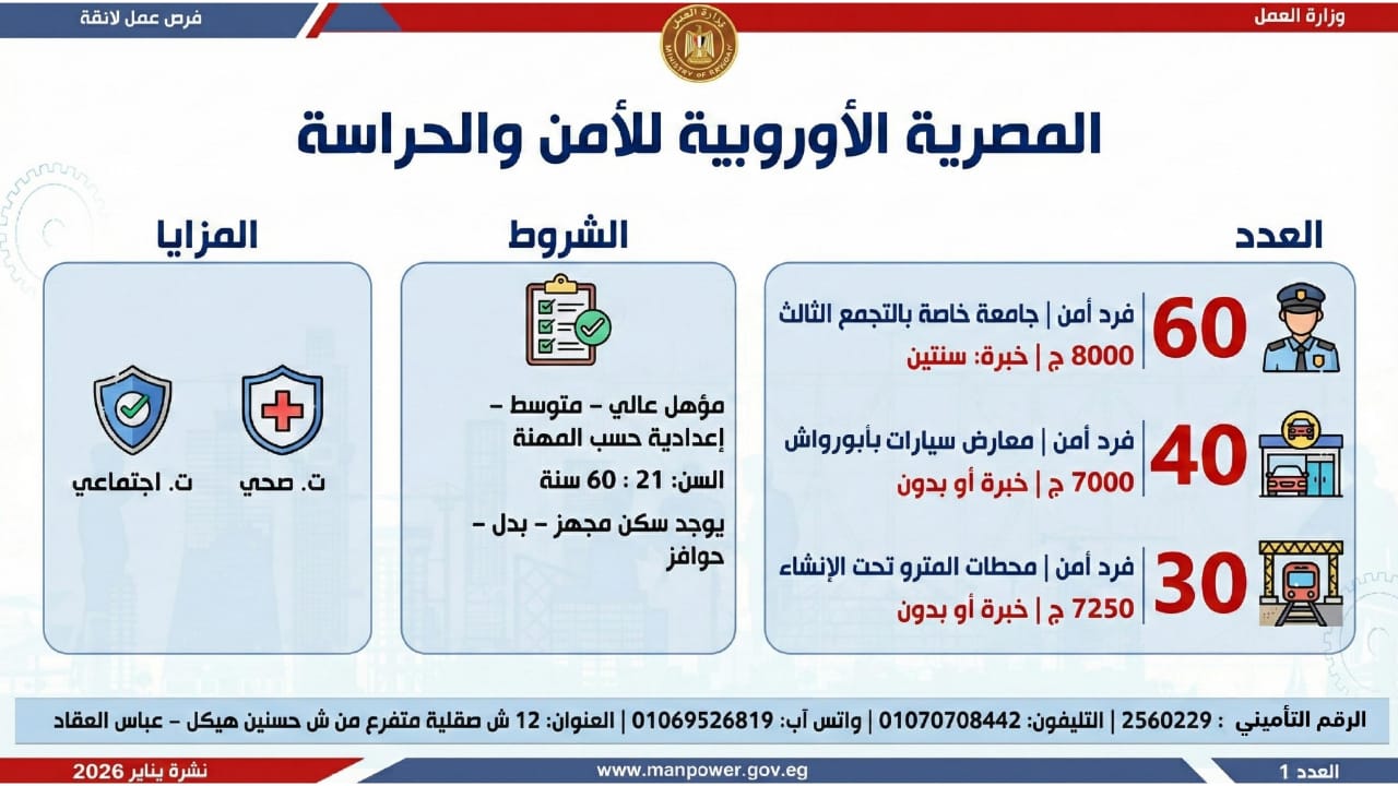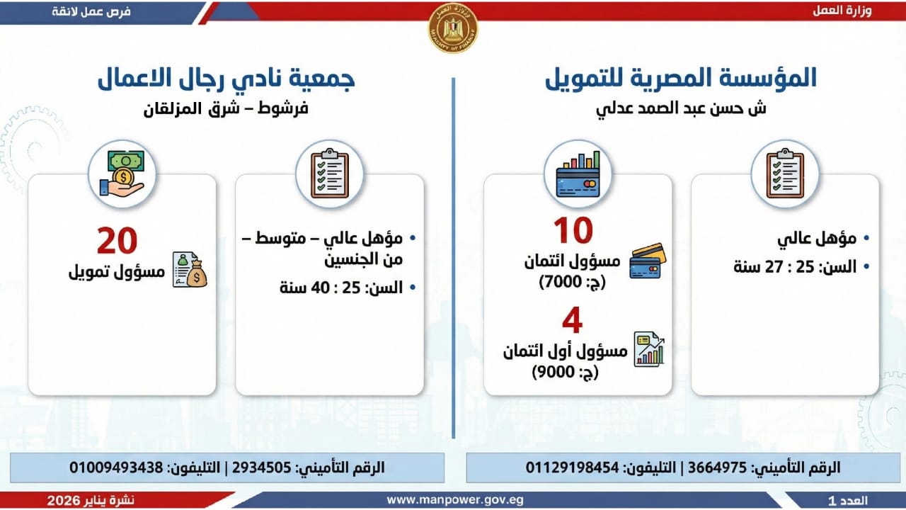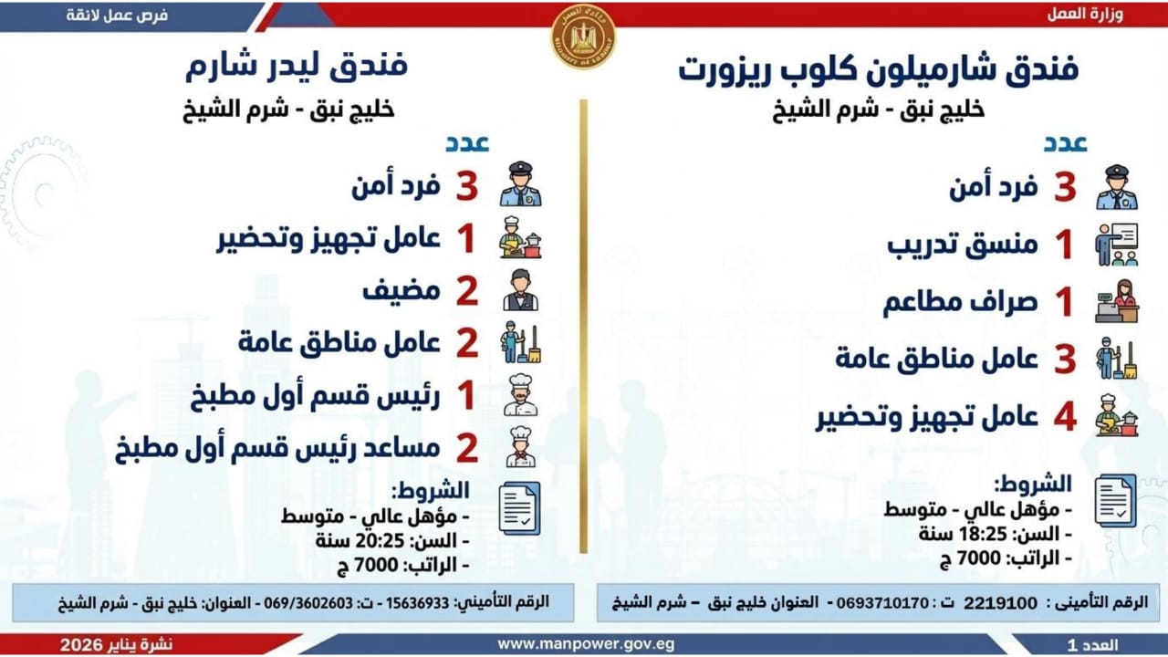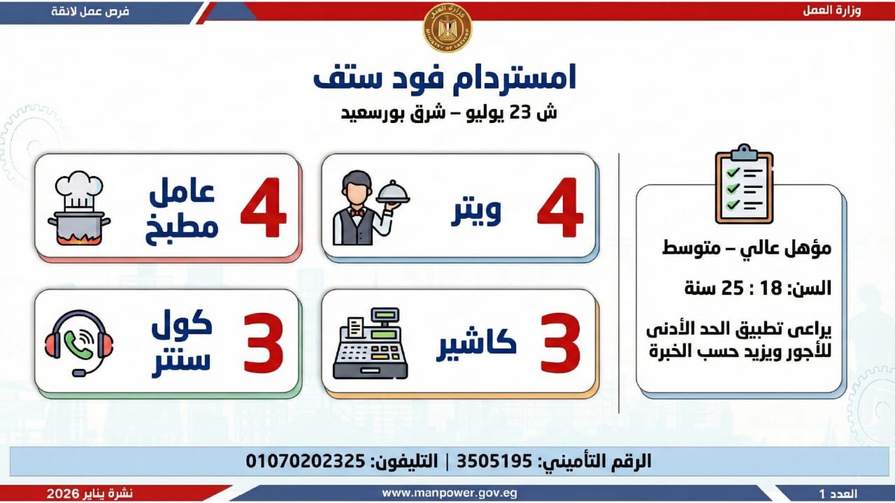 وأشارت الوزارة، إلى أن التقديم على هذه الفرص يتم خلال شهر يناير 2026، من خلال الإدارة العامة للتشغيل بمقر الوزارة القديم بمدينة نصر، أو عبر مديريات العمل بالمحافظات، كما يمكن التقديم مباشرة من خلال بيانات الشركات المرفقة بالنشرة، أو عبر الموقع الرسمي لوزارة العمل على شبكة الإنترنت.