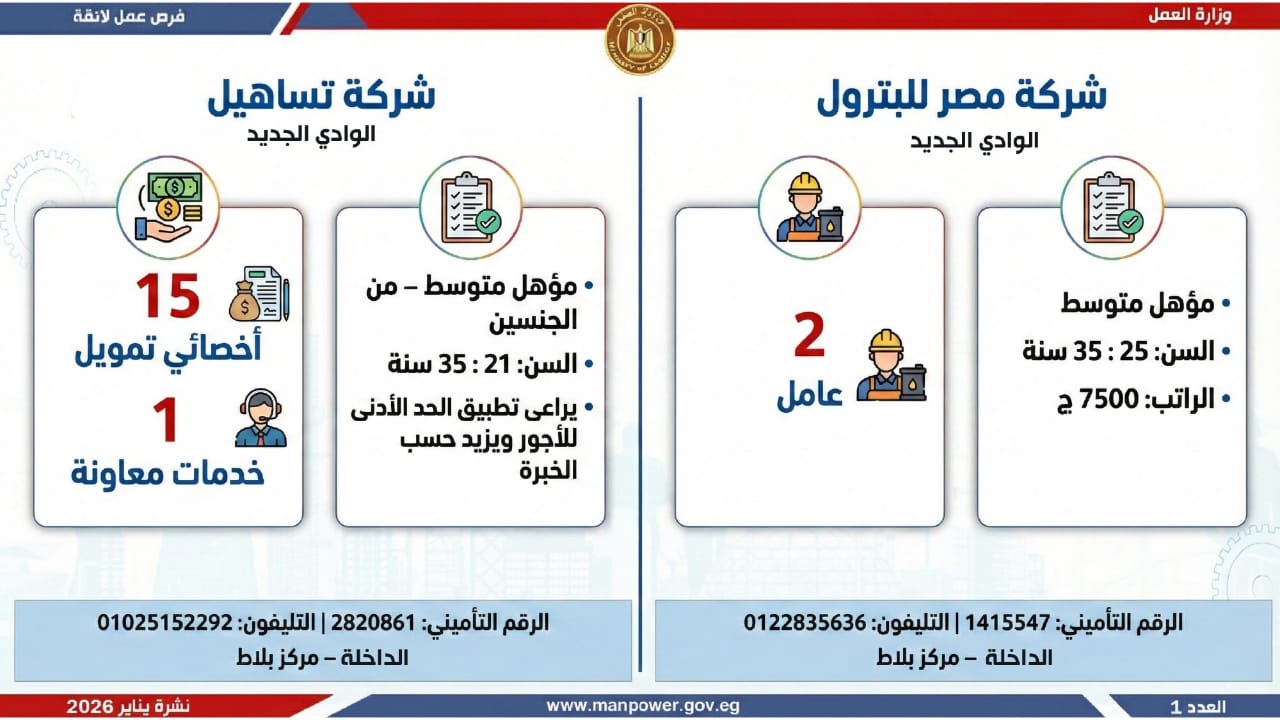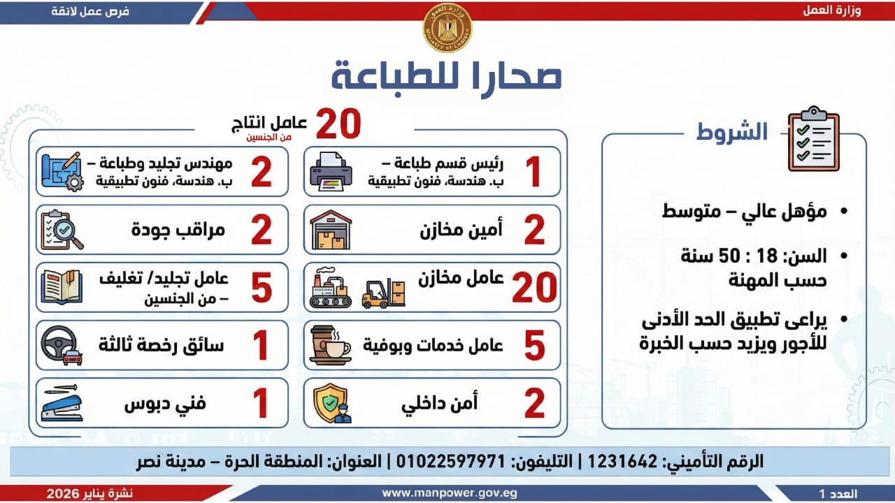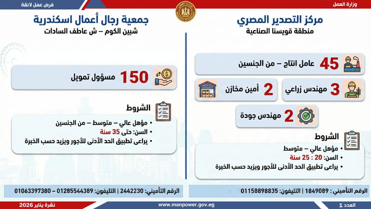 وتشمل النشرة الحالية فرص عمل متاحة في محافظات القاهرة، الجيزة، المنوفية، الغربية، المنيا، أسيوط، قنا، الوادي الجديد، أسيوط، المنيا، الشرقية، وجنوب سيناء.