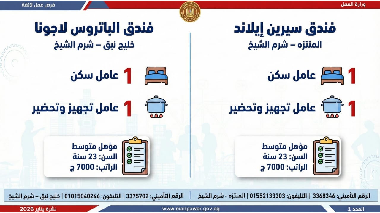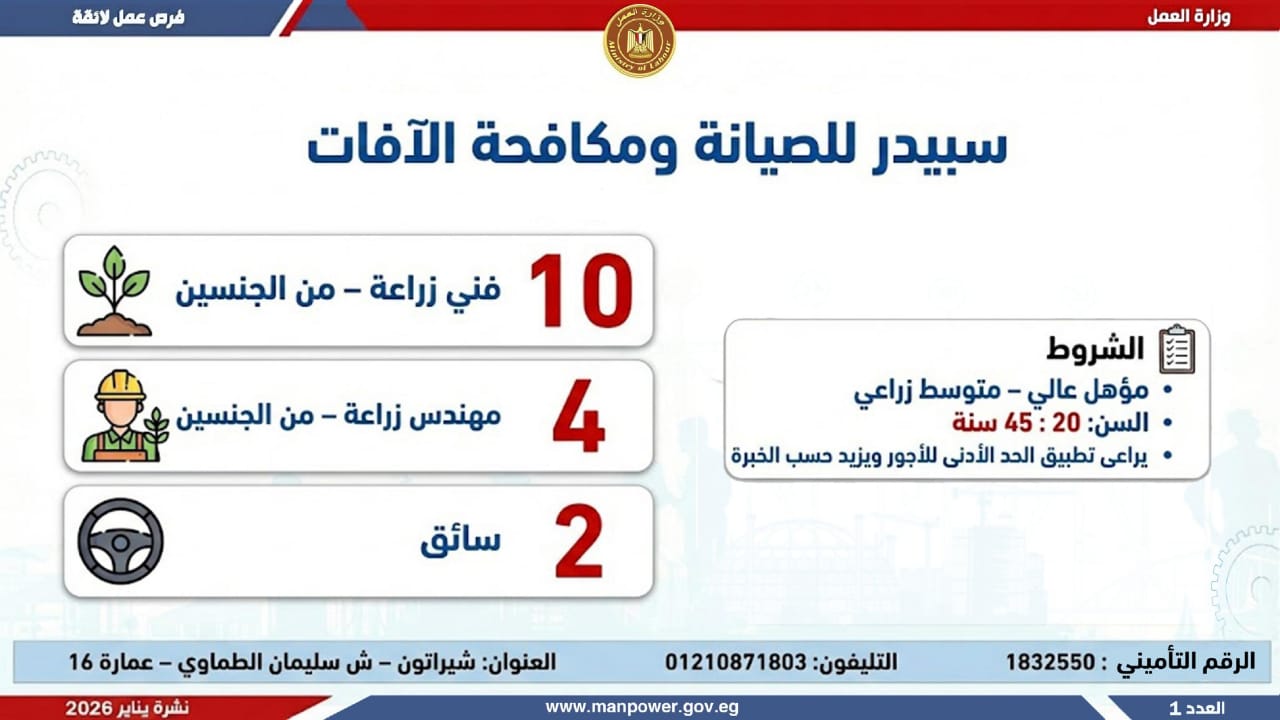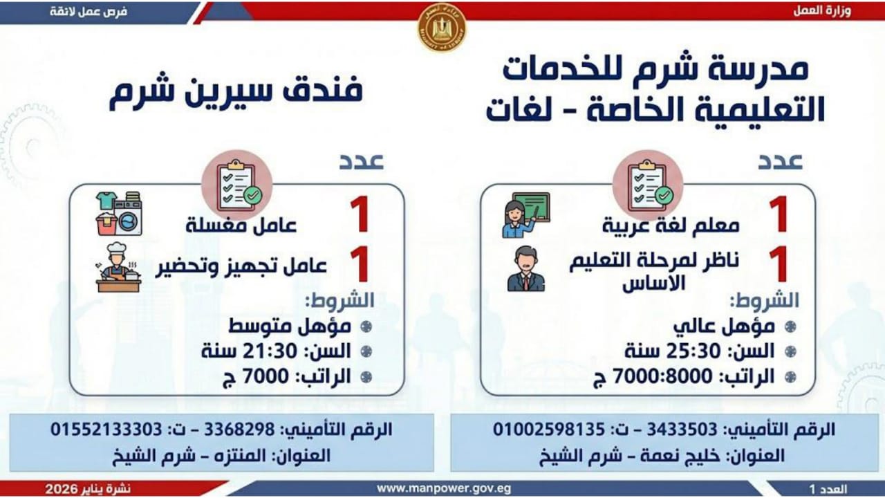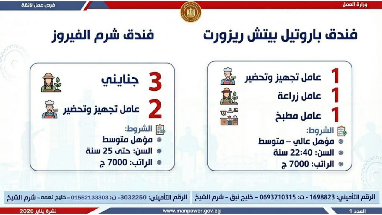 وتشمل النشرة الحالية فرص عمل متاحة في محافظات القاهرة، الجيزة، المنوفية، الغربية، المنيا، أسيوط، قنا، الوادي الجديد، أسيوط، المنيا، الشرقية، وجنوب سيناء.