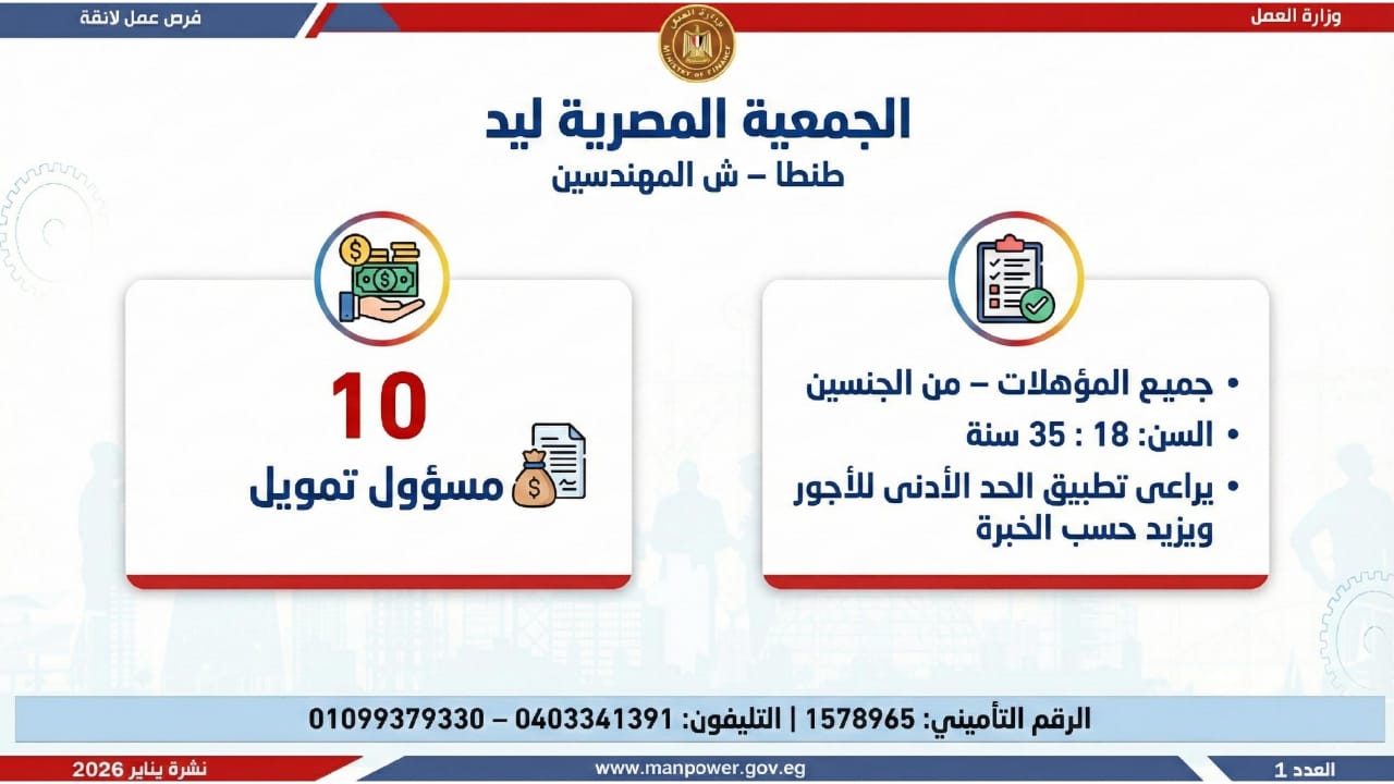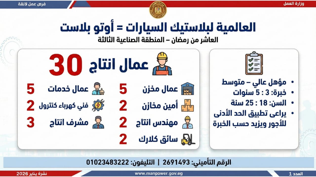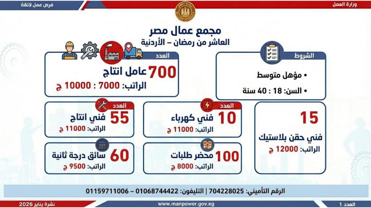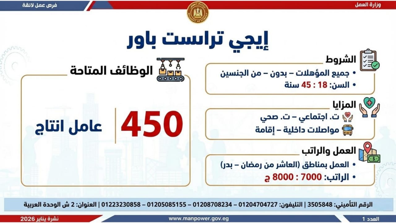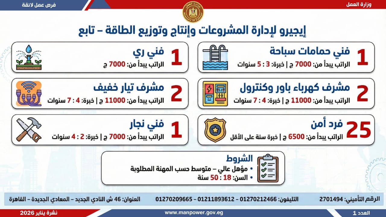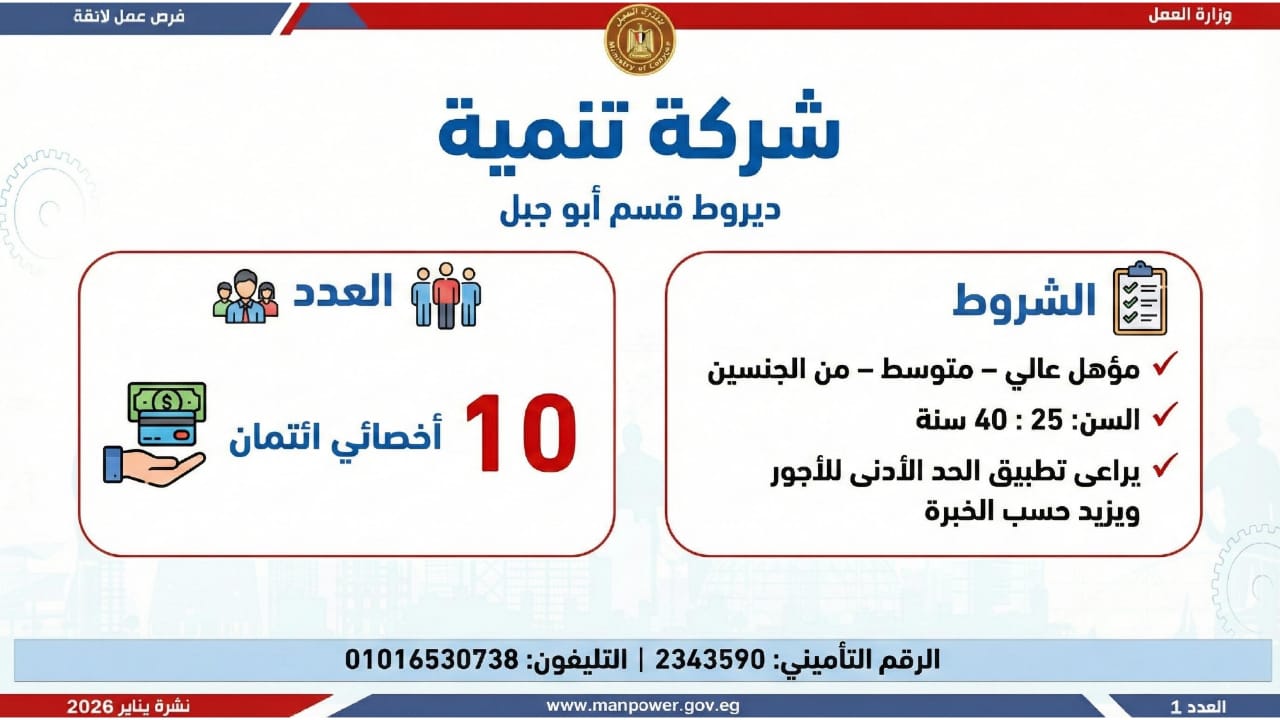 أعلن محمد جبران، وزير العمل، اليوم الأثنين، عن إصدار نشرة التوظيف نصف الشهرية، والتي تتضمن فرص عمل جديدة متاحة في عدد من المحافظات، وذلك بالتعاون بين وزارة العمل وشركات القطاع الخاص، في إطار جهود الدولة المستمرة لتوفير فرص عمل لائقة للشباب، وتنفيذًا لتوجيهات القيادة السياسية بدمج مختلف فئات المجتمع في سوق العمل، وعلى رأسهم ذوو الهمم.