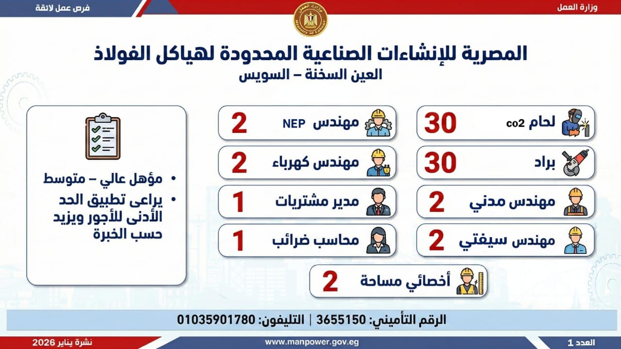 وأكدت، أن النشرة تتضمن عددًا من الوظائف المخصصة لذوي الهمم، تنفيذًا لأحكام القانون رقم 10 لسنة 2018 بشأن حقوق الأشخاص ذوي الإعاقة، والذي يُلزم المنشآت بتخصيص نسبة 5% من إجمالي العاملين بها لهذه الفئة، وذلك في إطار خطة الوزارة لحصر وتدريب وتشغيل ذوي الهمم ودمجهم في سوق العمل، تنفيذًا لتوجيهات فخامة الرئيس عبدالفتاح السيسي، رئيس الجمهورية، بتمكينهم اقتصاديًا ومجتمعيًا، وتوفير فرص عمل لائقة تحقق لهم الدمج المستدام.