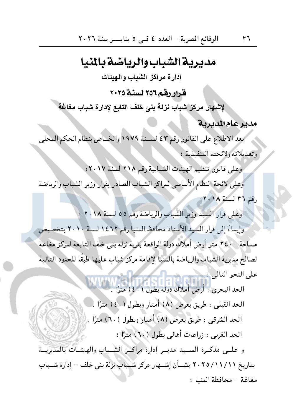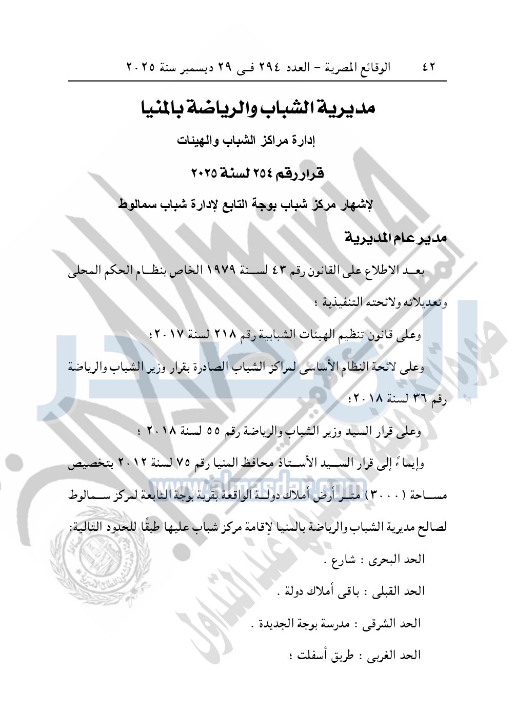 كما نشرت الوقائع المصرية في العدد 294، بتاريخ 29 ديسمبر 2025، قرار مديرية الشباب والرياضة بالمنيا، قرار إشهار رقم 254 لسنة 2025، بشأن الموافقة على إشهار مركز شباب بوجة التابع لإدارة شباب سمالوط.